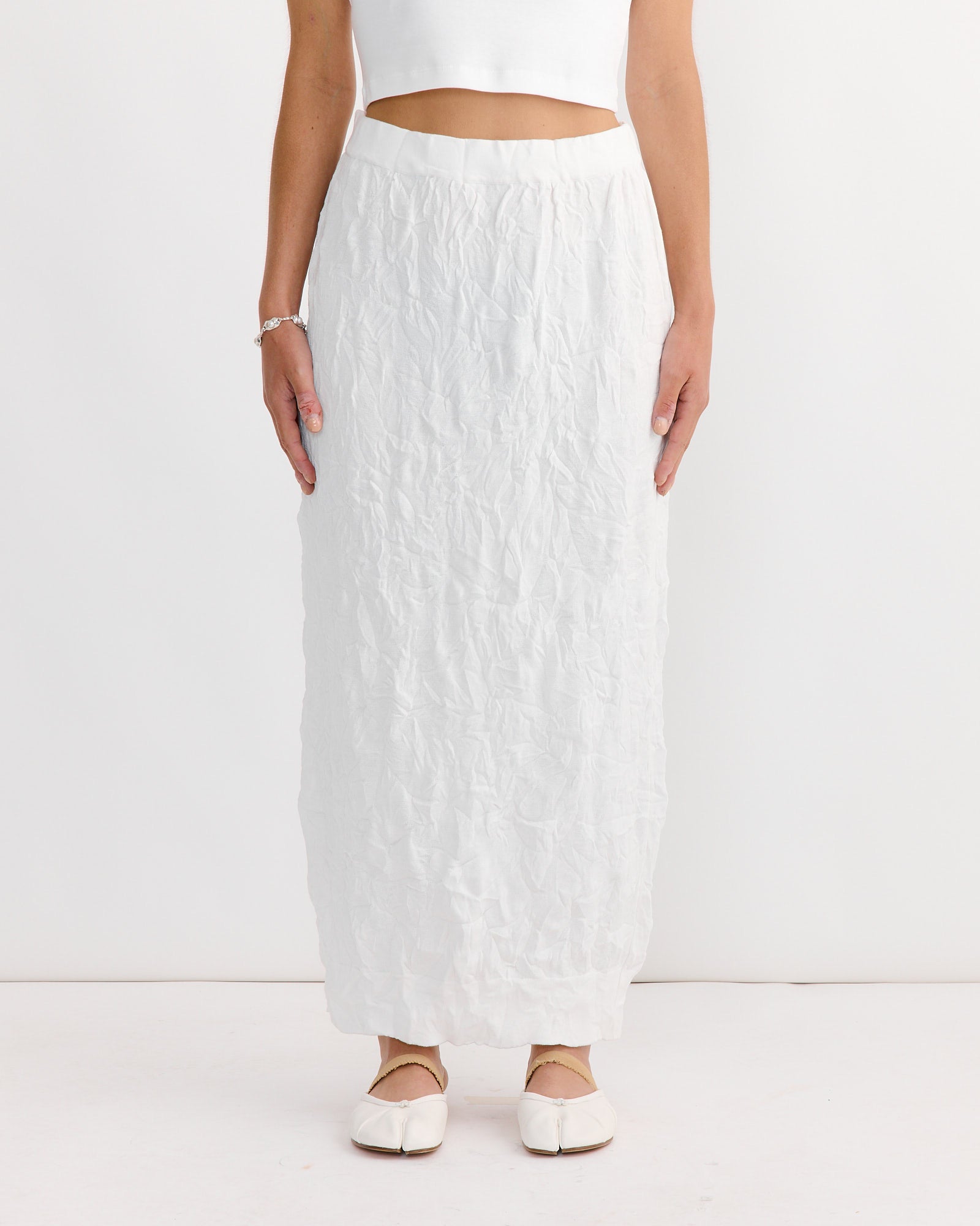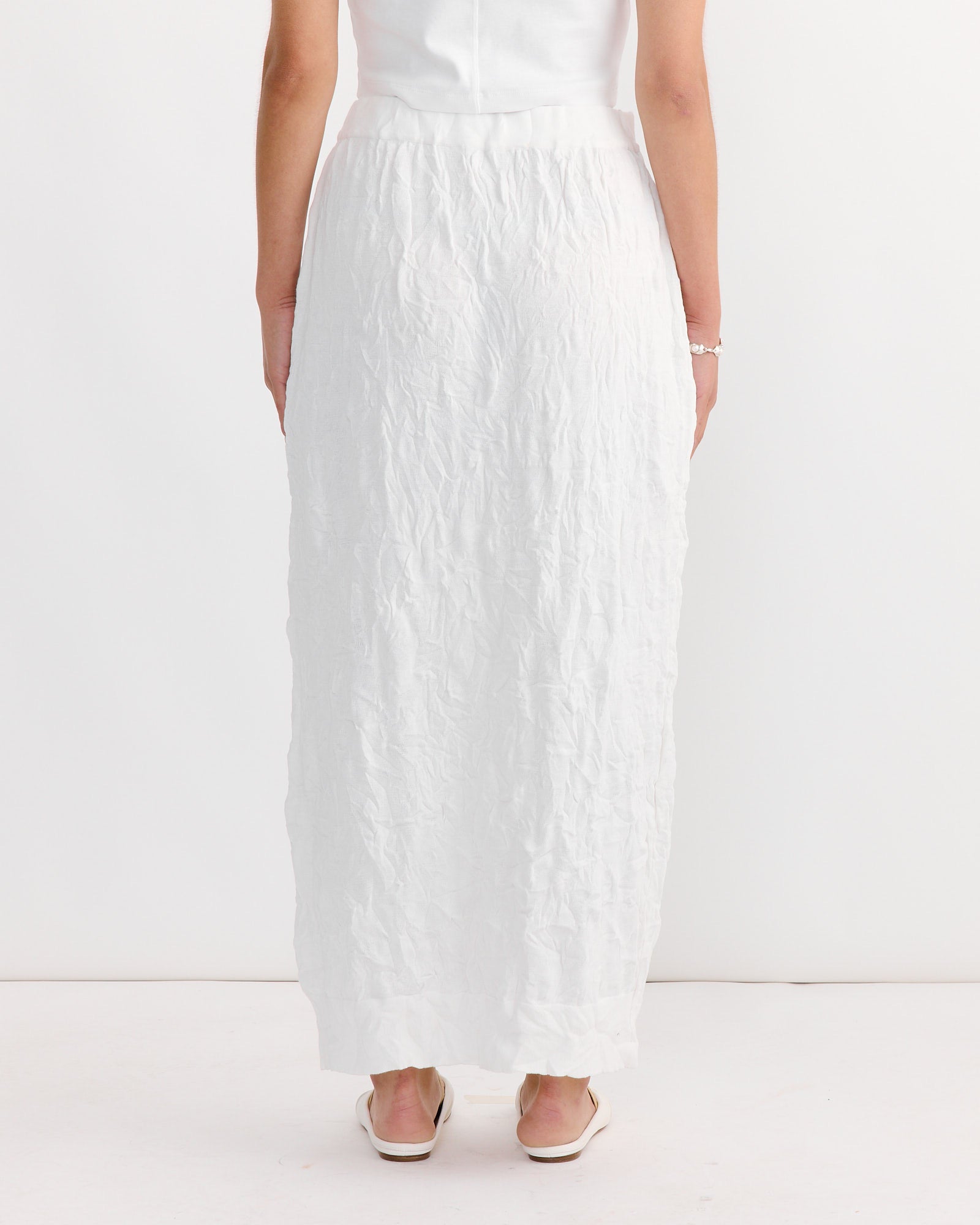 The Black Crane Crinkled Knit Skirt in White features a relaxed silhouette with an elasticized waist for an easy fit. Made from a blend of organic cotton and recycled polyester, the fabric is treated with a water-repellent finish and has a signature crinkled texture throughout. Lightweight and textural, this style is designed to hold its shape with minimal care.