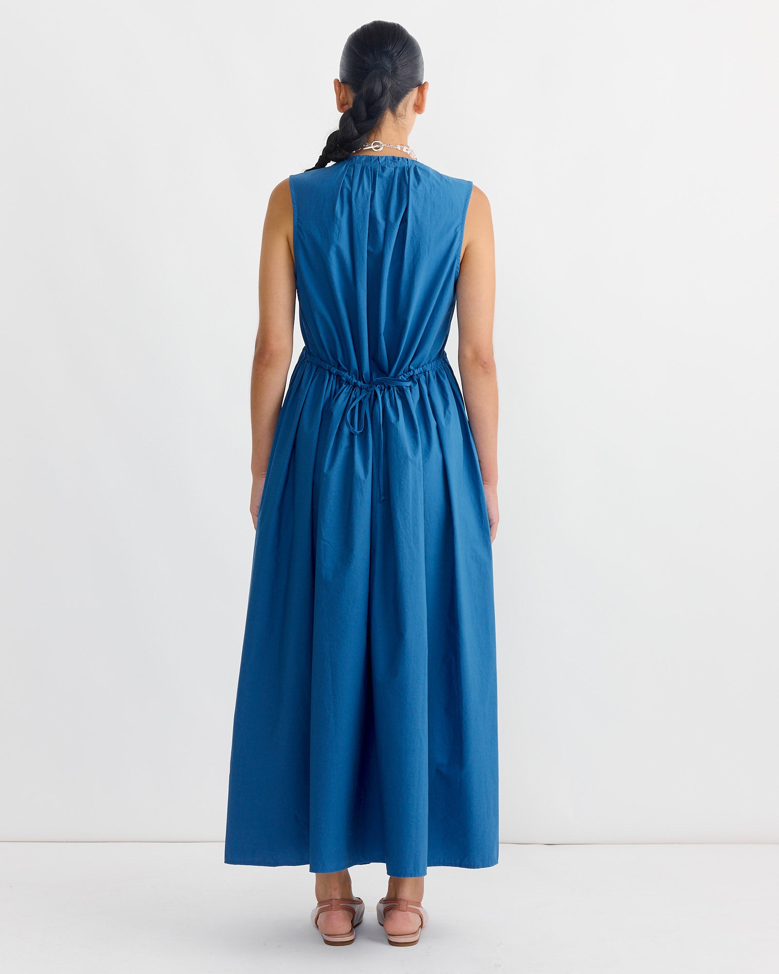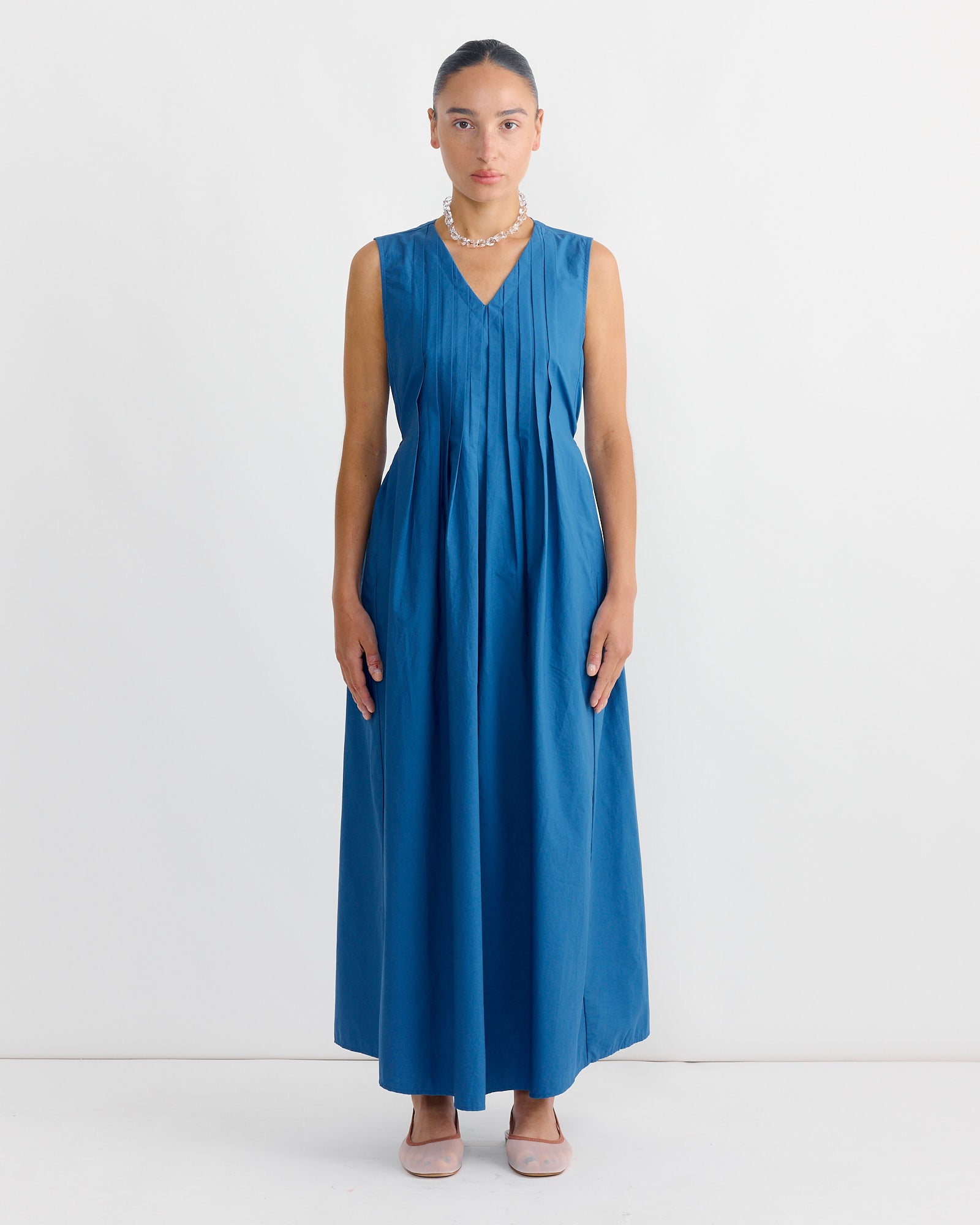 The Black Crane Pleated V-Neck Dress in Blue features front pleating and a relaxed silhouette with a softly structured drape. An adjustable drawstring at the back allows for versatile shaping, while side seam pockets add function. Made from soft organic cotton, this piece is easy to wear and easy to care for.