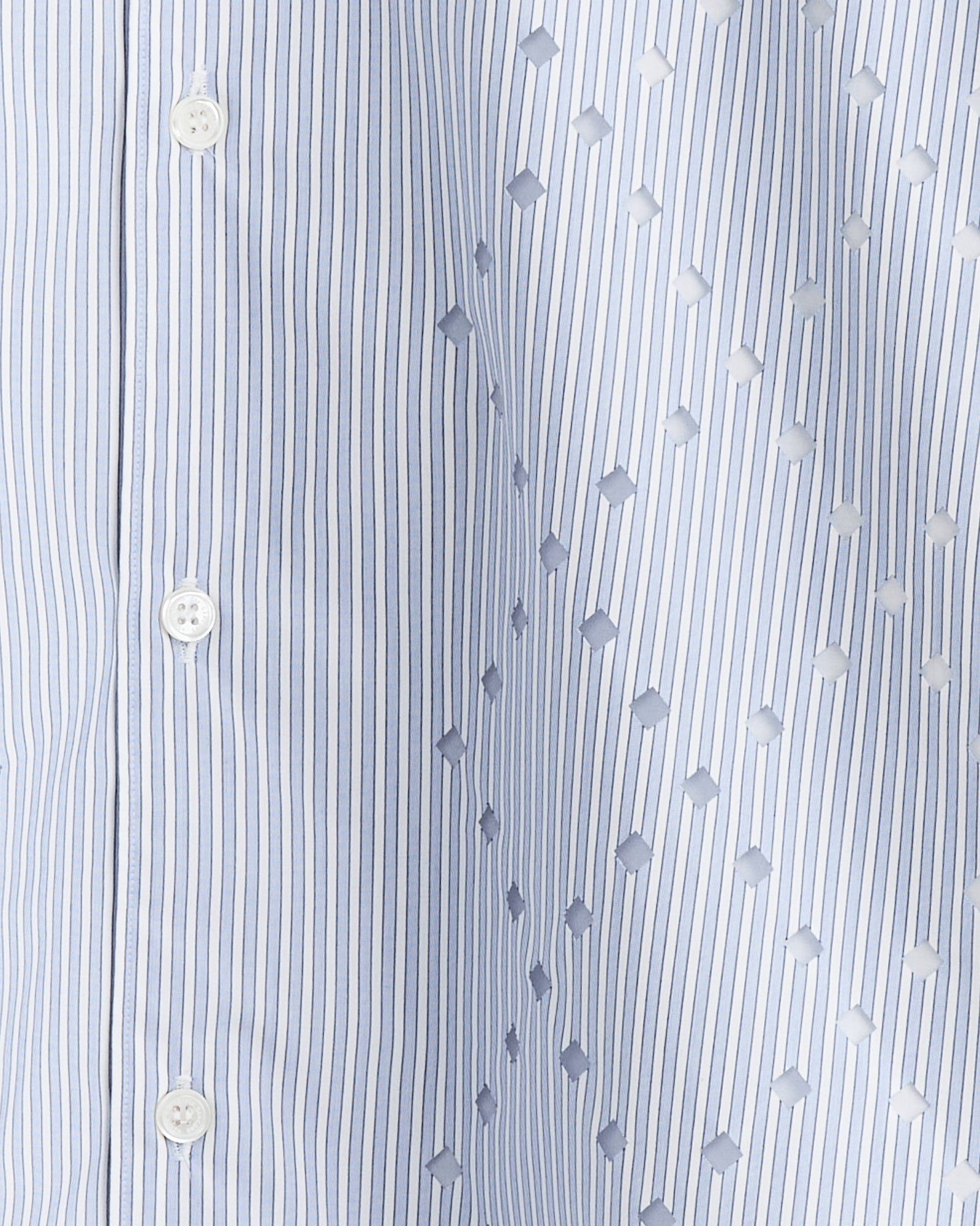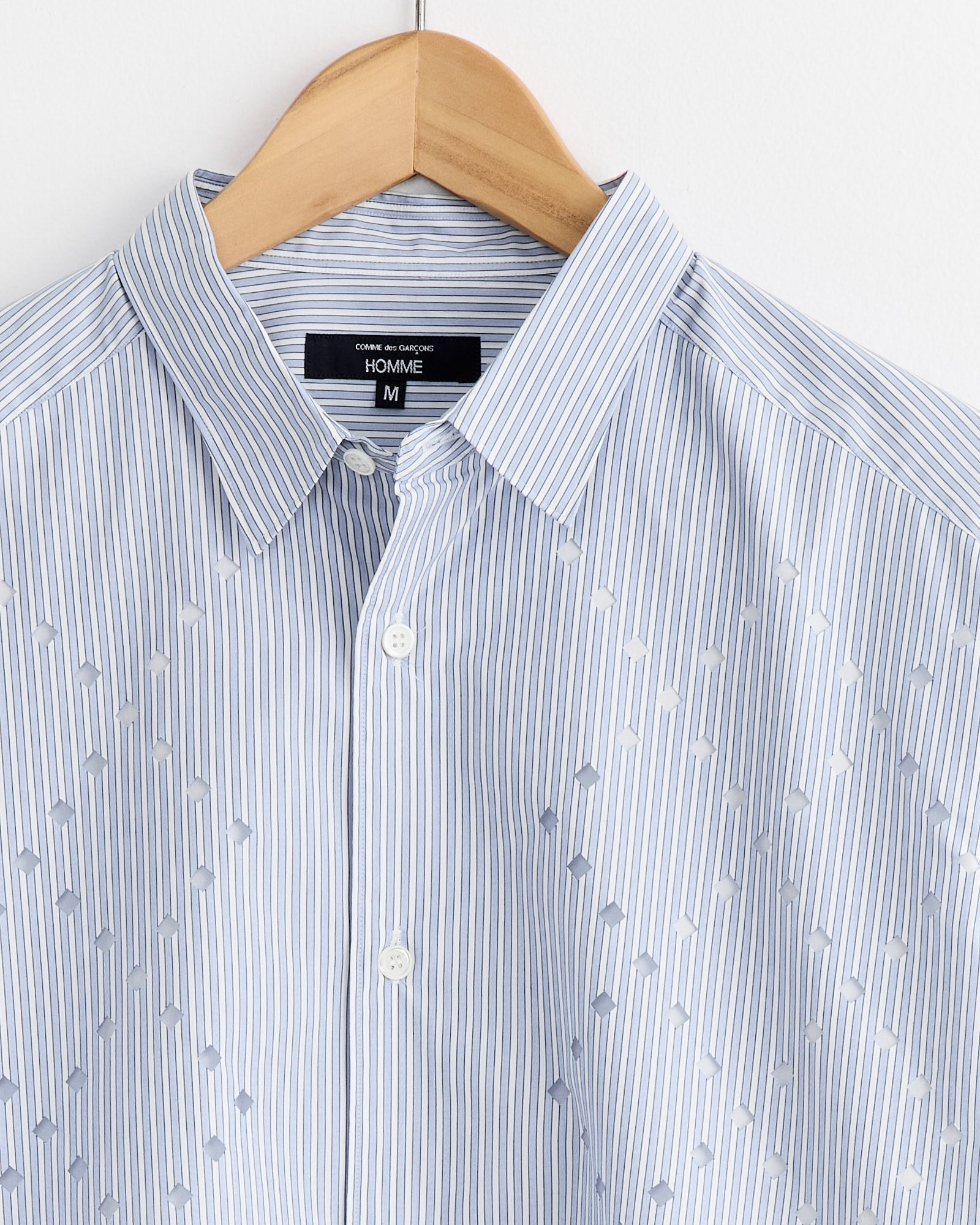 The Comme des Garçons Homme Broad Stripe Cut Out Shirt in Sax/White/Navy features a broad stripe cut-out design with a structured silhouette. Made from lightweight cotton, it offers a crisp finish and a refined look. The contrast paneling adds depth to the design, making it a distinct piece within the collection.