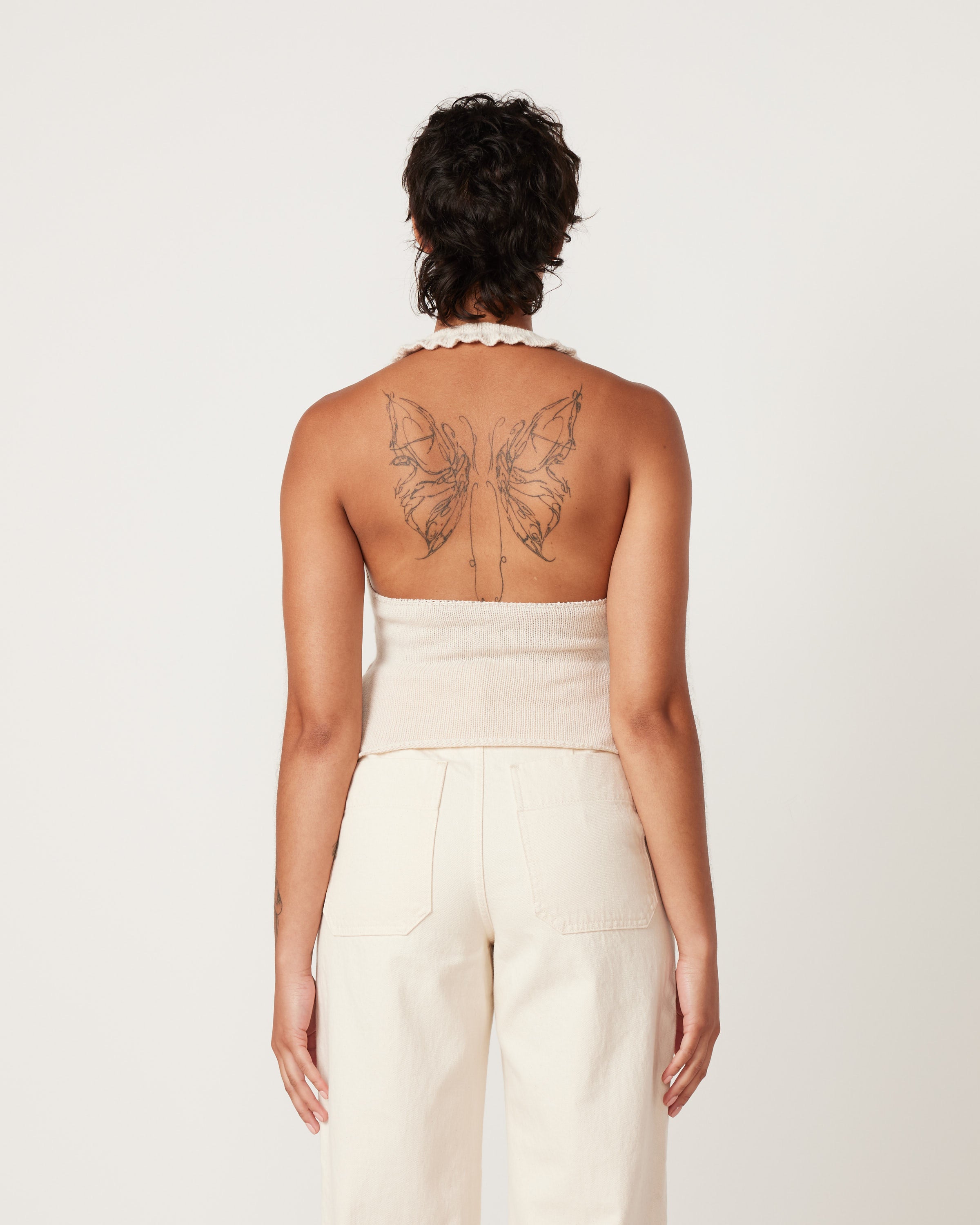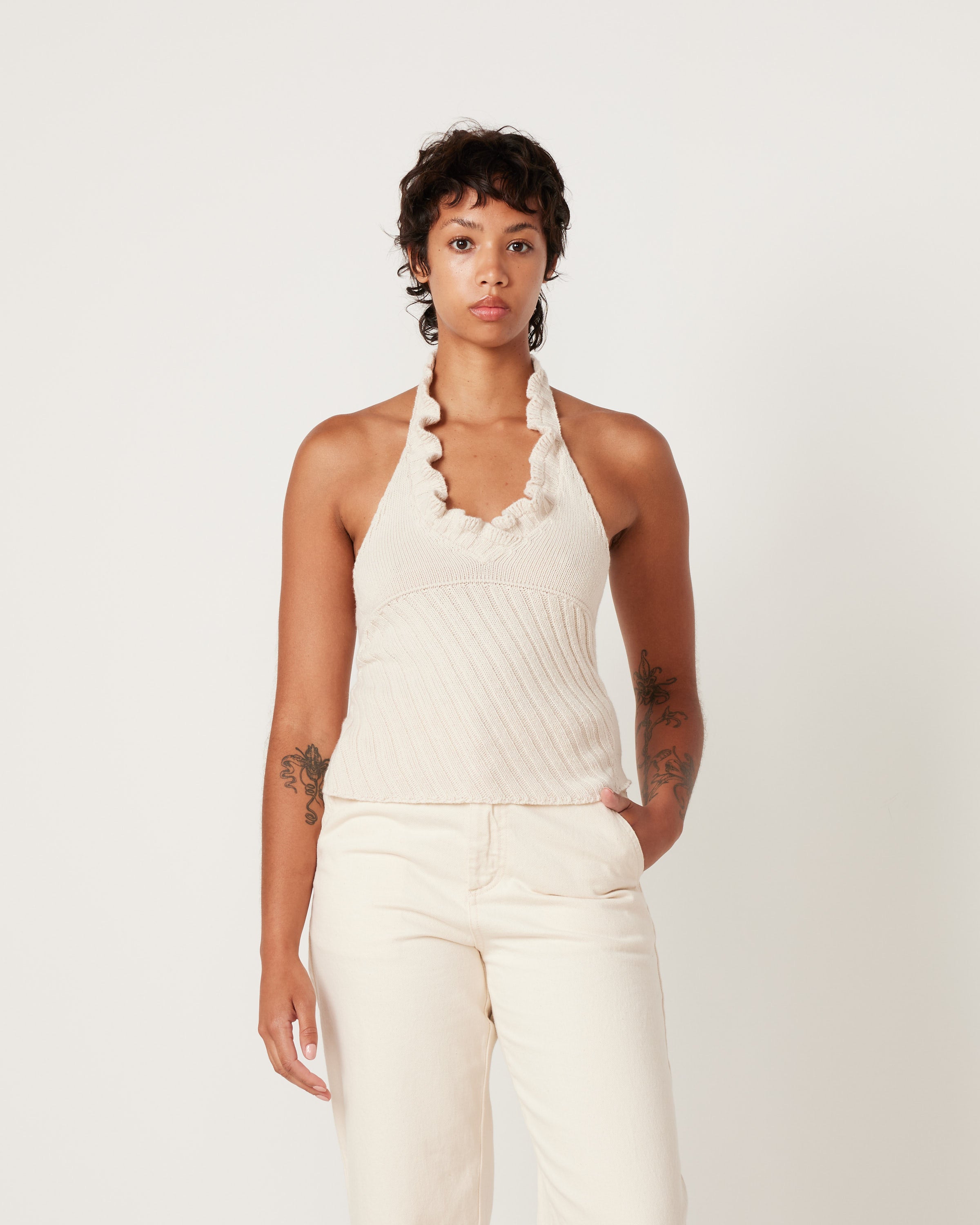 A sleeveless top knit from a cozy blend of nylon, wool, viscose, and cashmere, Gimaguas's Clovelly Top features a ruffled halter strap with a scoop neckline, an open back, and a slim silhouette.