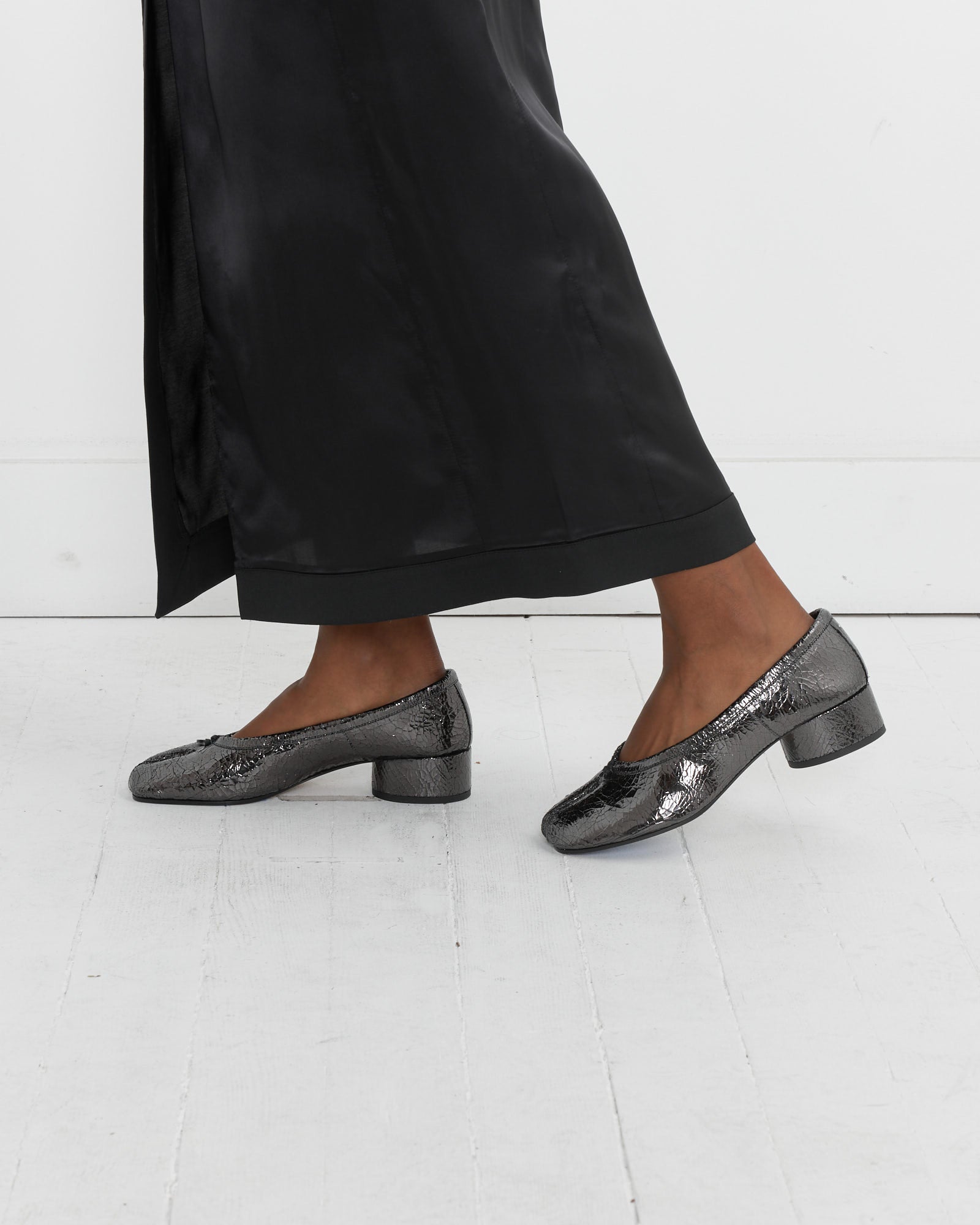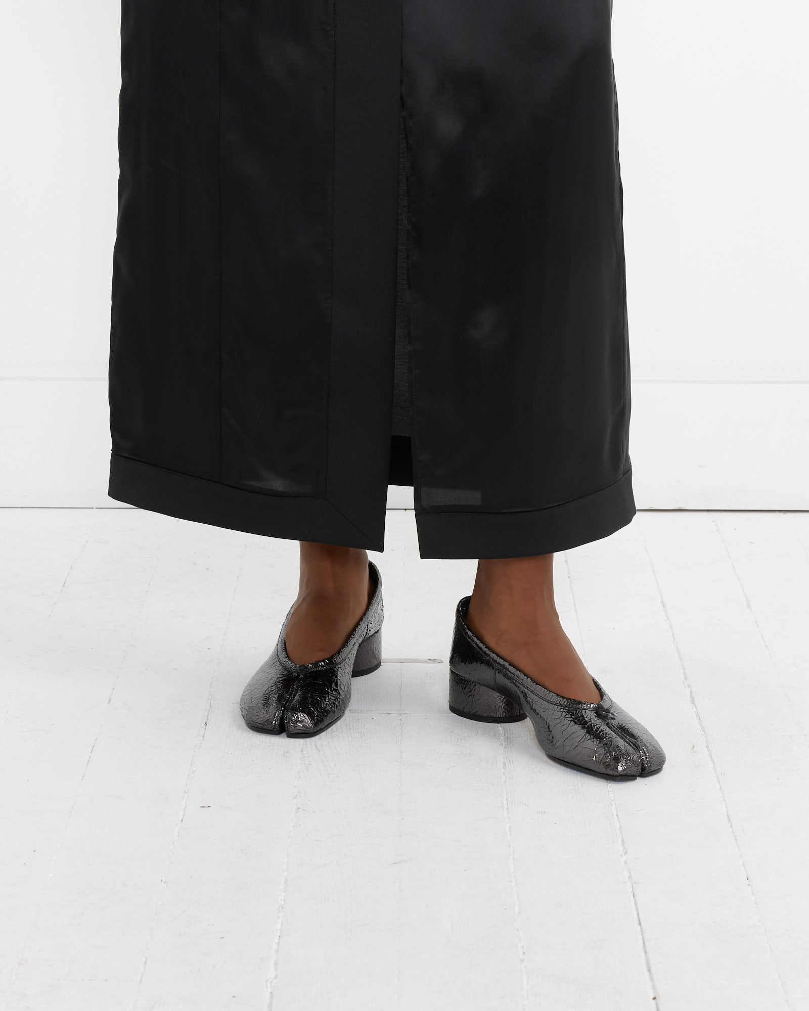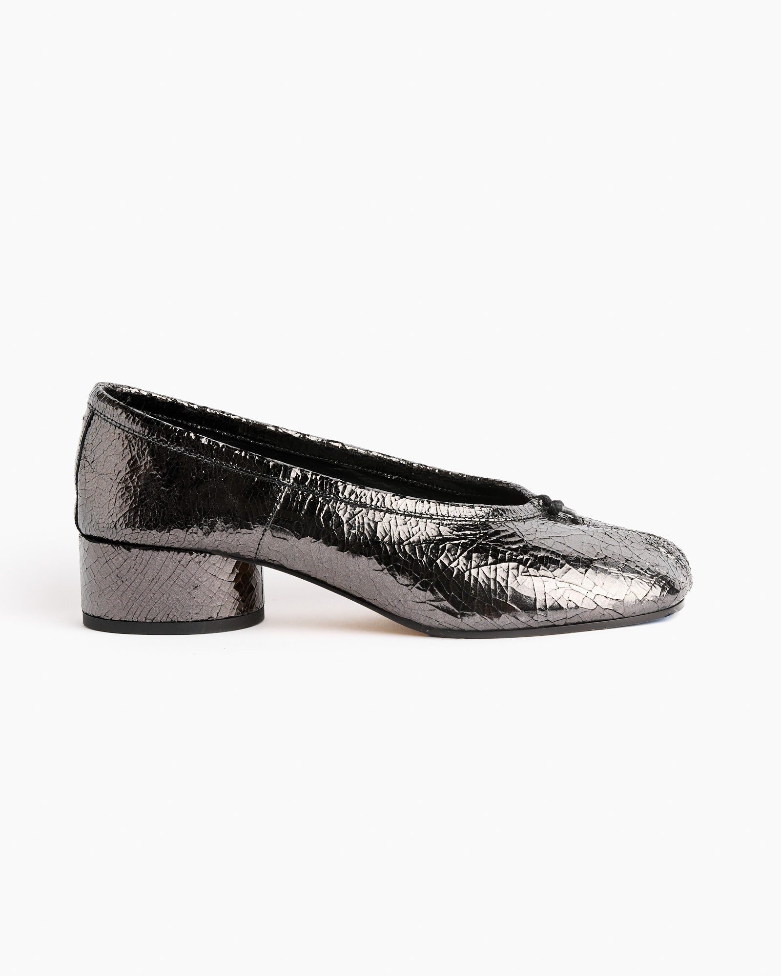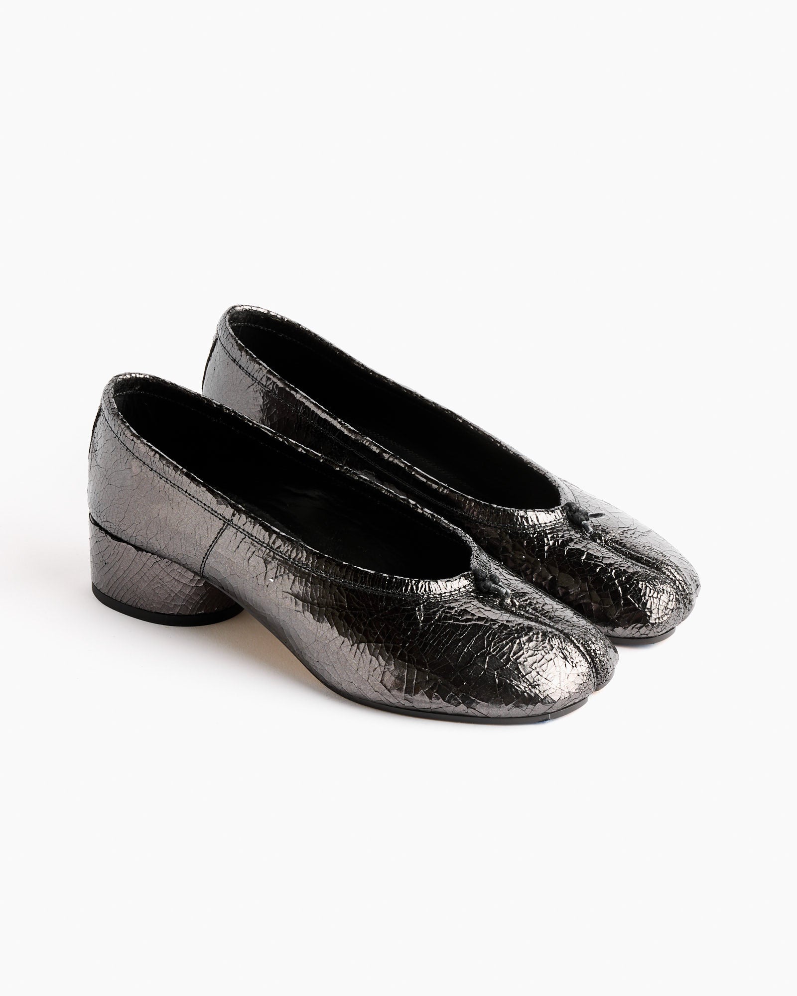 Inspired by soft ballet slippers and done in a broken mirror leather finish, Maison Margiela's Tabi Ballerina in Crinkled Black are composed of two pieces of textures calfskin leather stitched together, covering the upper and the heel, and feature a one inch cylindrical heel with a rubber outsole for traction