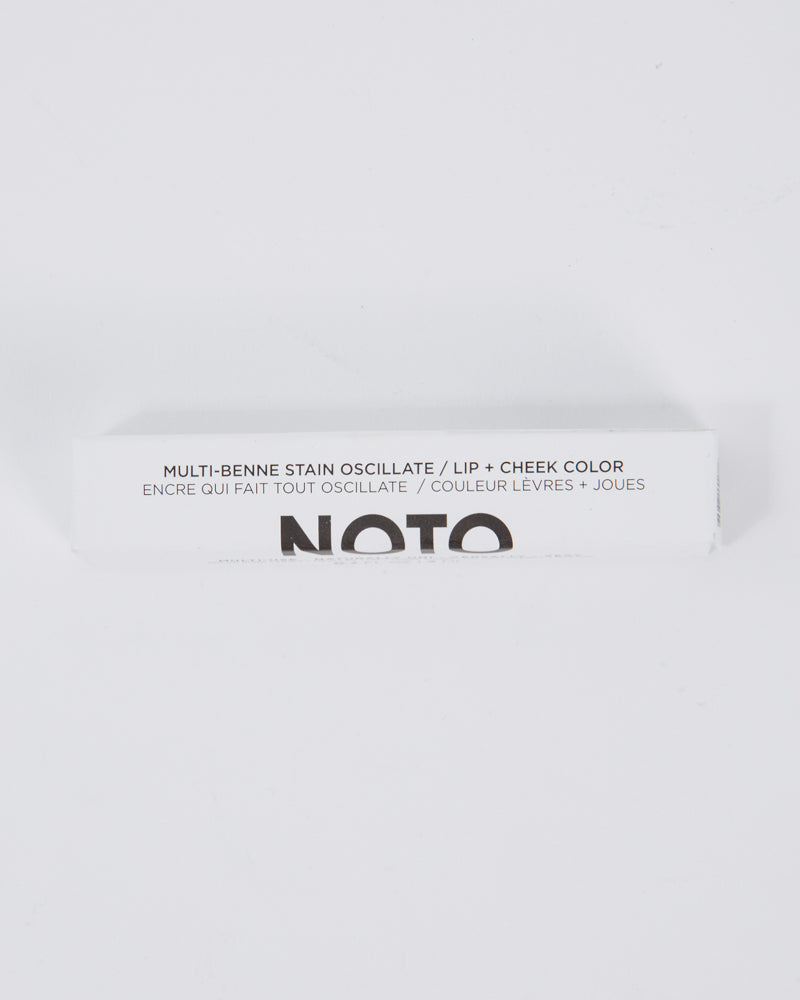 A white box labeled "Multi-Benne Stain Stick in Oscillate" by NOTO, with French text, sits on a white background—suggesting the natural flush of its deep red-orange lip and cheek color.