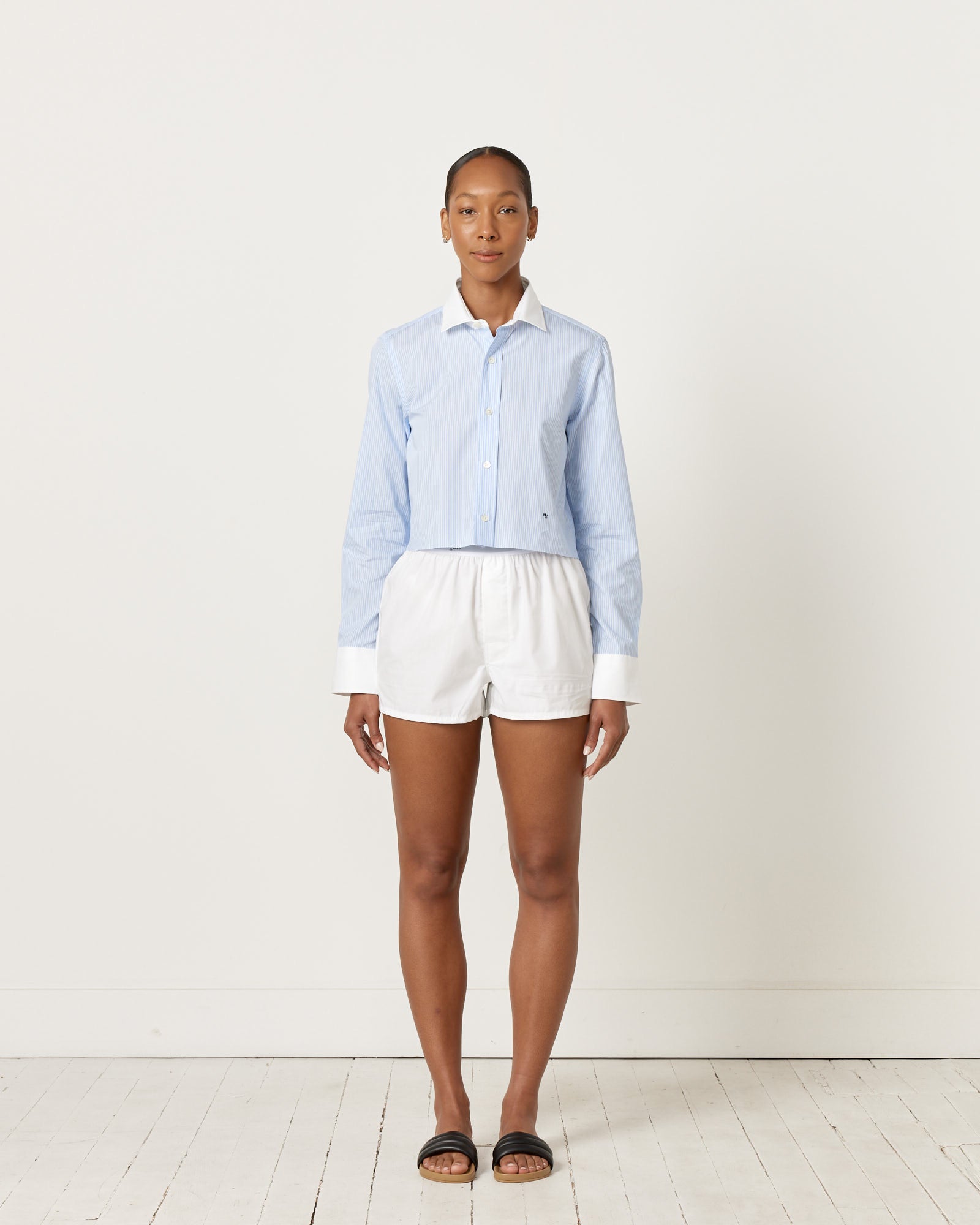 • Cropped Contrast Collar Shirt in Multi Blue Stripe