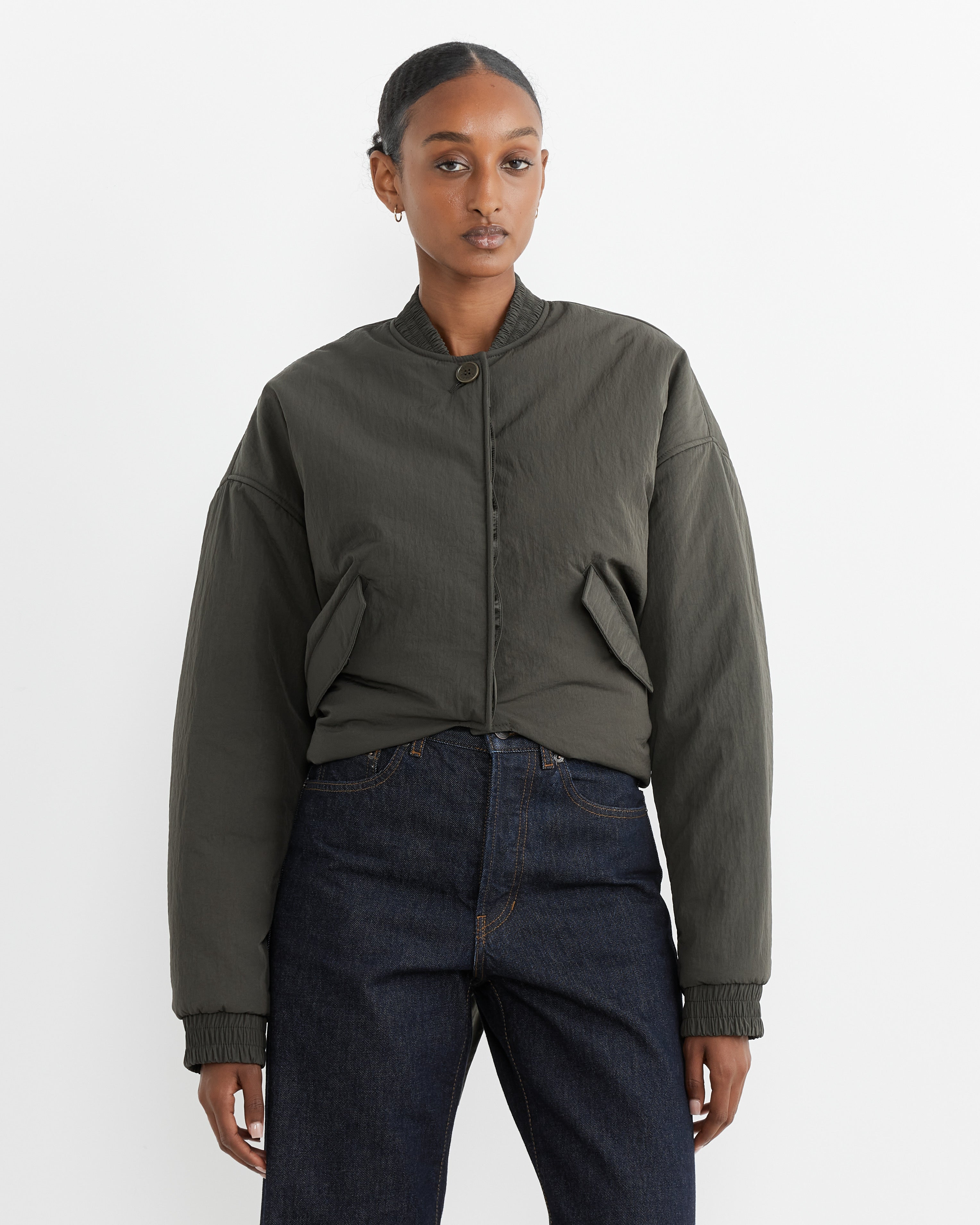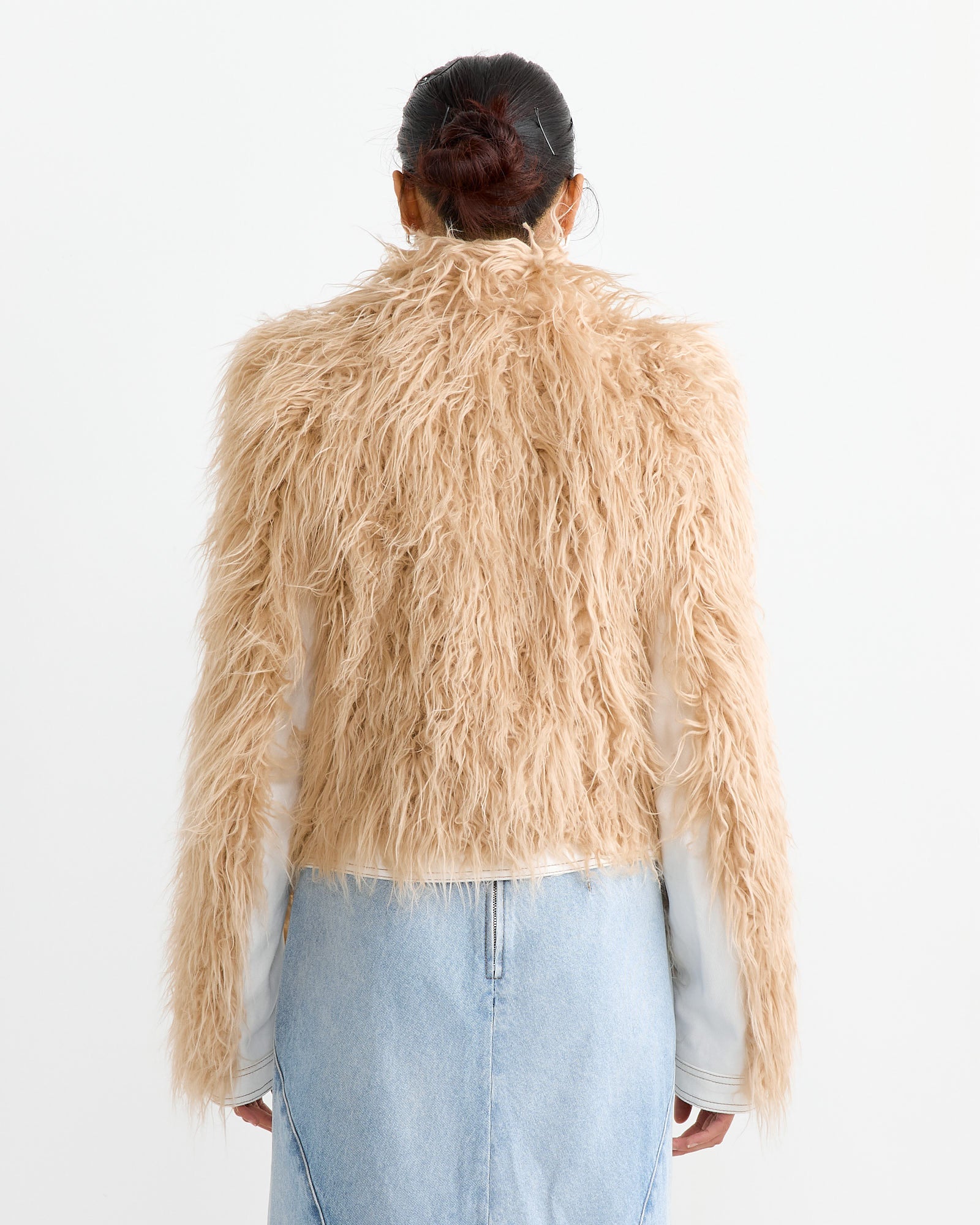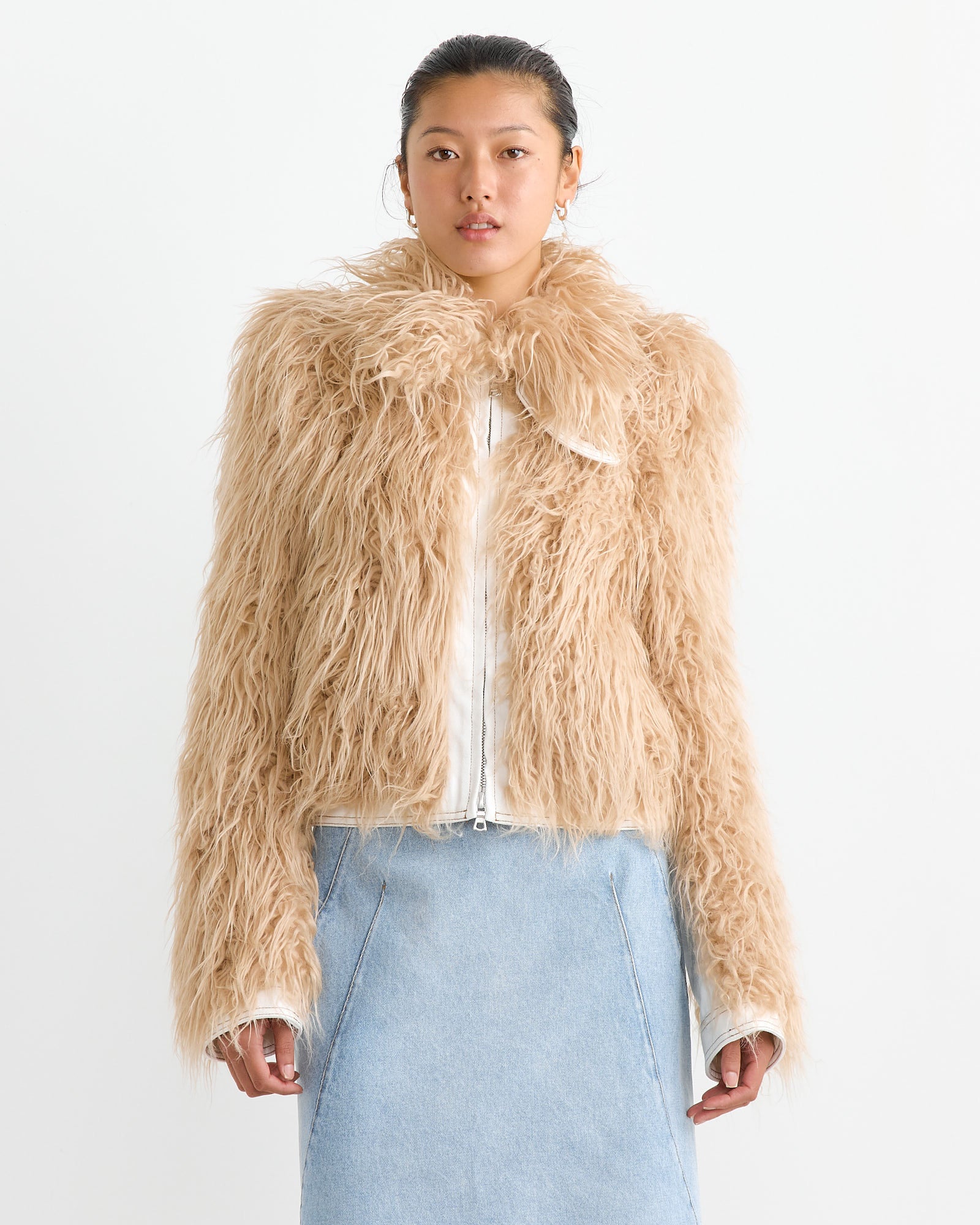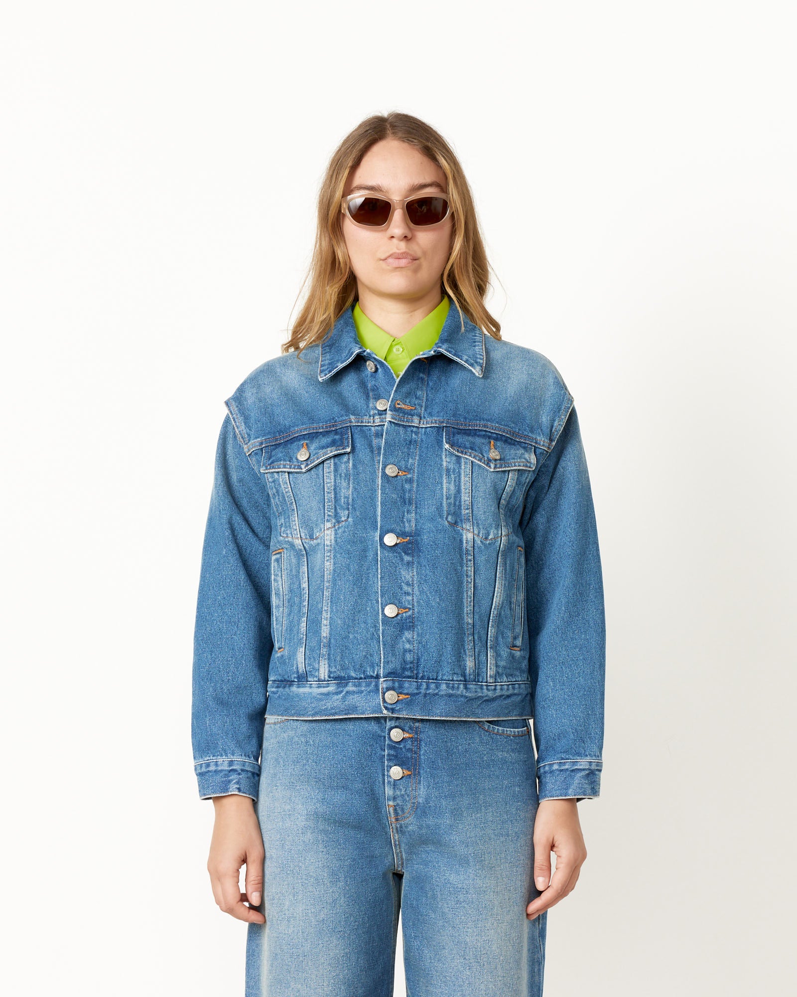 A person wearing a blue denim jacket and jeans, neon green shirt, and brown sunglasses stands facing the camera against a plain white background.