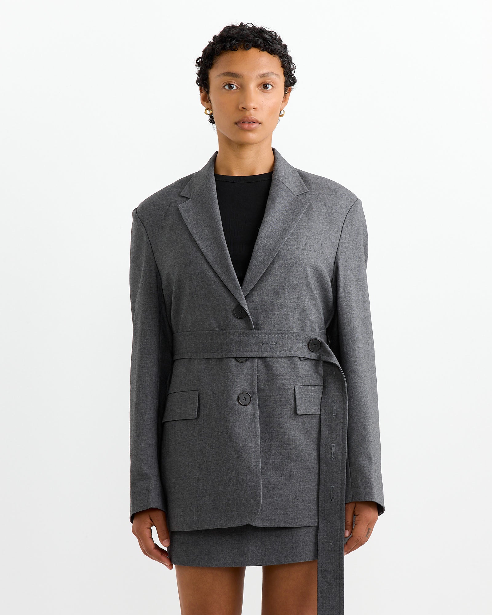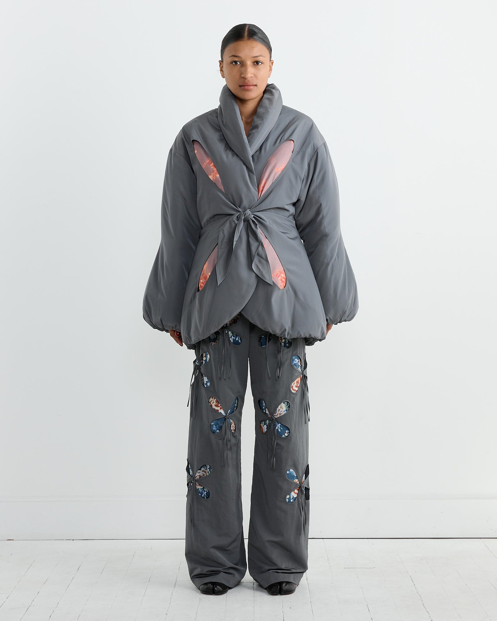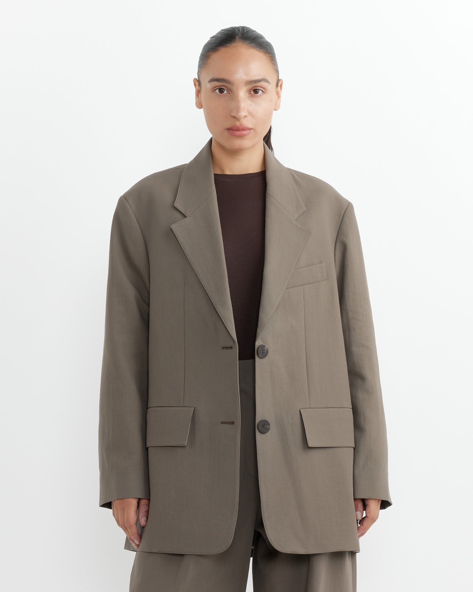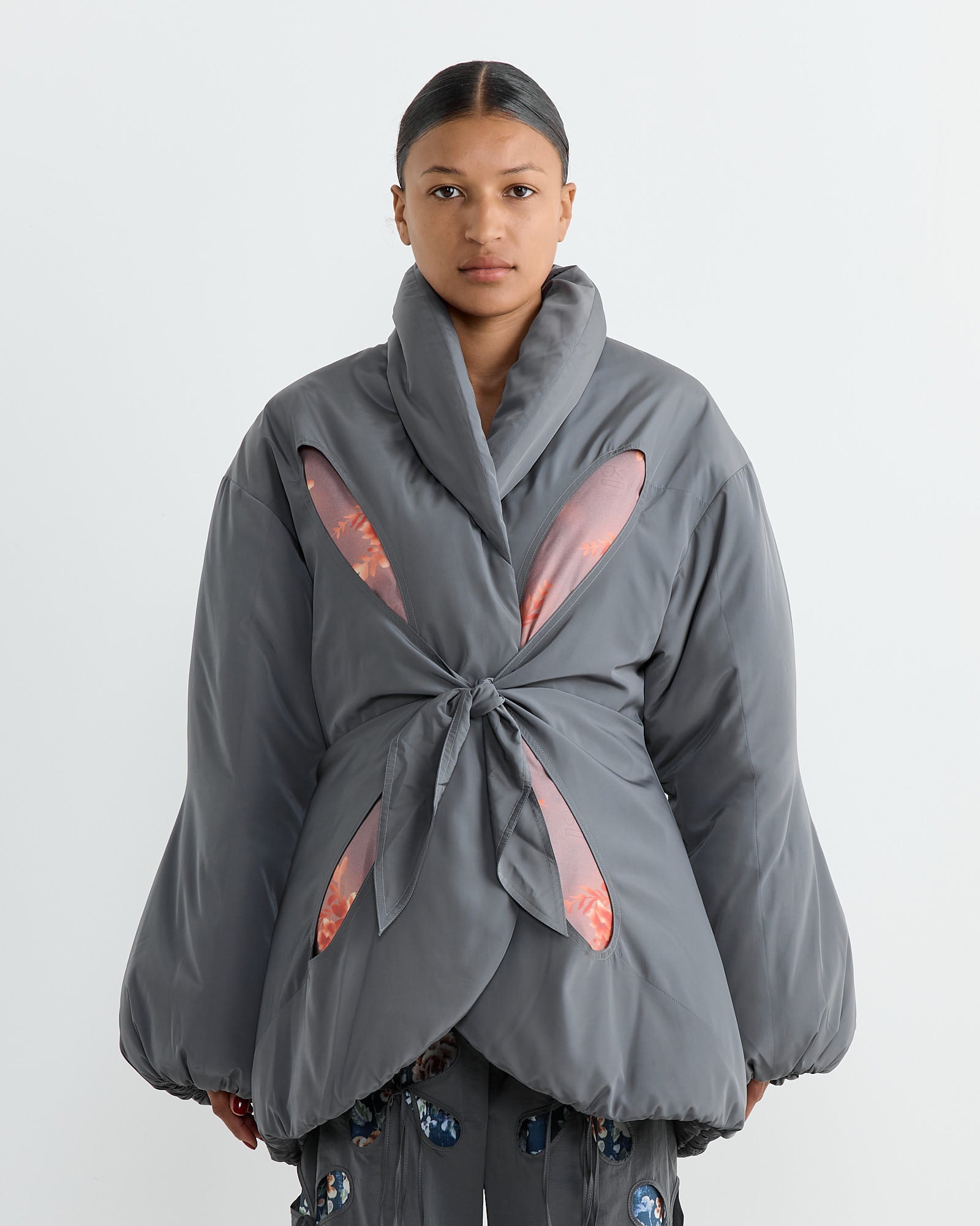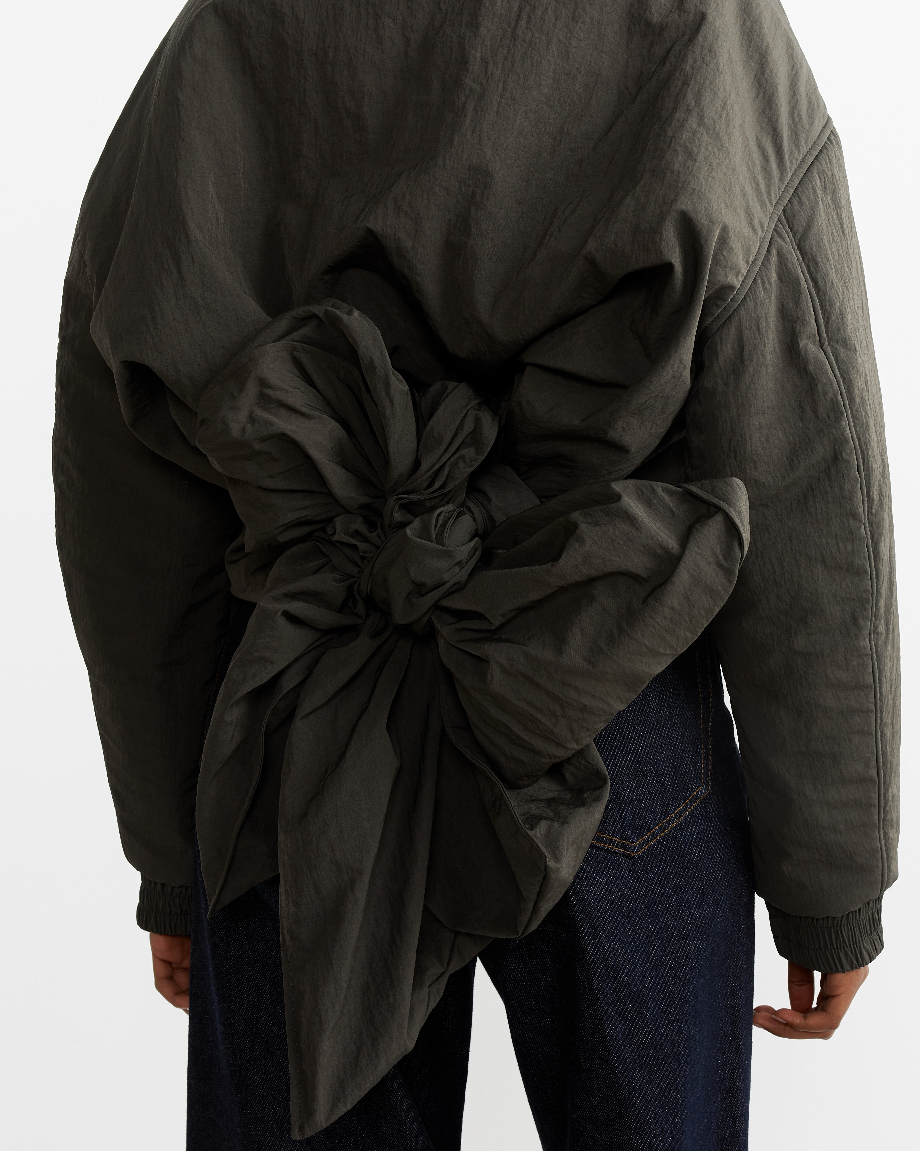 A person wearing a blue denim jacket and jeans, neon green shirt, and brown sunglasses stands facing the camera against a plain white background.