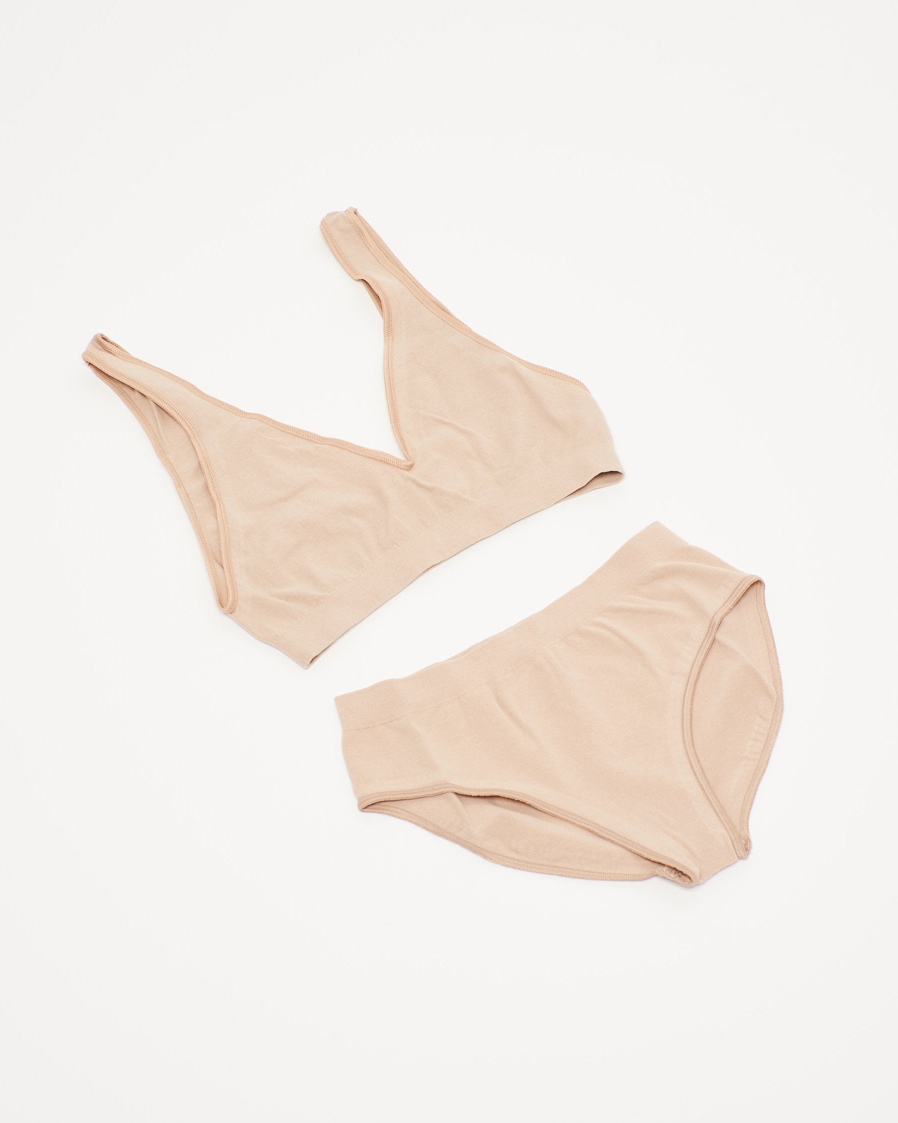 A matching beige bra and Baserange Oleta Pants in Haptic, a seamless cotton underpant set made in Portugal from soft fabric, are laid flat on a white background.