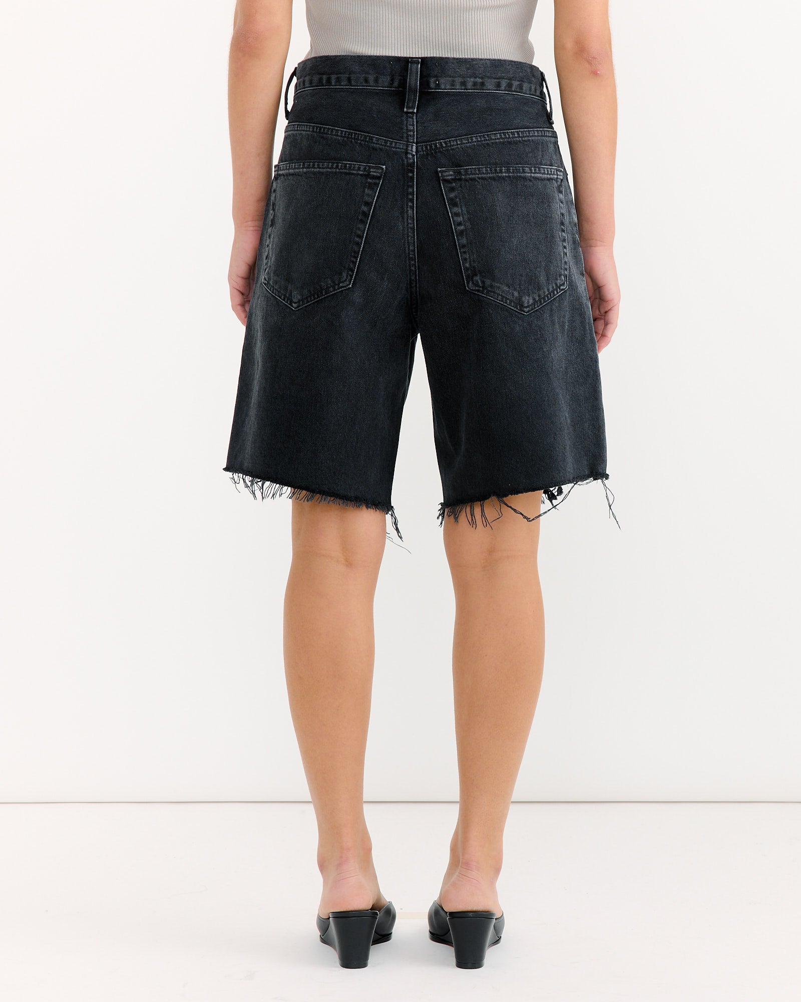 The Indra Short has a hip-slung fit with a square top block and a relaxed, easy shape. It features a button fly closure, raw hems, and a saturated washed black finish. Made from 100% regenerative cotton, it offers a structured feel with a soft hand.