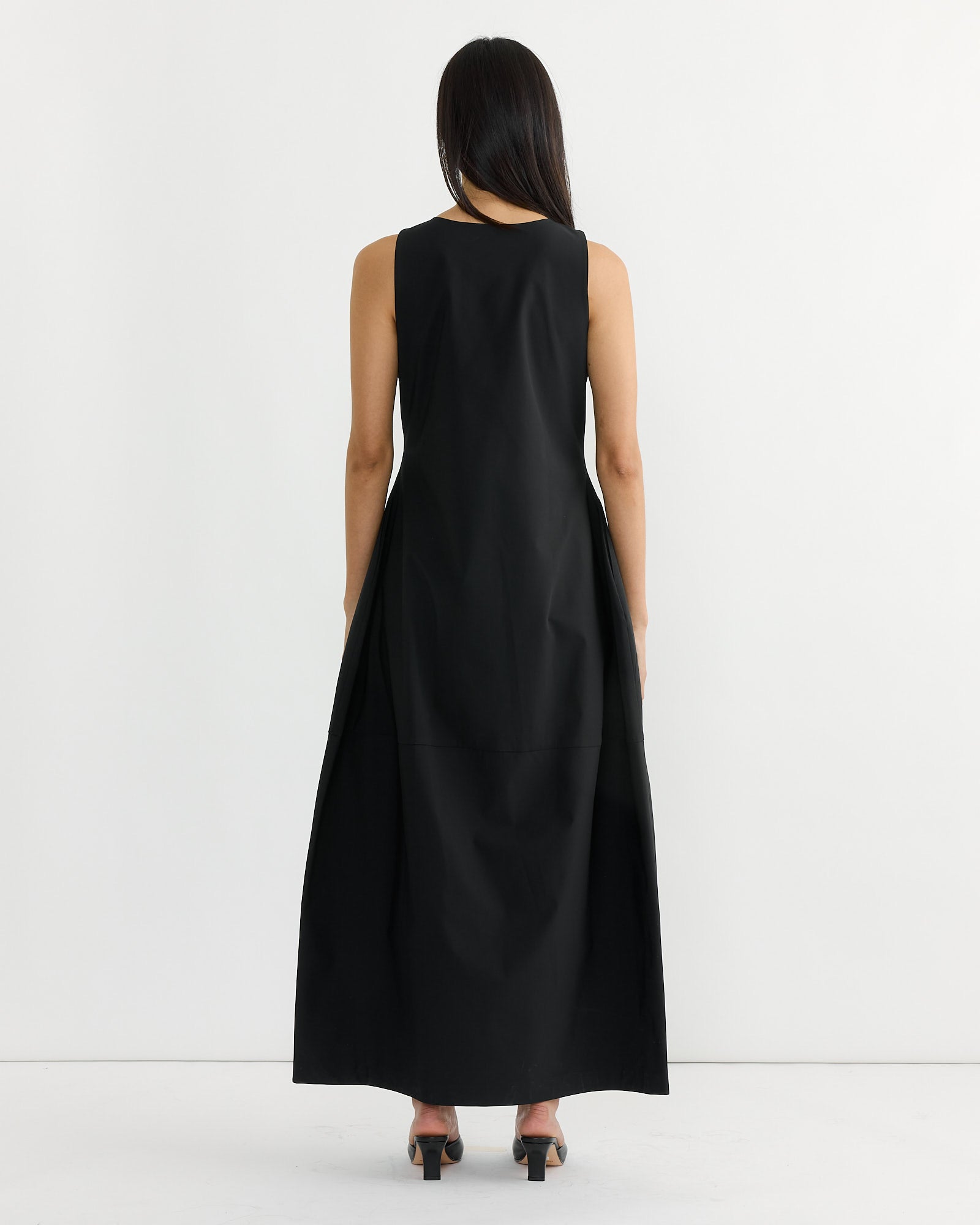 The Amomento Hourglass Long Dress features a structured silhouette with a sculptural hourglass shape. Designed with hidden pockets in the cut line and a concealed zipper for a minimal, refined finish. A horizontal cut detail at the hem enhances its voluminous form.