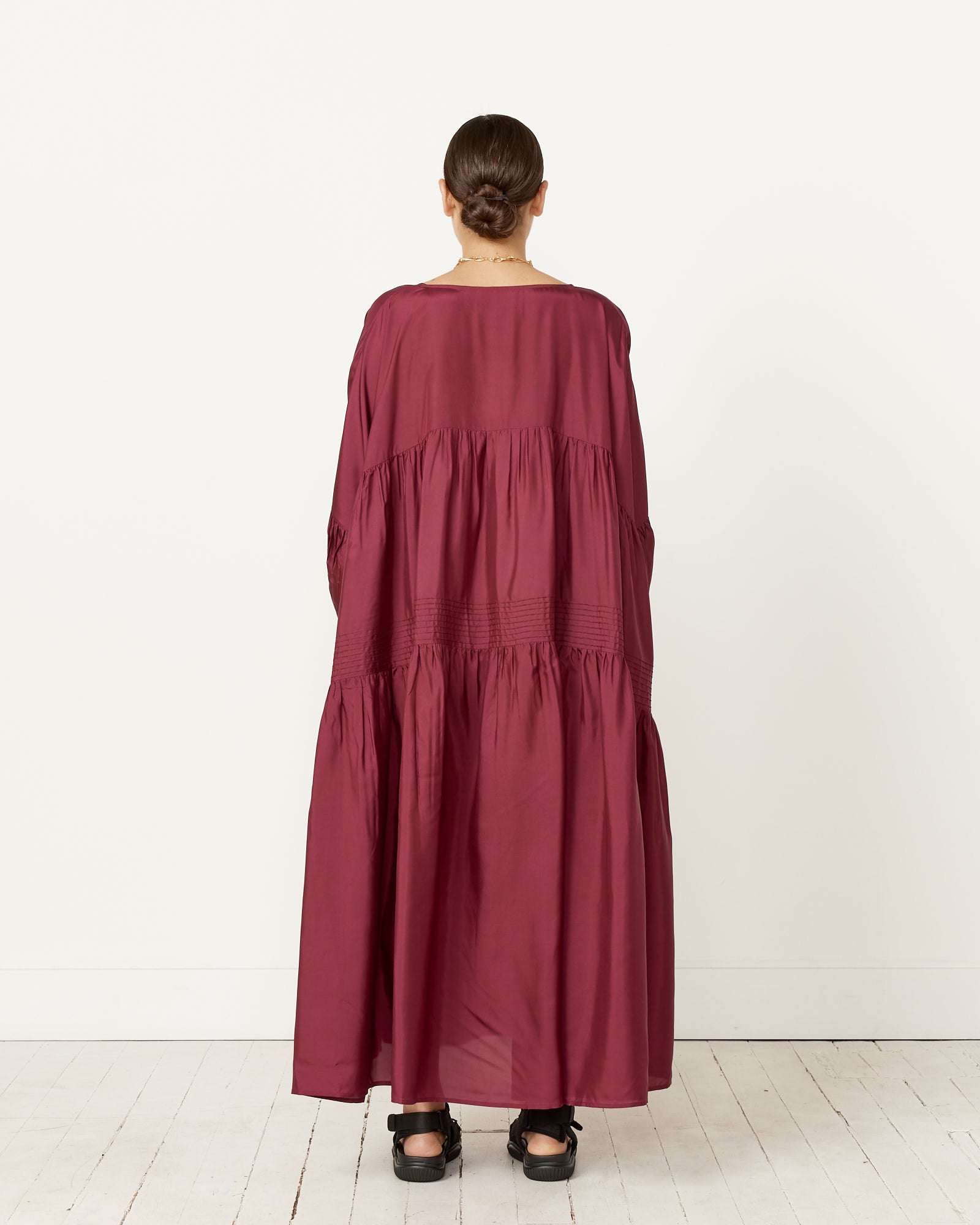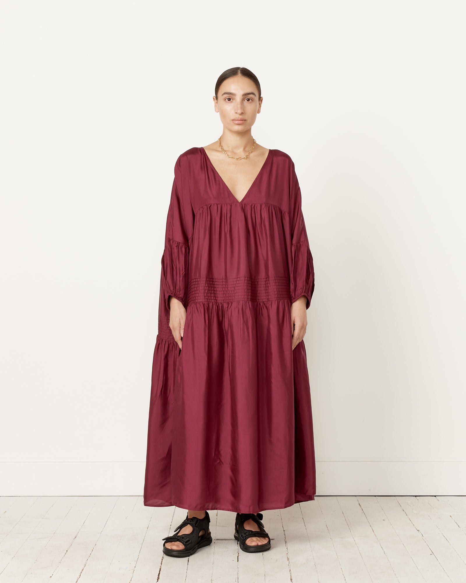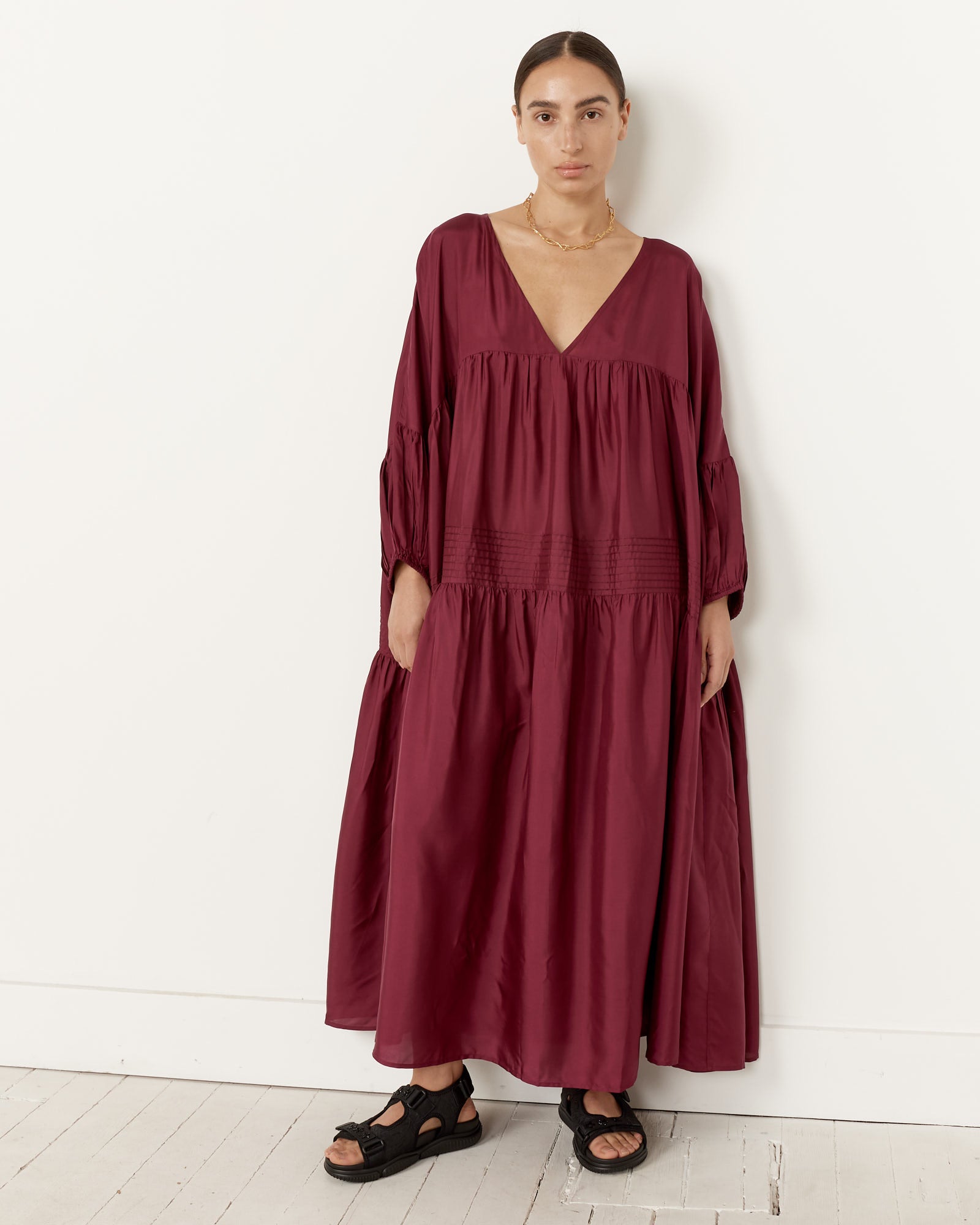 Anaak's Airi Silk Maxi Dress is made from lightweight silk cut in a voluminous maxi-length silhouette with a billowing hem, a deep v-neckline, 3/4 length cocoon sleeves with elastic cuffs, micro pleating details, and a tiered skirt.