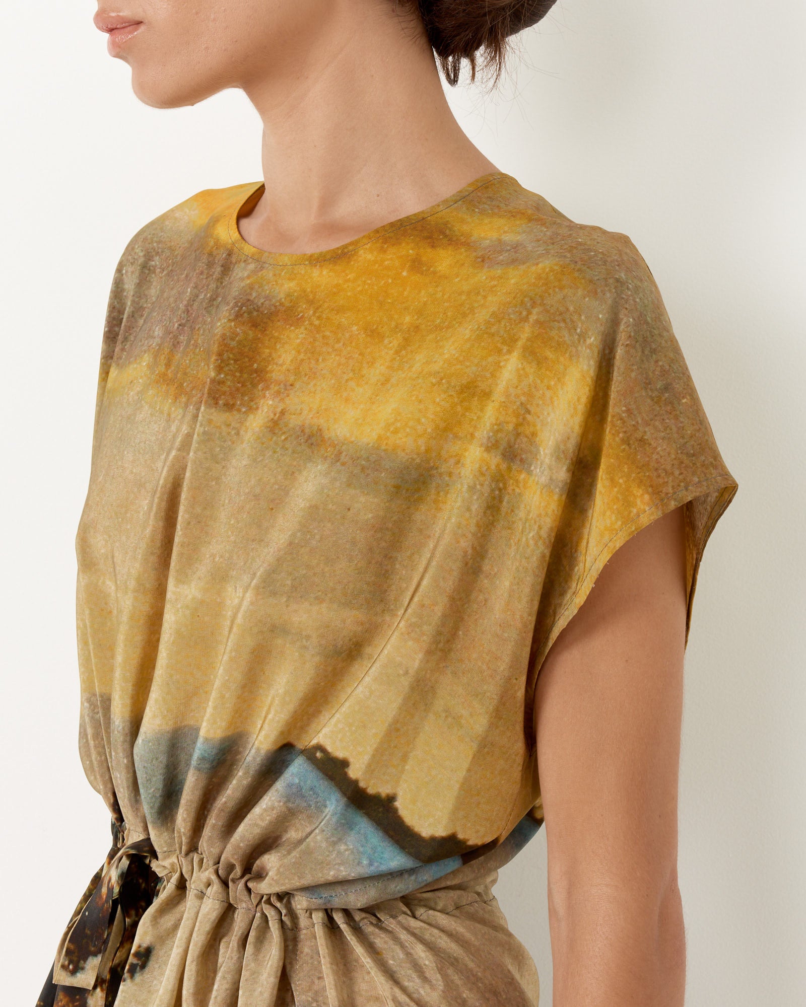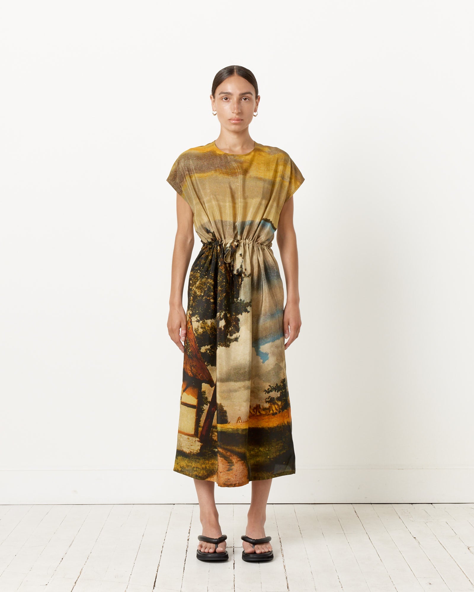 The Simple Dress in Print G boasts a relaxed fit and an adjustable waist belt for a customizable and comfortable experience. Featuring a nostalgic landscape print, this midi dress offers a soft and smooth finish with short sleeves and a one-size fit.