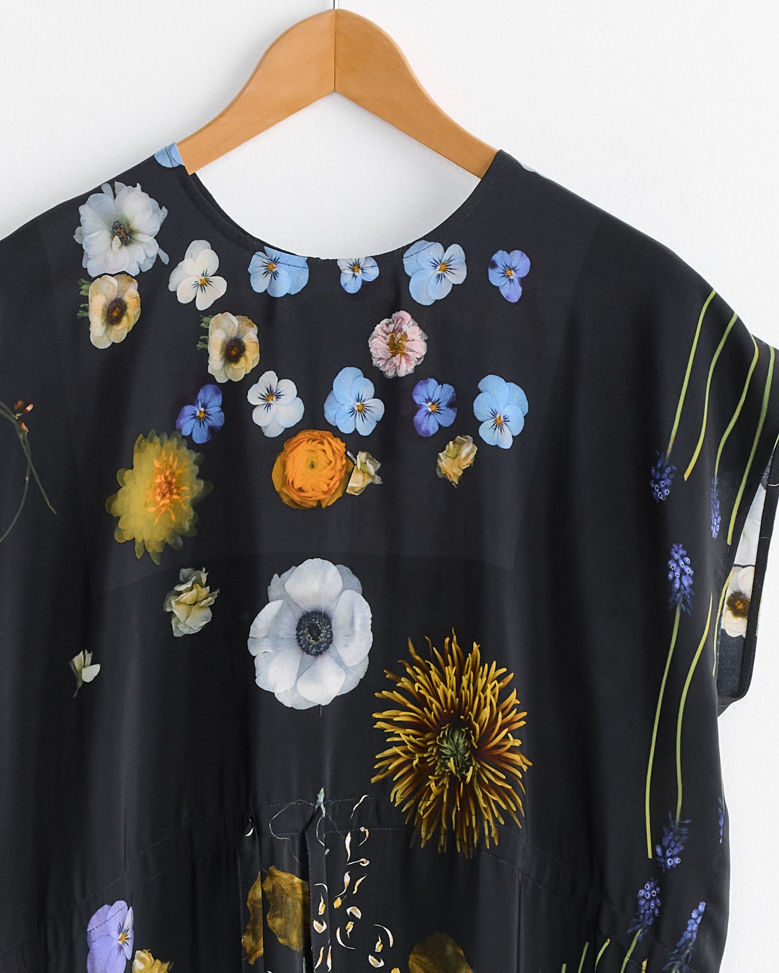 The Anntian Simple Dress in Print I/Flowers on Black is a sleeveless midi silhouette with a relaxed fit and adjustable waist belt. Crafted from soft organic silk, the digitally printed floral pattern is individually placed, making each piece one of a kind.