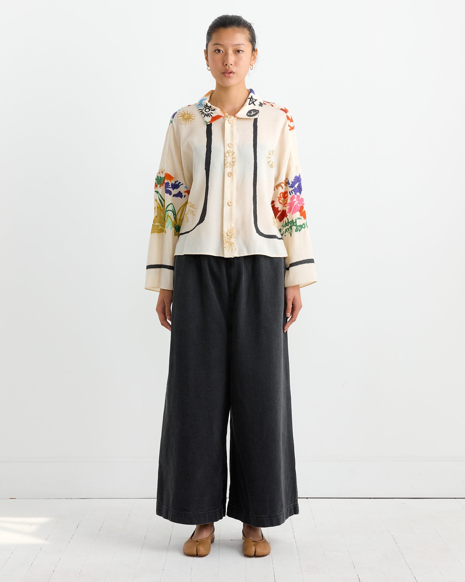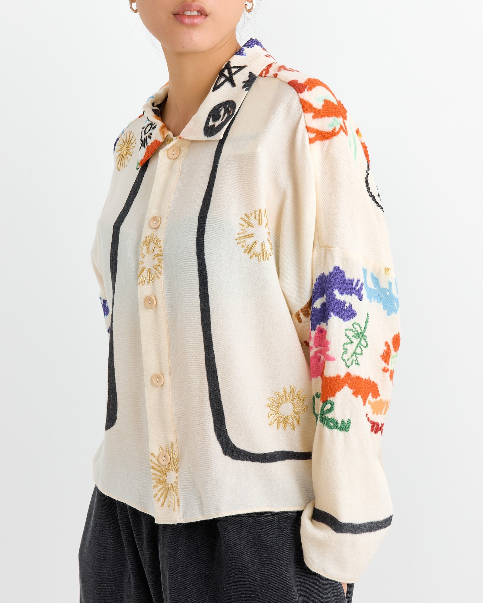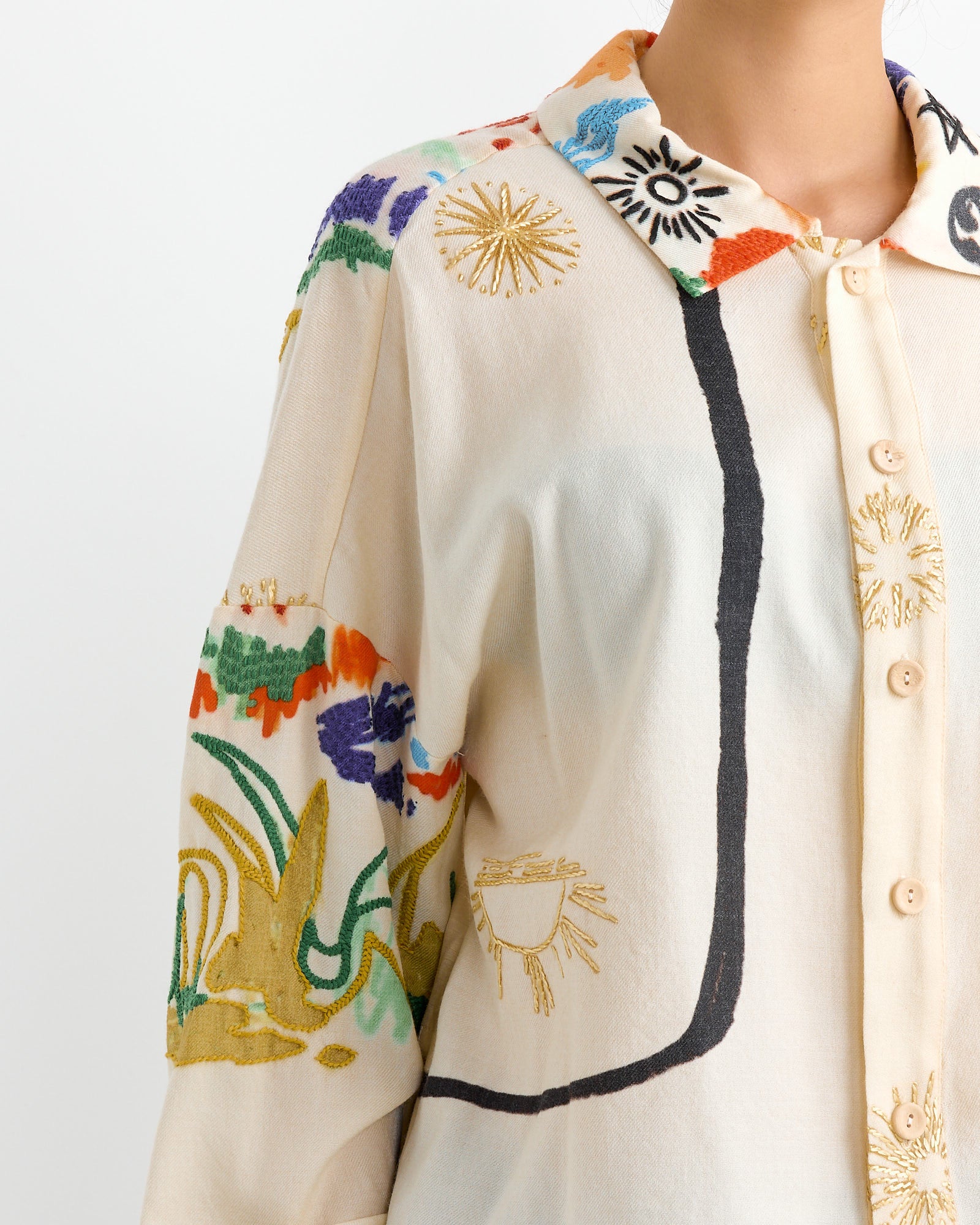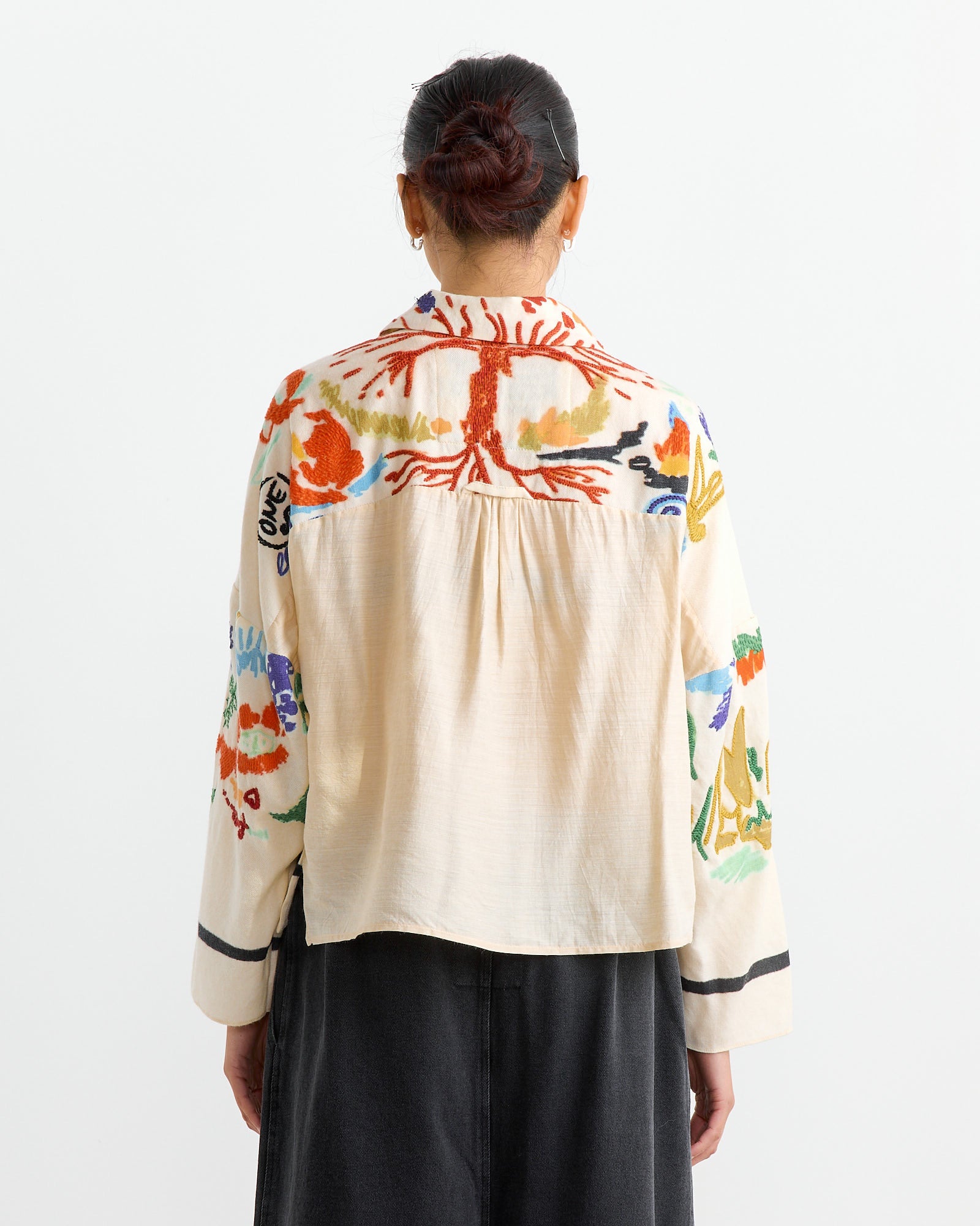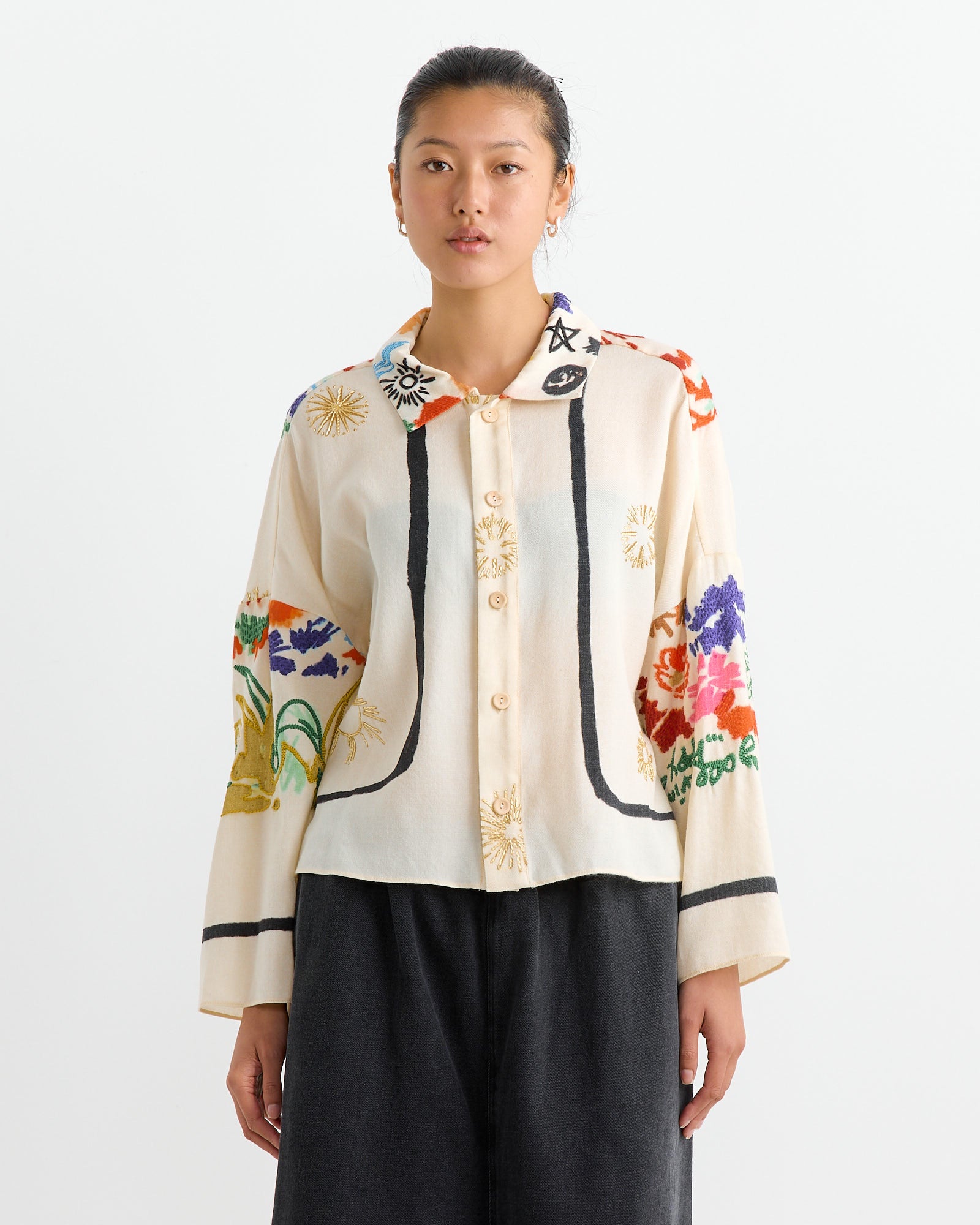 The Anntian Wool Shirt with Hand Embroidery is a loose-fitting blouse made from 100% wool, featuring intricate hand-embroidered details. This unique piece embodies Anntian's signature craftsmanship, combining artistry with sustainable production. The short, relaxed silhouette makes it ideal for layering, and its hand-embroidered accents offer a personalized, one-of-a-kind touch.