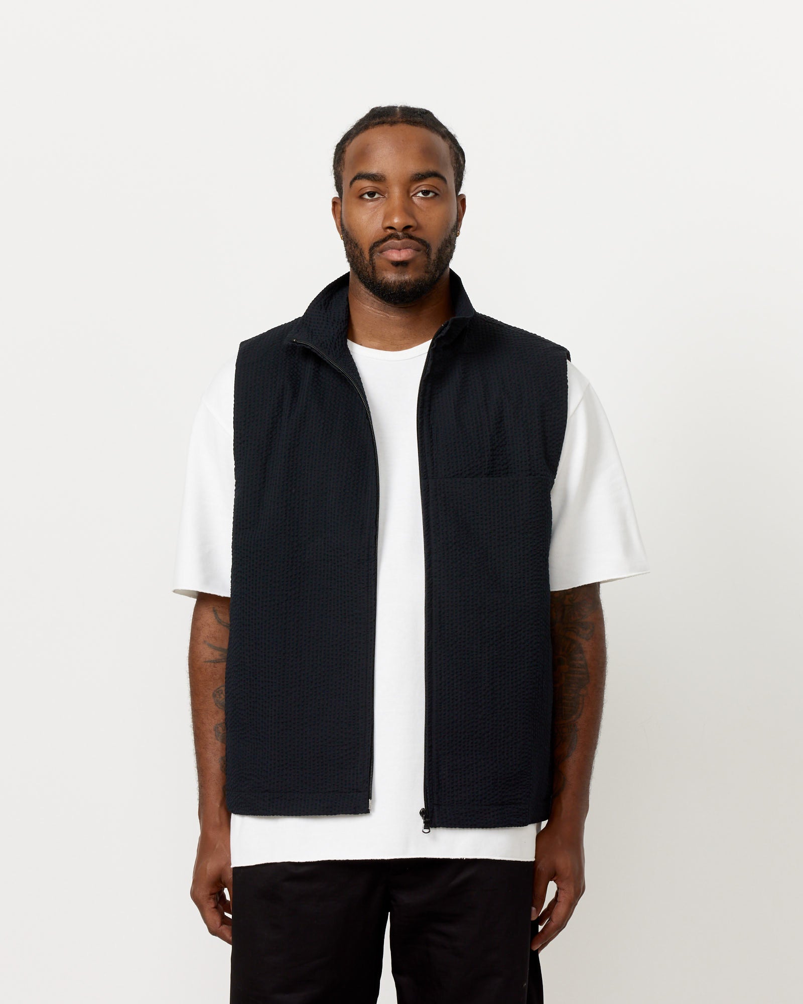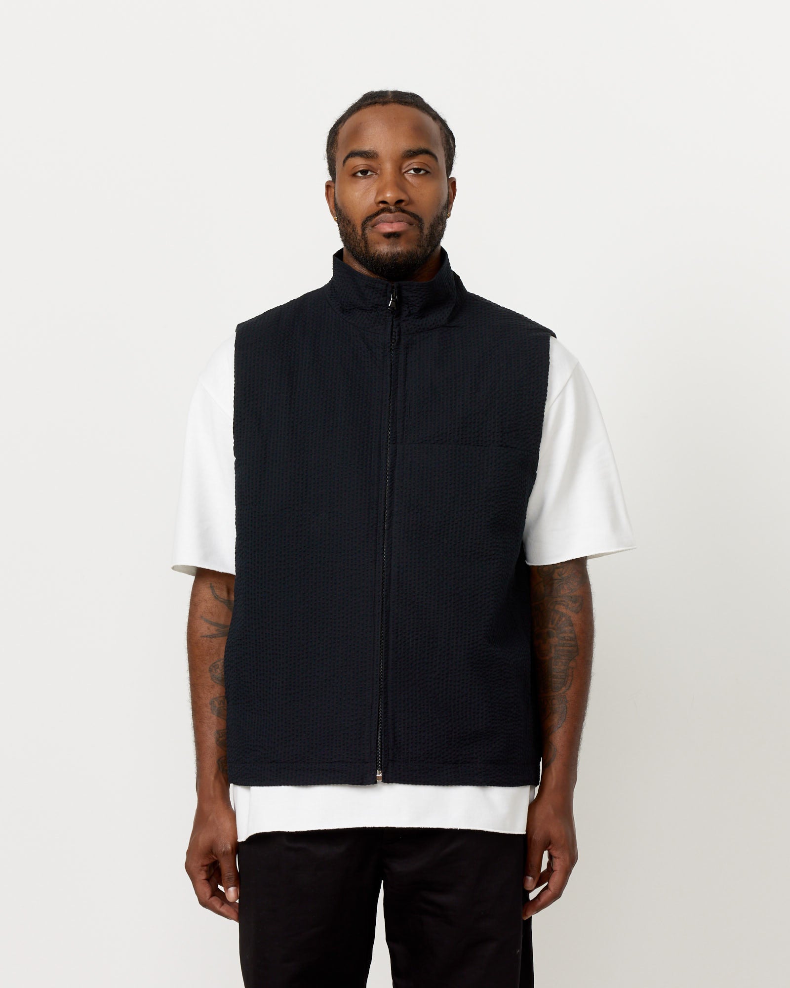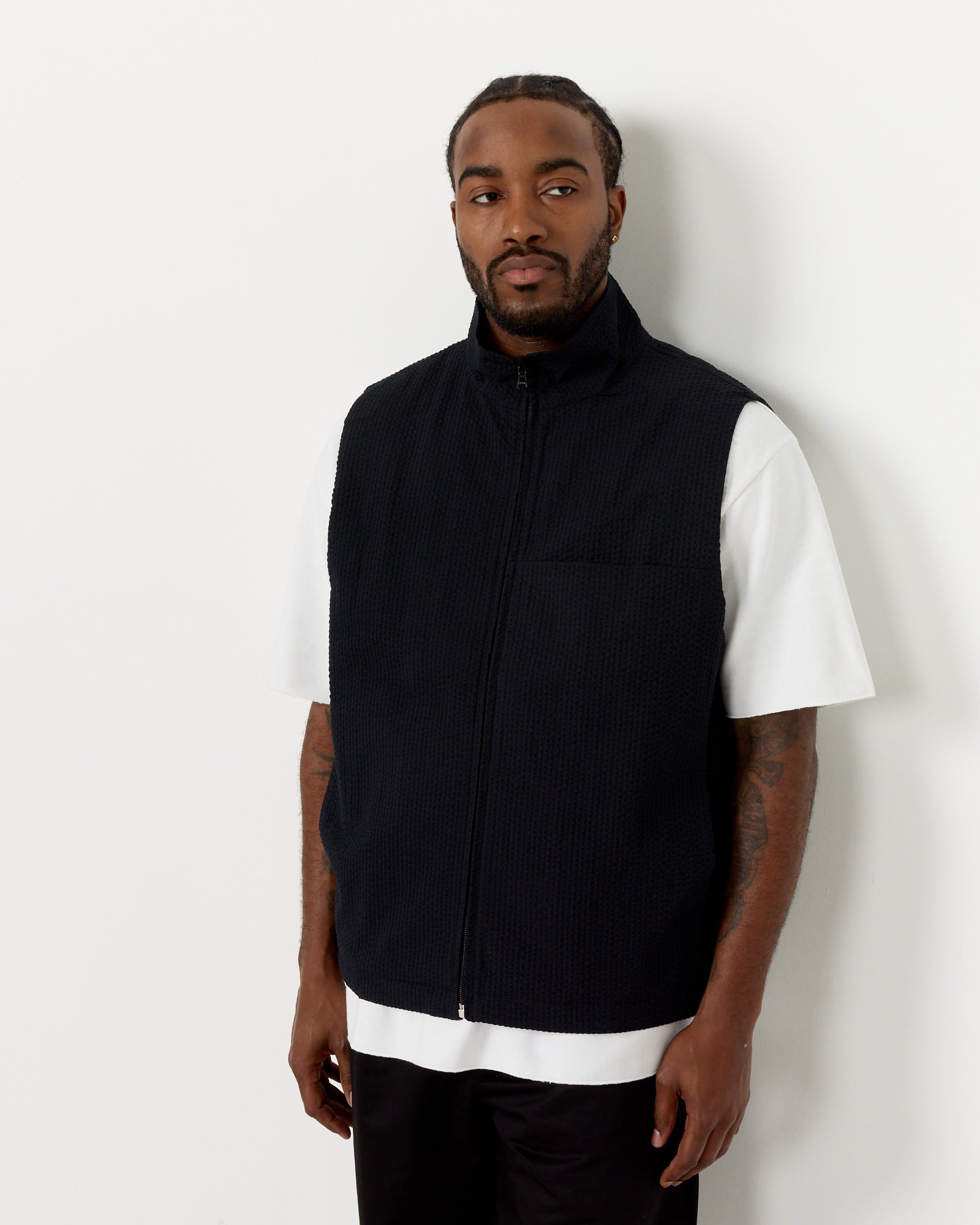 Arpenteur's Full Zip Track Vest steers an athletic silhouette into elevated territory with a crisp cotton-blend seersucker fabric cut in a boxy fit with a stand collar, full-zip closure, and a pocket at the chest.