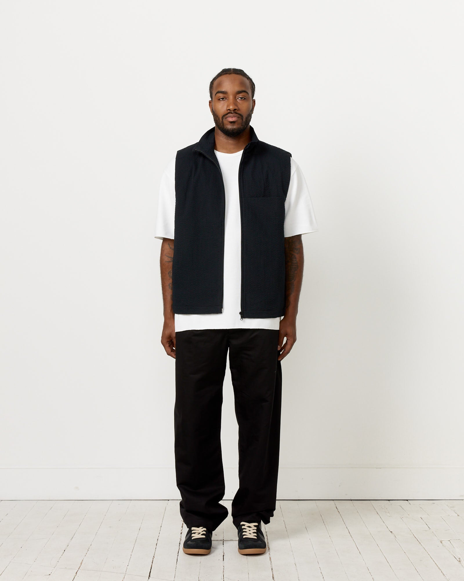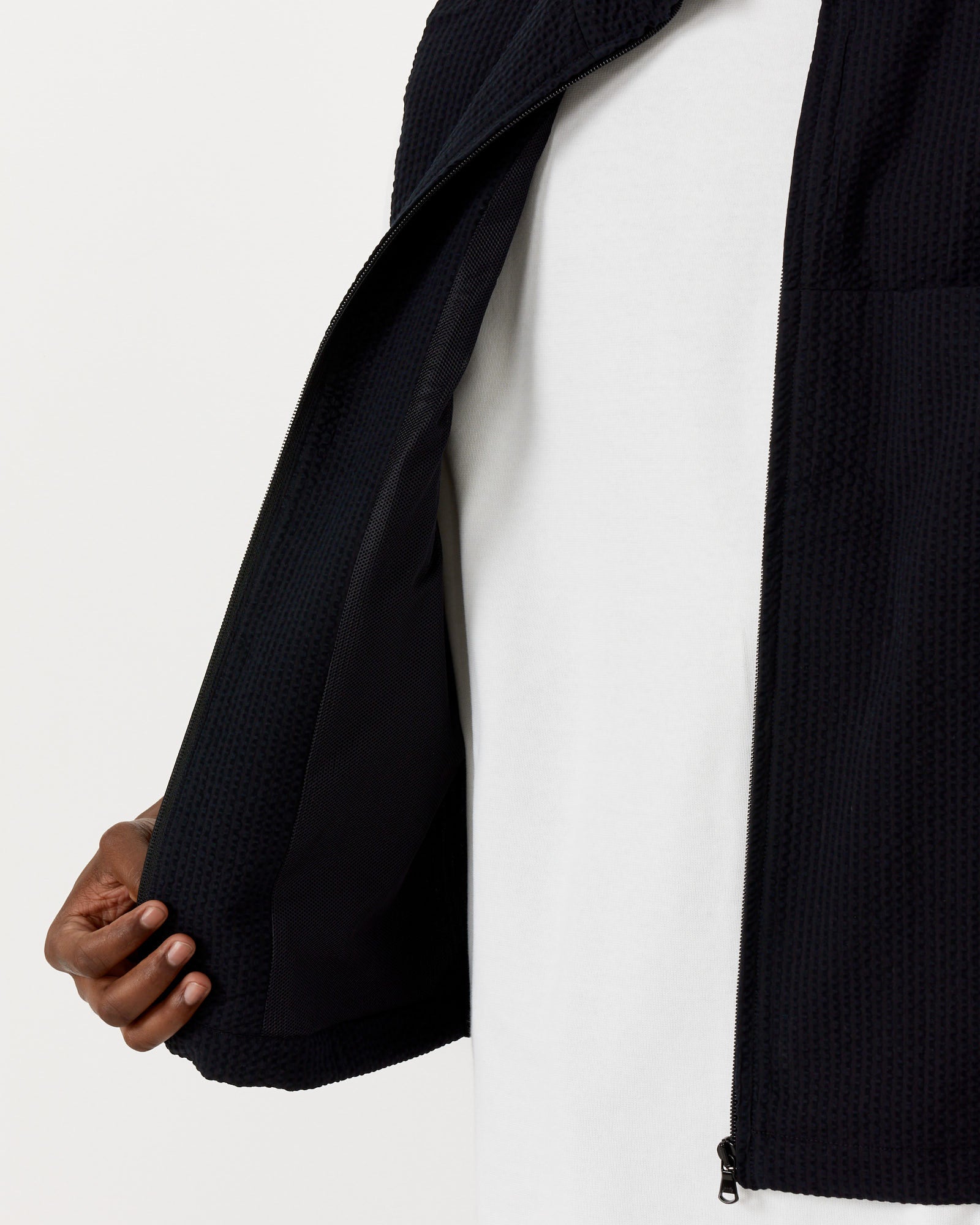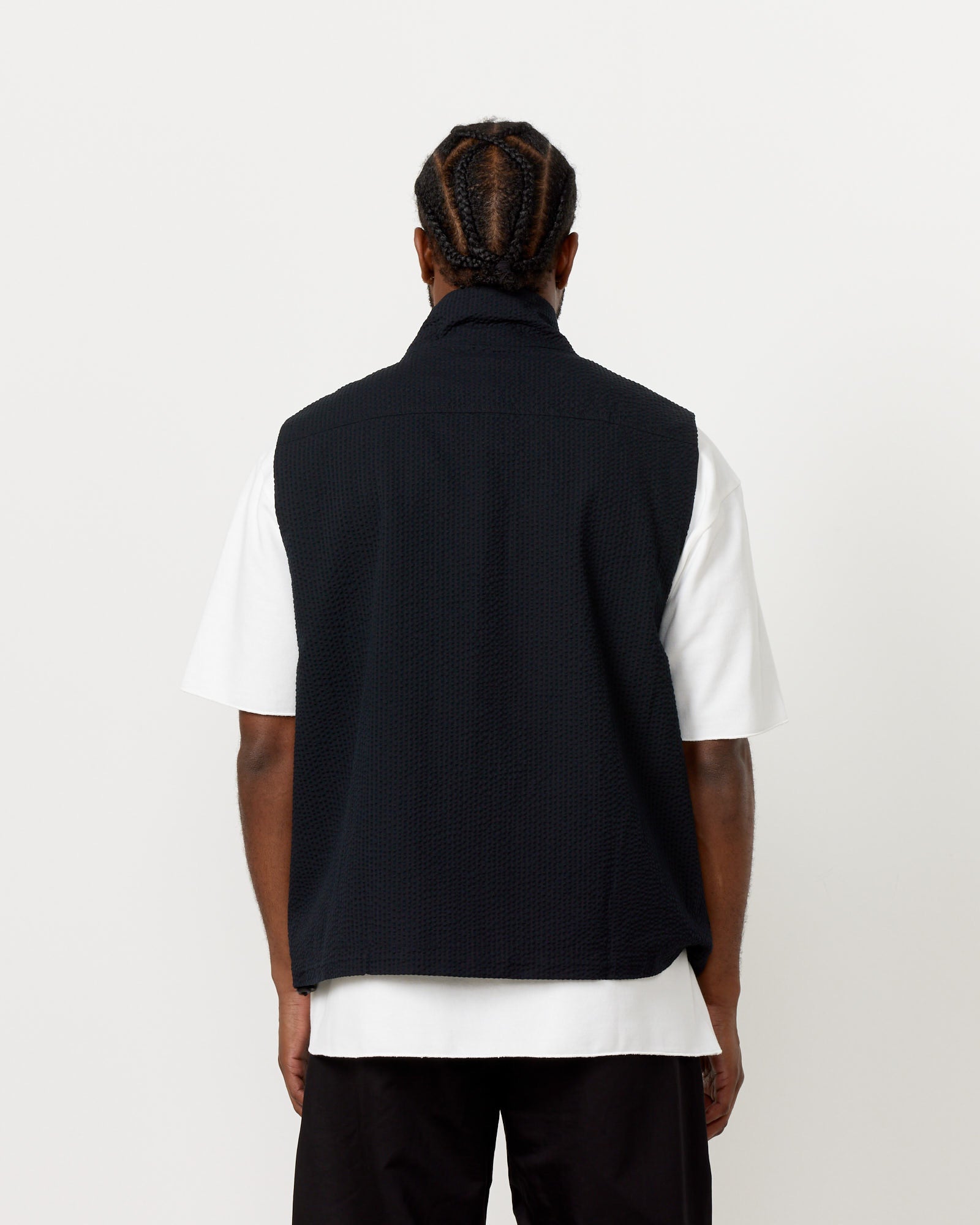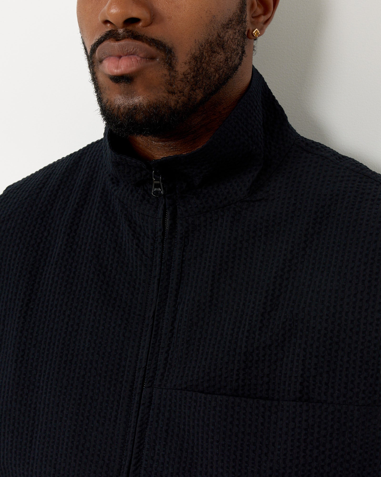 Arpenteur's Full Zip Track Vest steers an athletic silhouette into elevated territory with a crisp cotton-blend seersucker fabric cut in a boxy fit with a stand collar, full-zip closure, and a pocket at the chest.