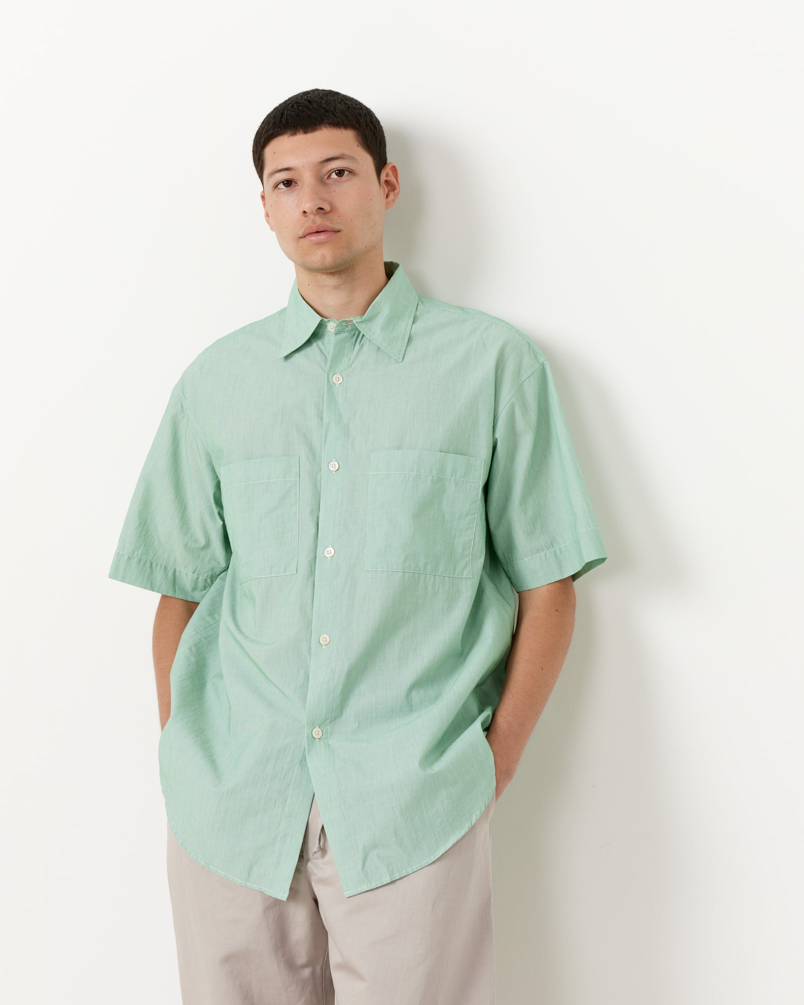Crafted from a mini seersucker weave with a subtle texture, Arpenteur's Stereo Shirt is cut in a wide silhouette and features chest pockets, a back pleat, French seam construction, and mother-of-pearl buttons.