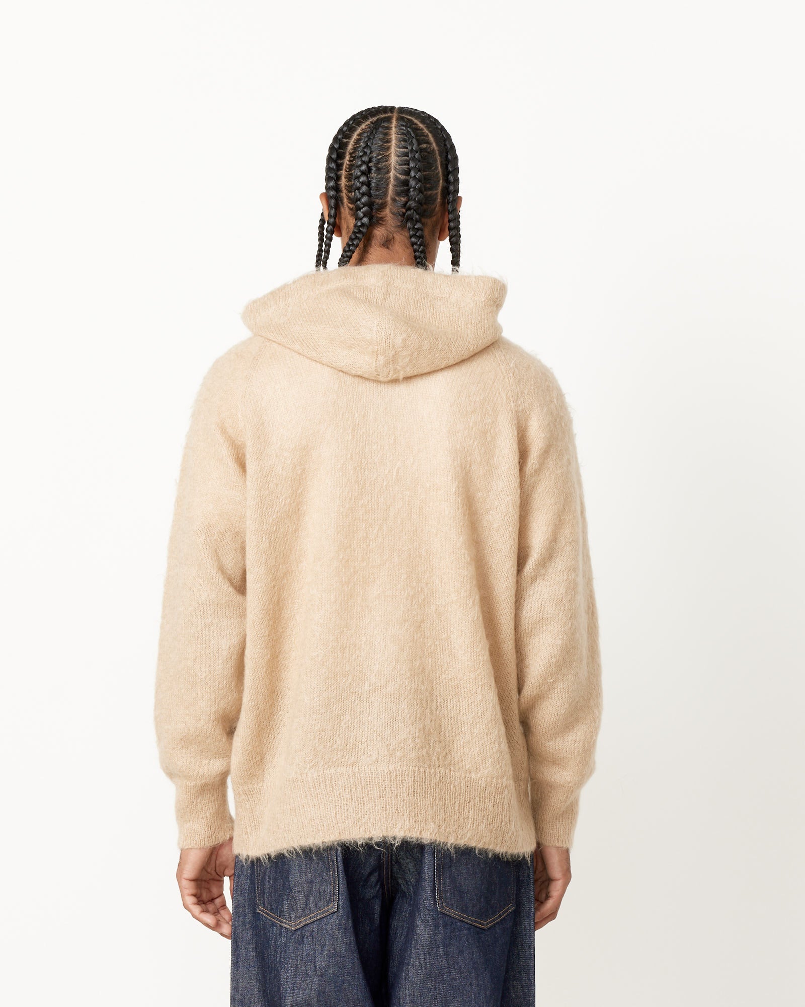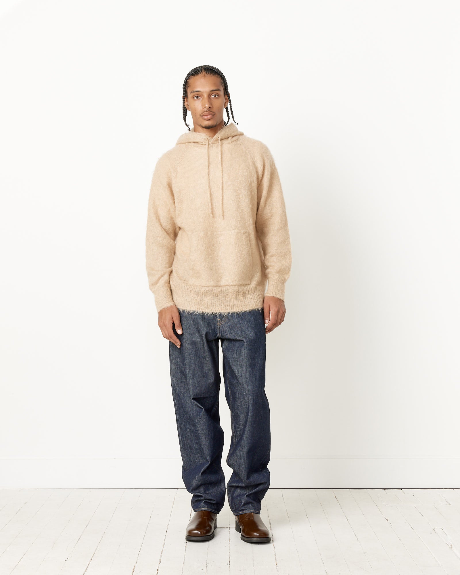 A person with braided hair wears the Auralee Brushed Mohair Knit Hoodie in beige, styled with dark blue jeans, and stands against a plain white background.