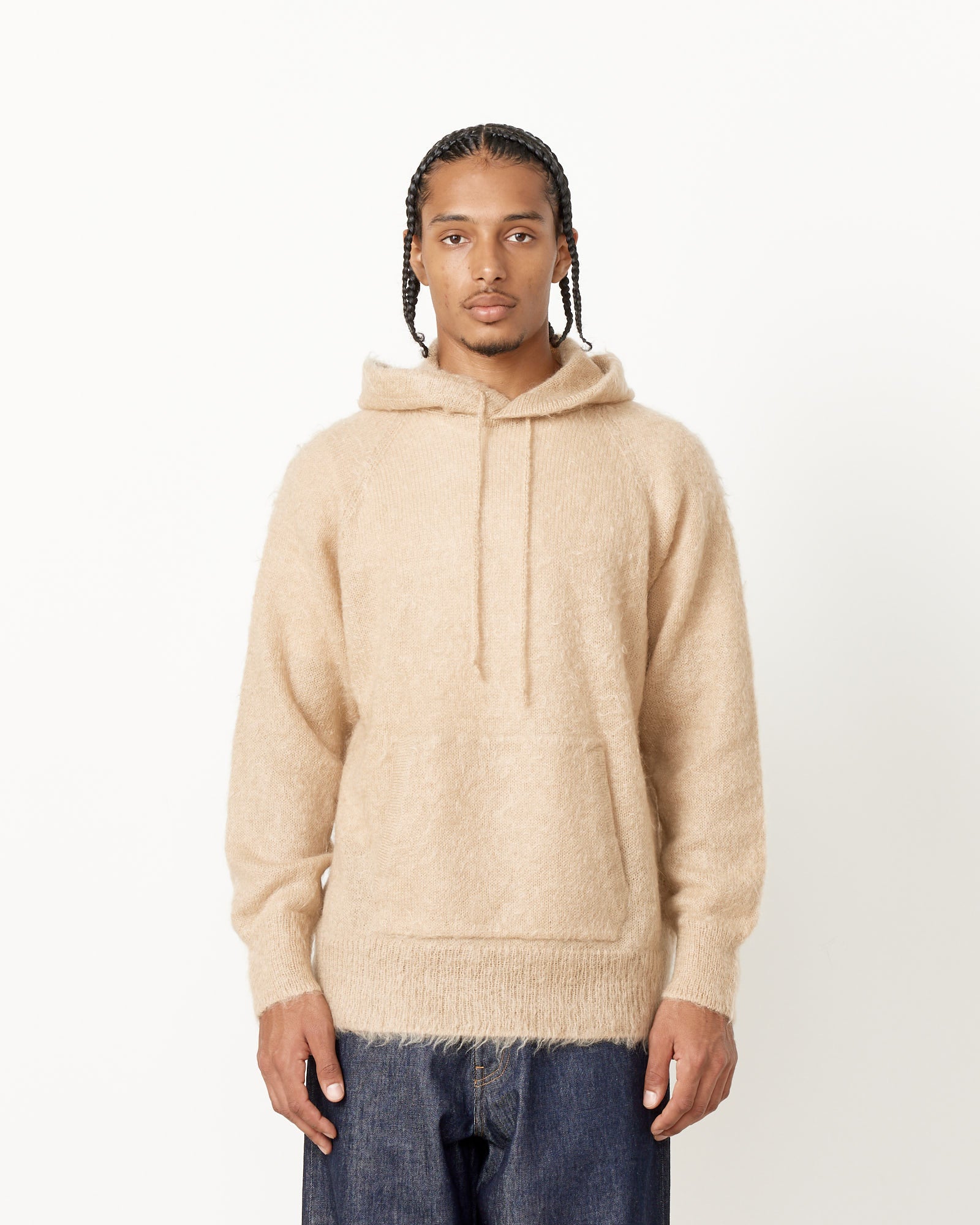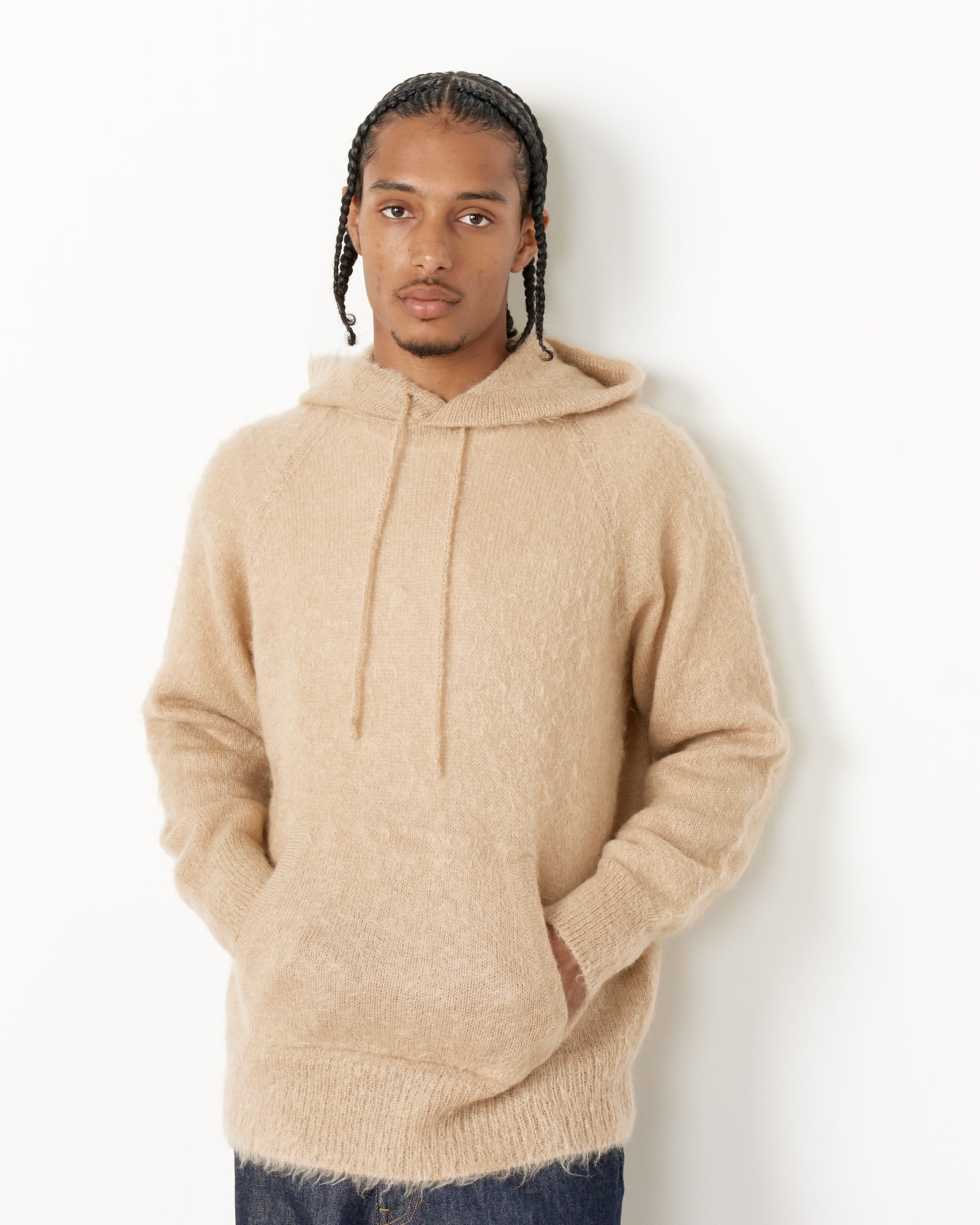 Auralee's Brushed Mohair Knit Hoodie provides a luxe look and feel with a brushed blend of kid mohair and wool, and features a twisted-knit construction, a fixed hood with drawstring adjustment, rib-knit cuffs and hem, and a kangaroo pocket.