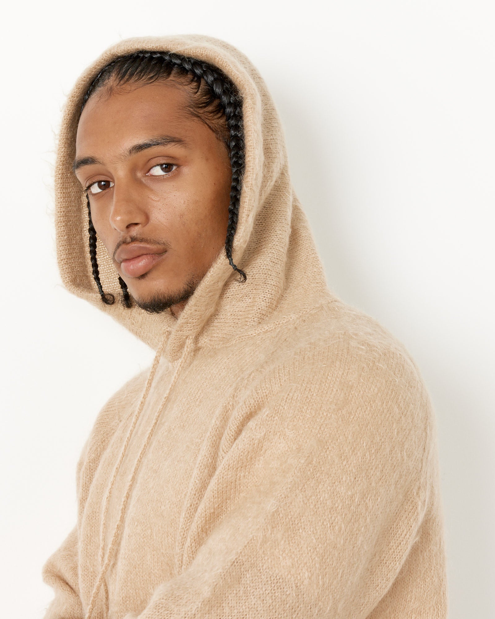 A young man with braided hair wears the Auralee Brushed Mohair Knit Hoodie in beige with drawstrings and dark jeans, standing against a plain white background with his hands in the front pocket.
