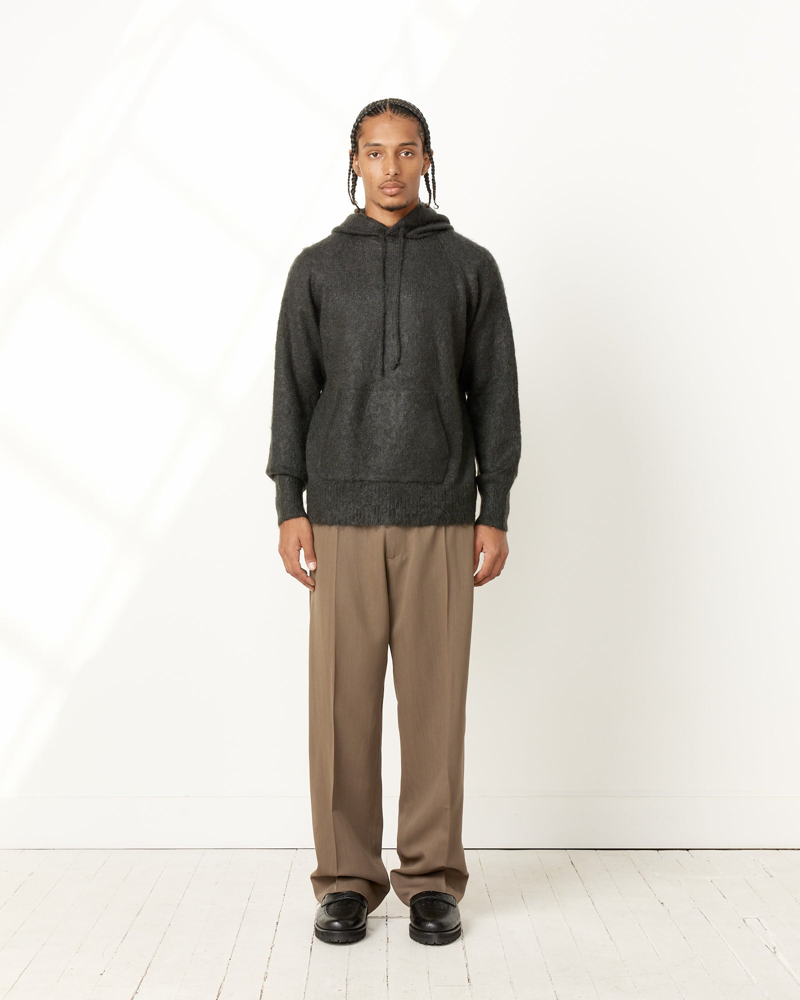 A man stands indoors against a white wall, wearing Auralee’s Brushed Mohair Knit Hoodie in dark gray with loose brown trousers and black shoes. He faces forward with a neutral expression and relaxed posture.