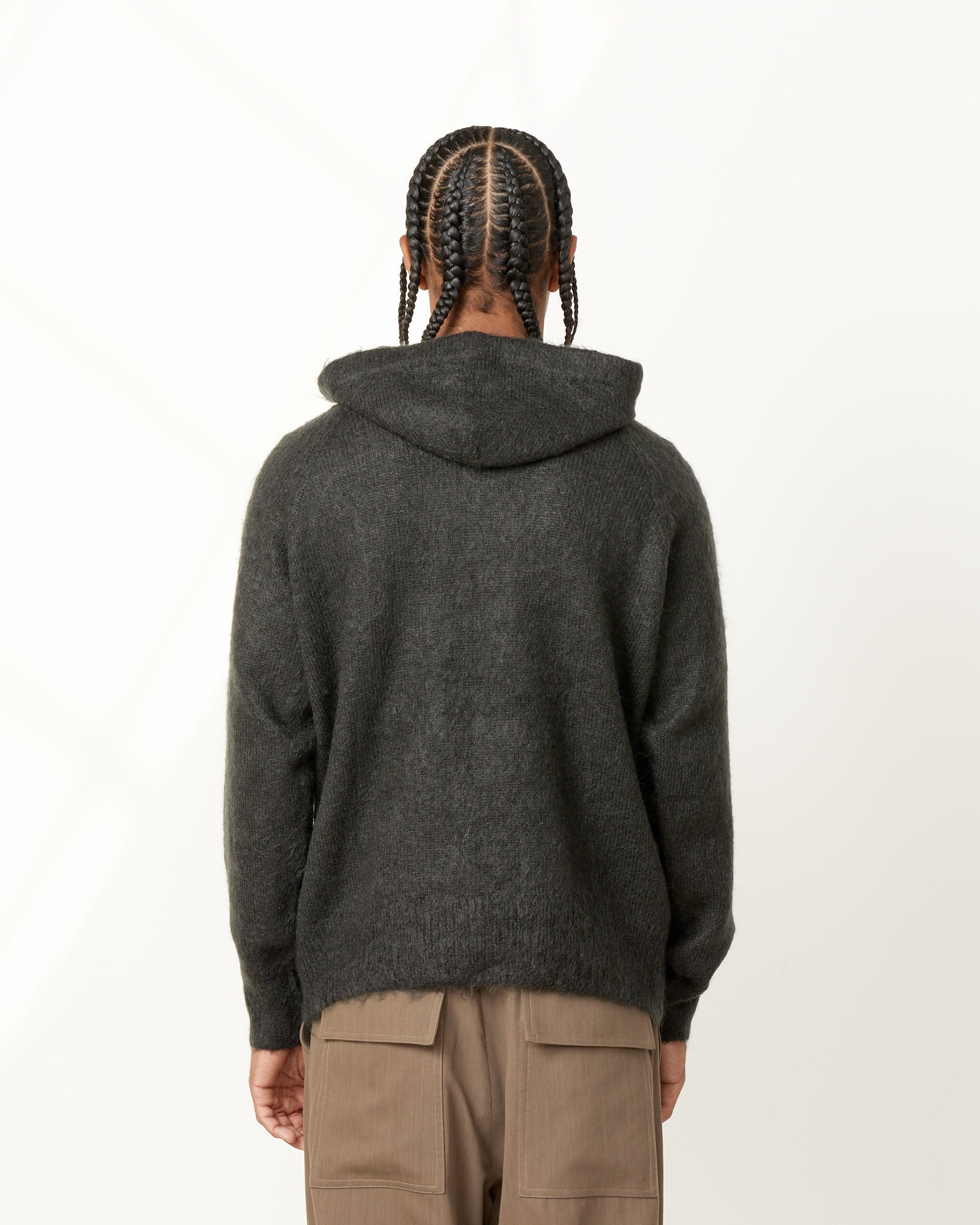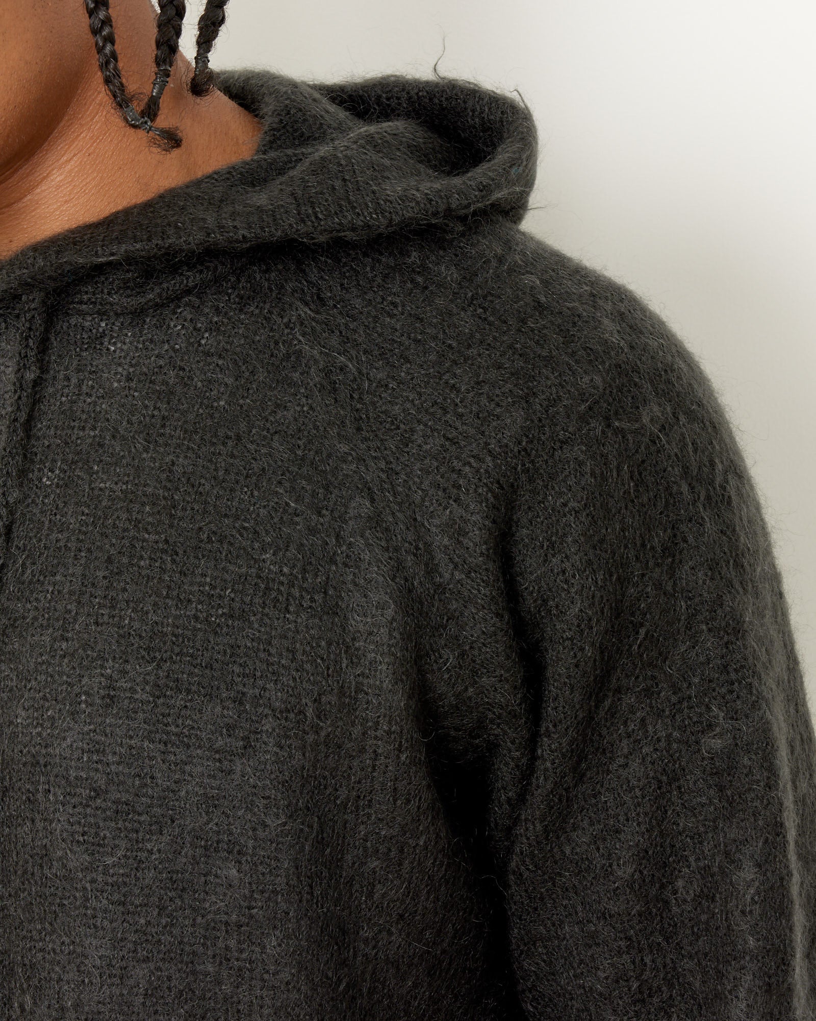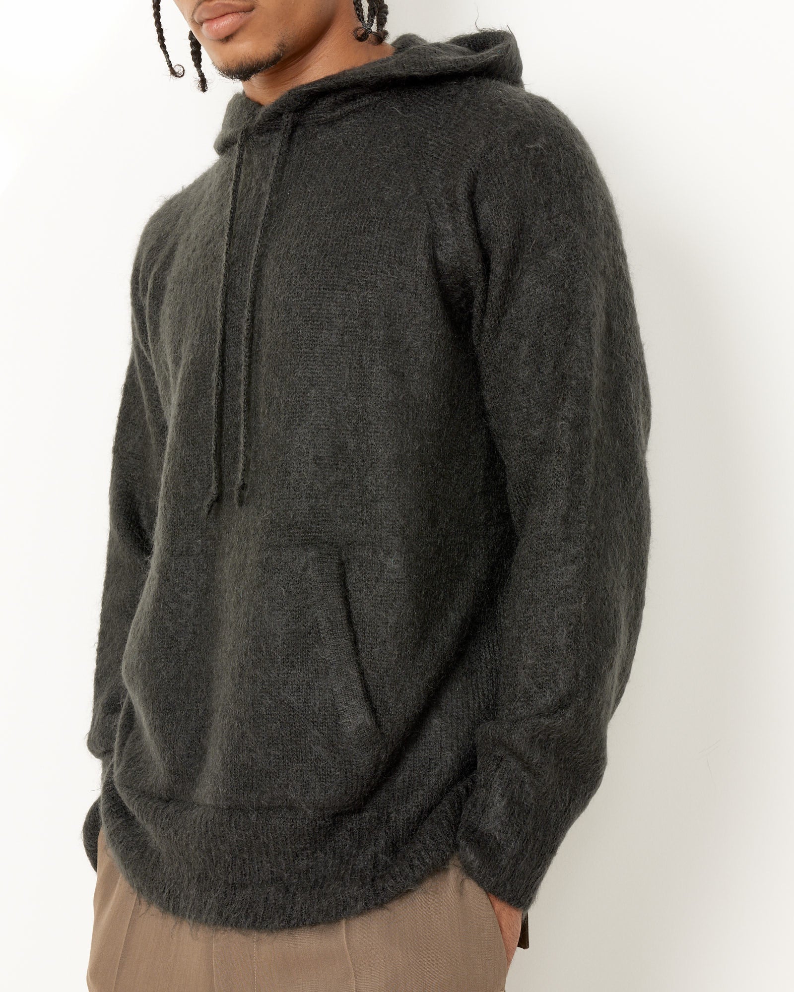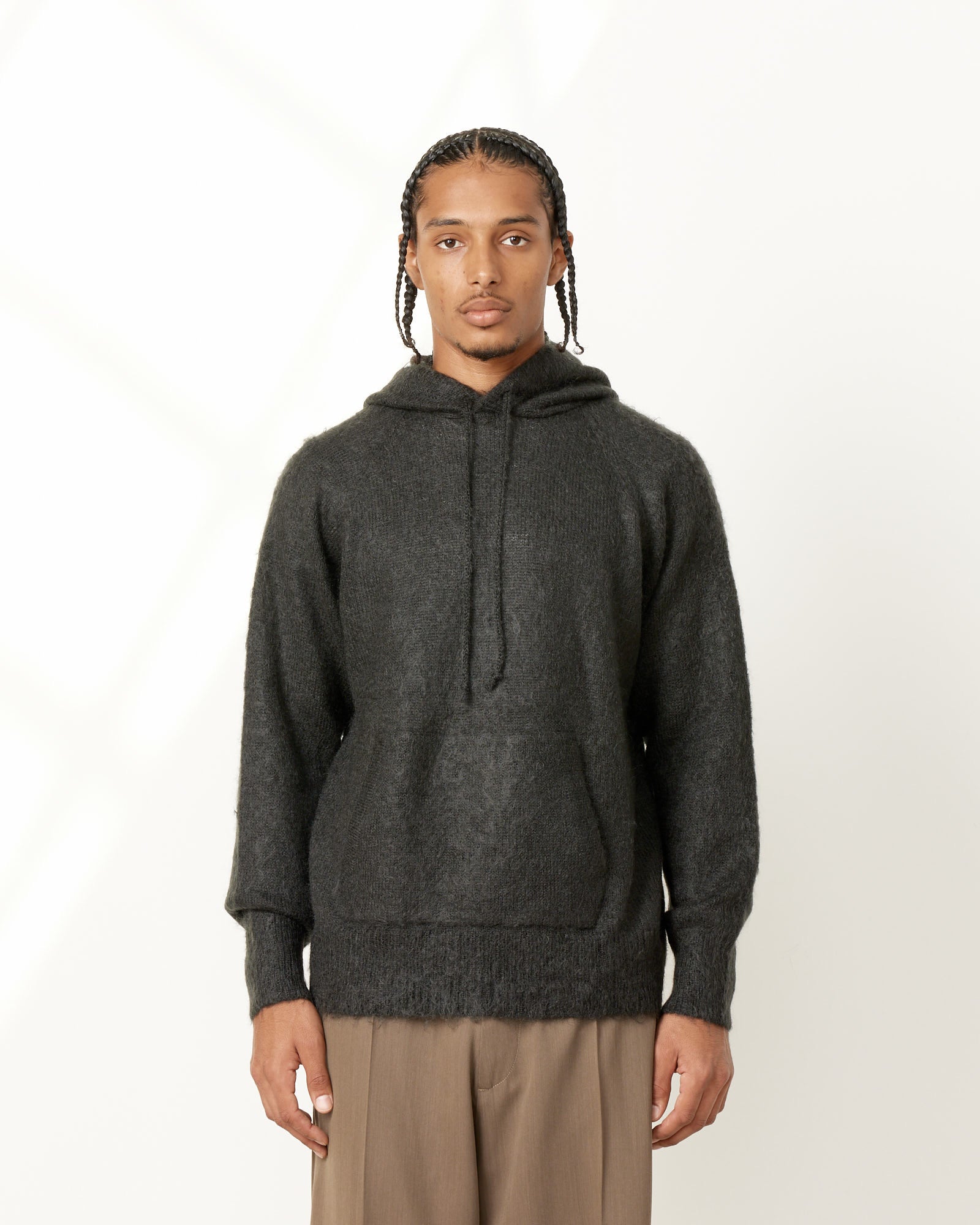 A person wearing the Auralee Brushed Mohair Knit Hoodie in dark gray, featuring a front pocket and drawstrings, paired with light brown pants, stands against a plain white background.