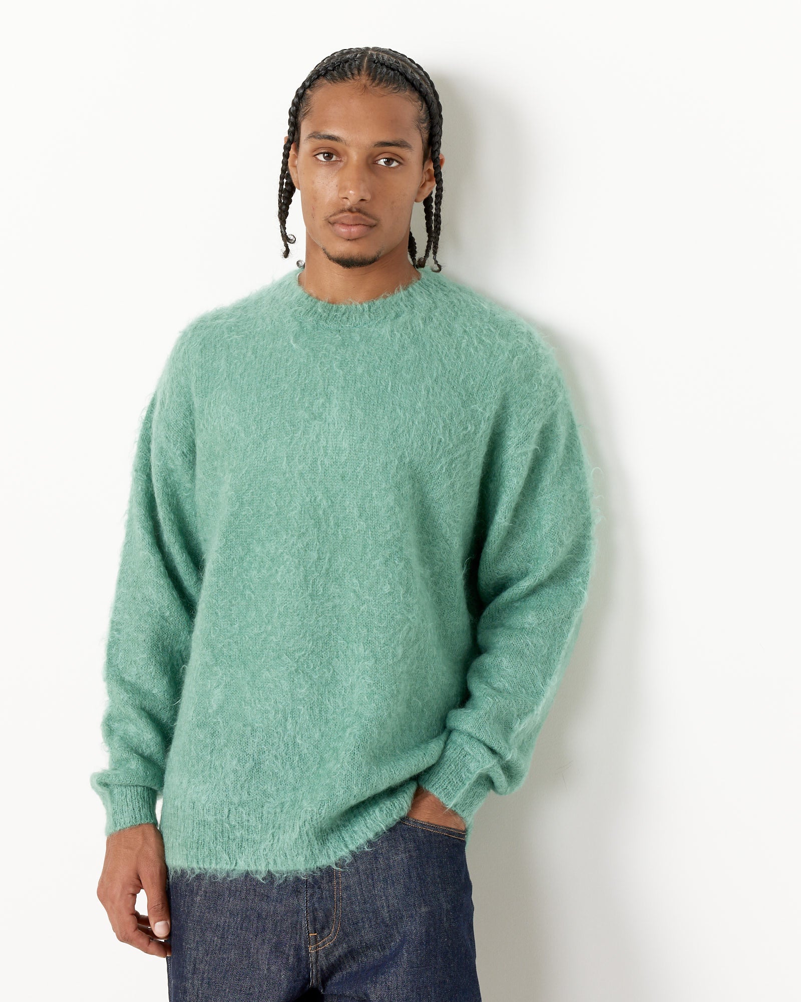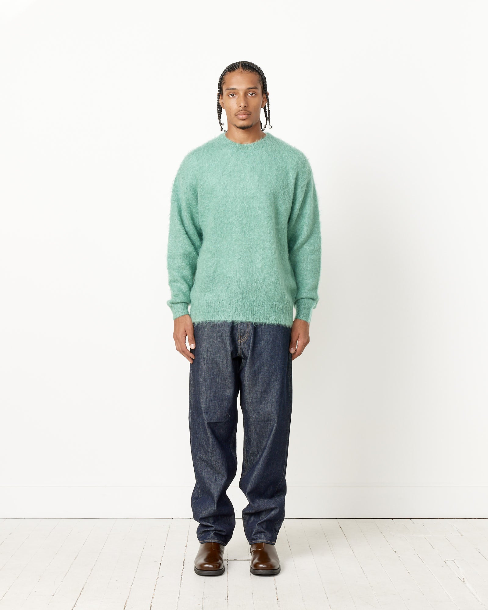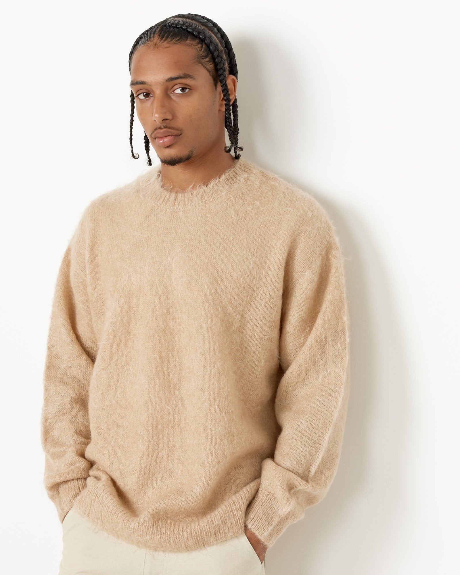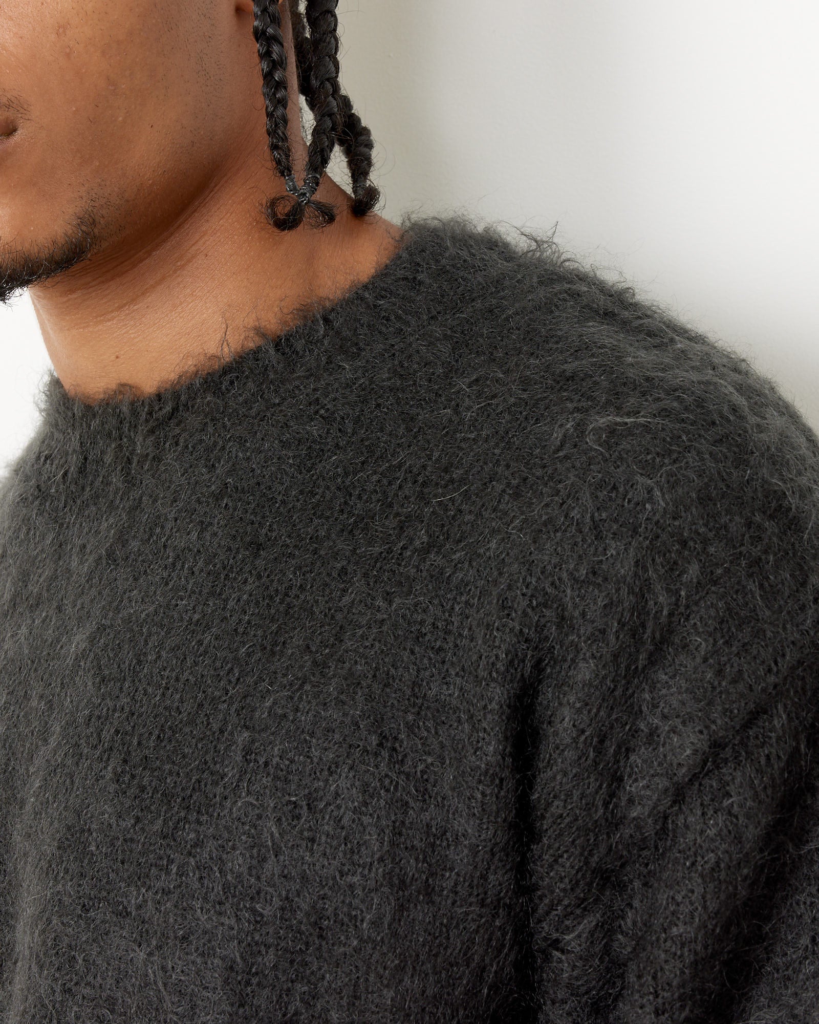 Auralee's Brushed Mohair Knit Pullover provides a luxe look and feel with a brushed blend of kid mohair and wool, and features a twisted-knit construction with rib-knit trim at the collar, hemline, and cuffs.
