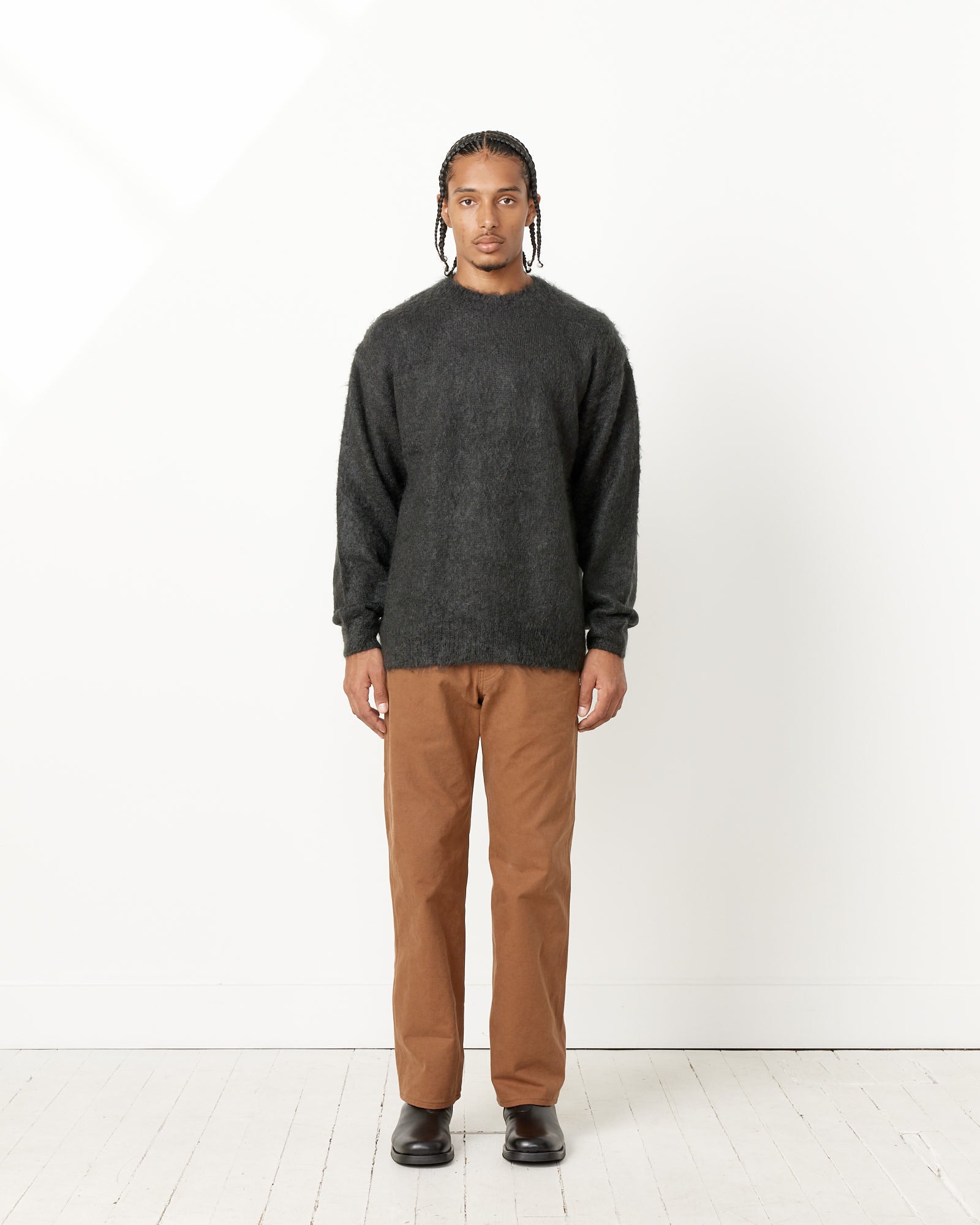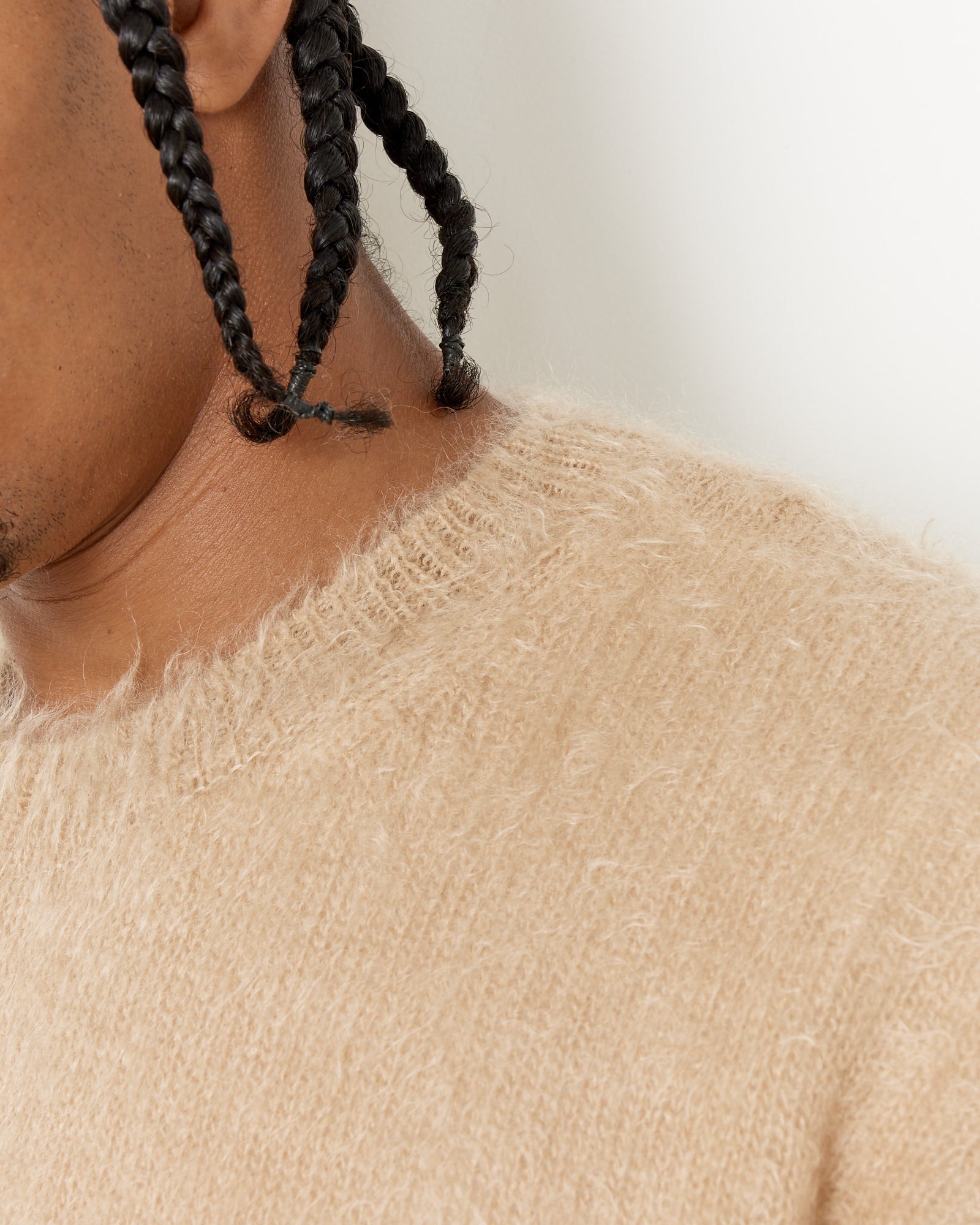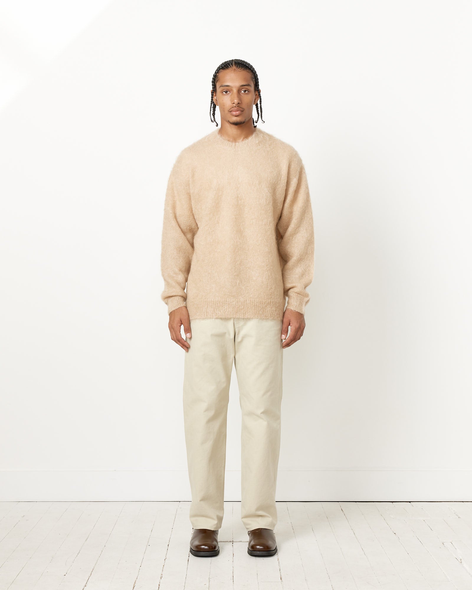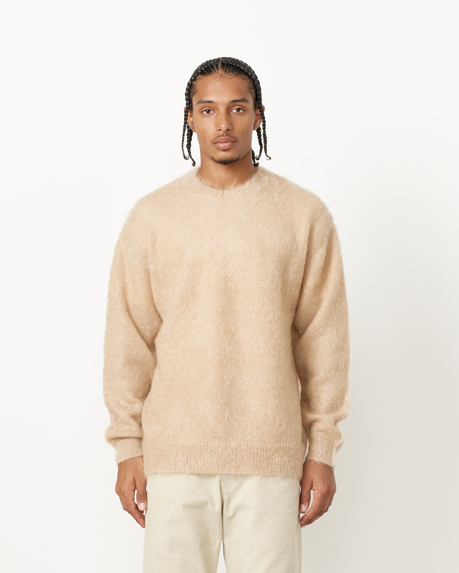 Auralee's Brushed Mohair Knit Pullover provides a luxe look and feel with a brushed blend of kid mohair and wool, and features a twisted-knit construction with rib-knit trim at the collar, hemline, and cuffs.