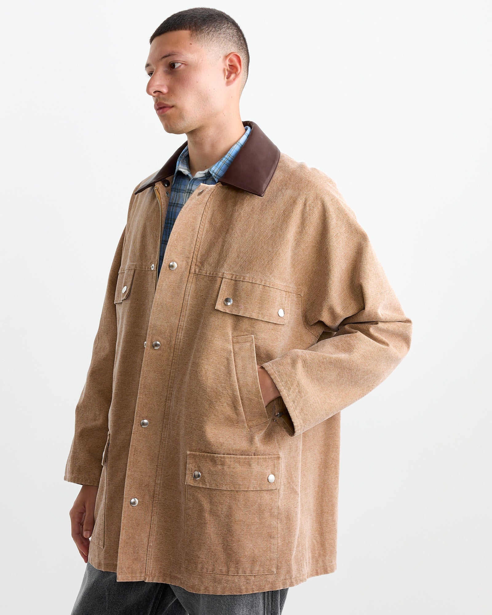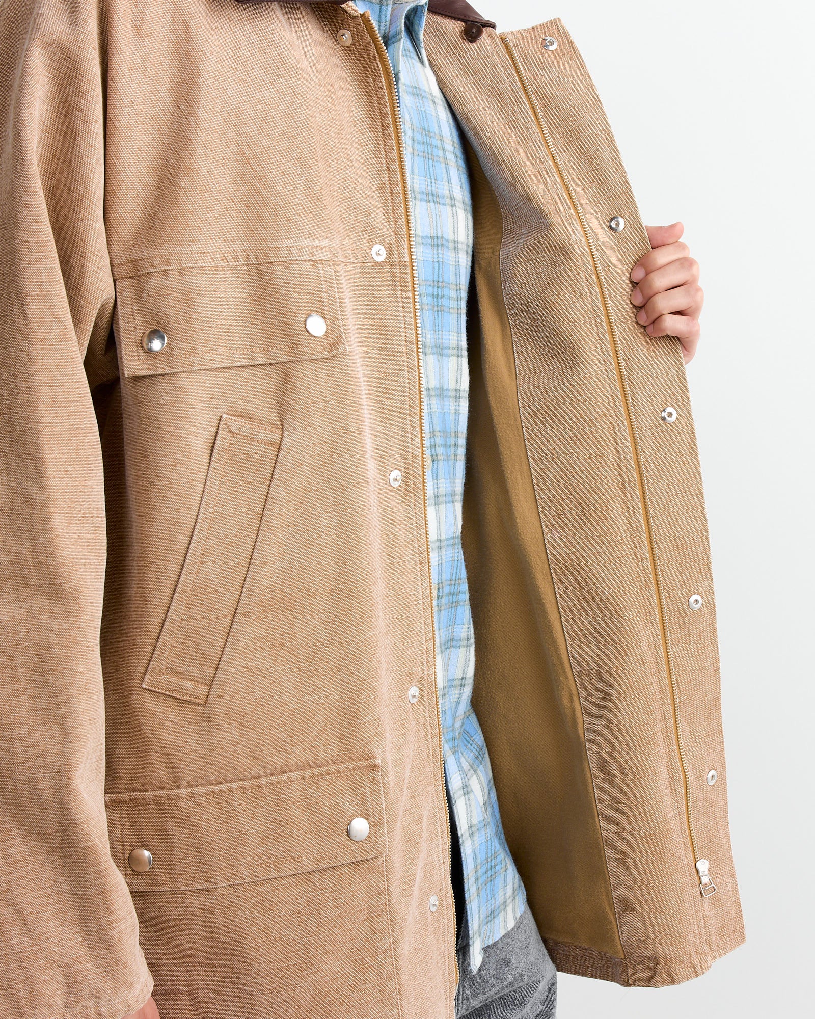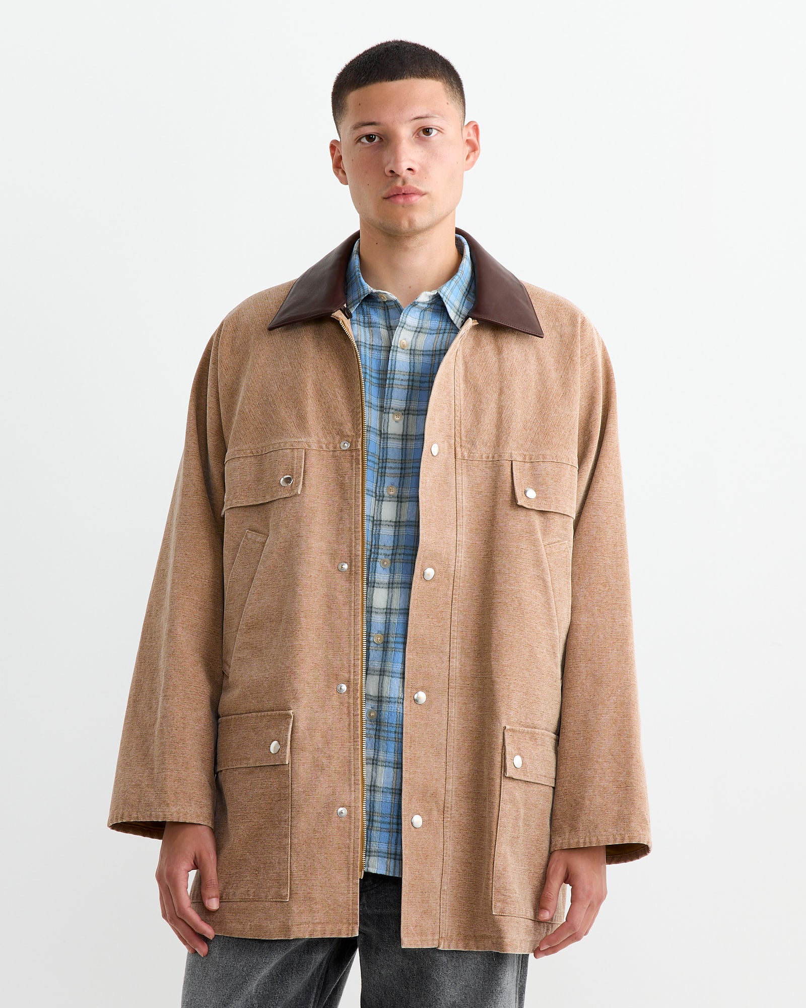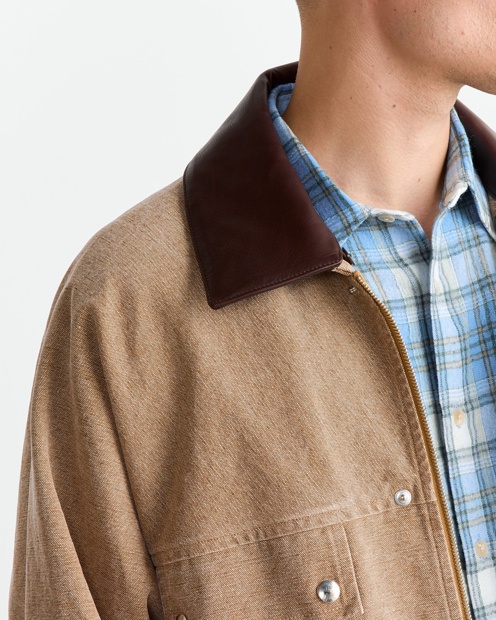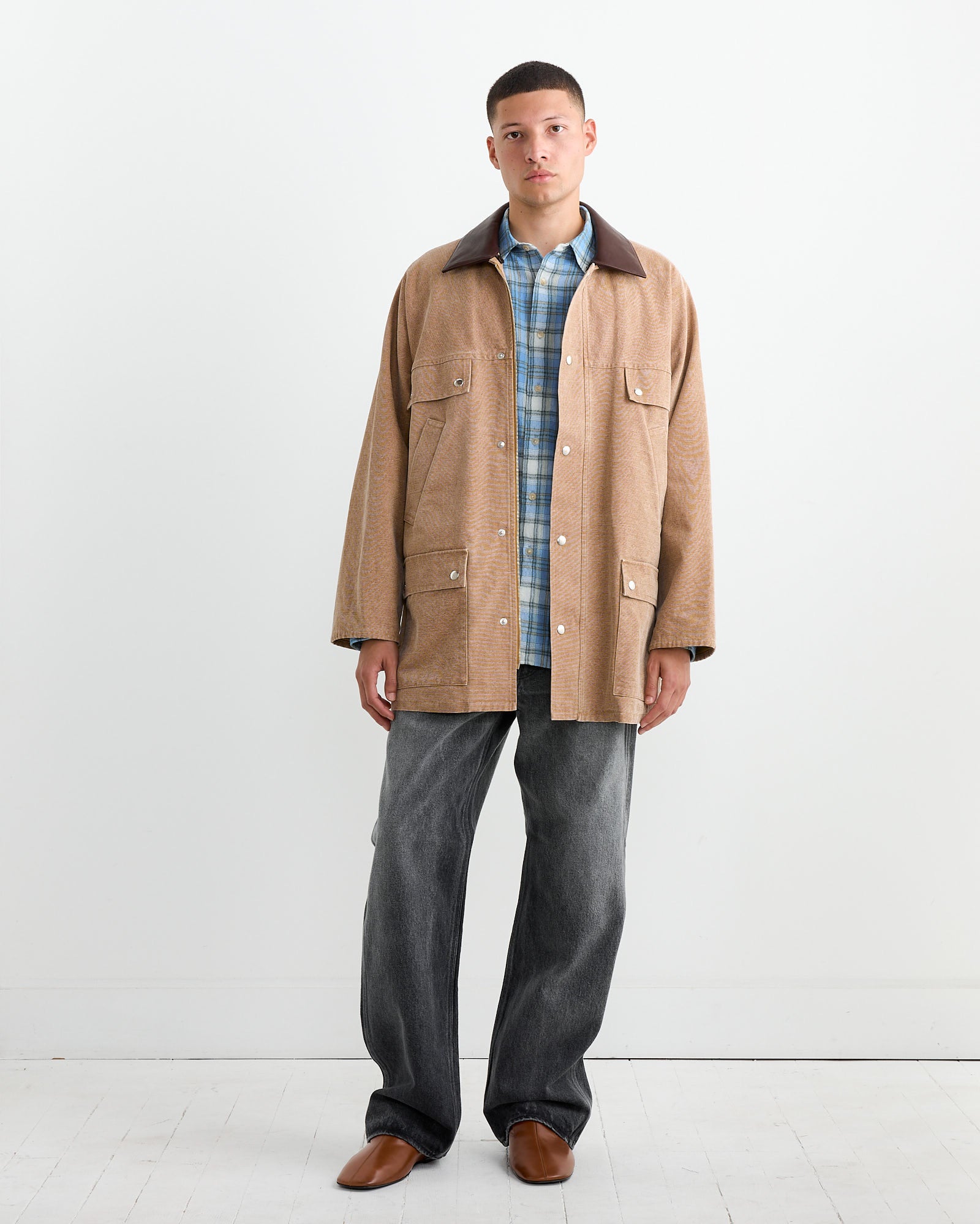 The Auralee Canvas Hunting Blouson in Light Brown offers a unique blend of rugged utility and sophisticated design. Made from high-density organic cotton canvas, it features a detachable leather collar, full lining, and zippered cuffs, all crafted to enhance both functionality and style. The jacket’s washed and beaten finish gives it a vintage-inspired, textured look, making it a versatile outerwear piece.