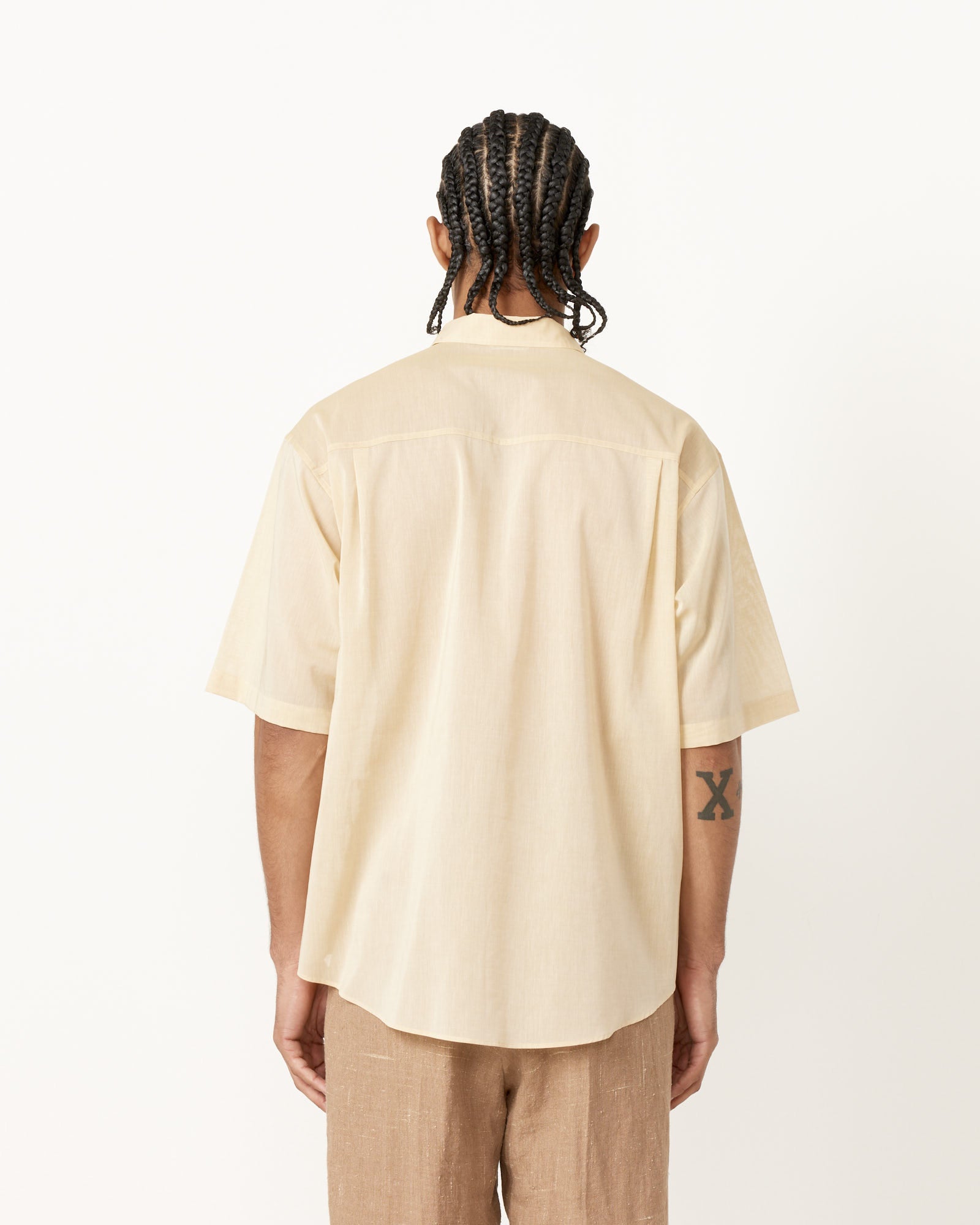 Shea is 6'2" with a 30" waist, 36" chest, 34" inseam, and 11.5 US shoe. Shea is wearing the Organdy Shirt in size 4. Size 3 = Men's XS | Size 4 = Men's S | Size 5 = Men's M