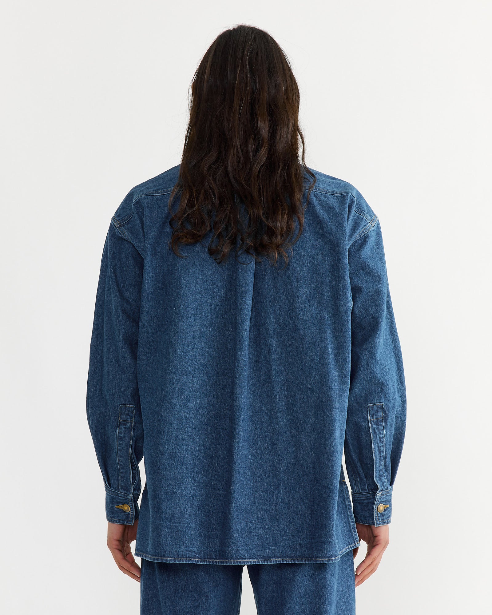 The AURALEE Selvedge Denim Shirt is made from lightweight selvedge denim woven on a rare vintage shuttle loom, emphasizing traditional craftsmanship. This fabric offers a soft, comfortable feel with a fade achieved through specialized product processing.