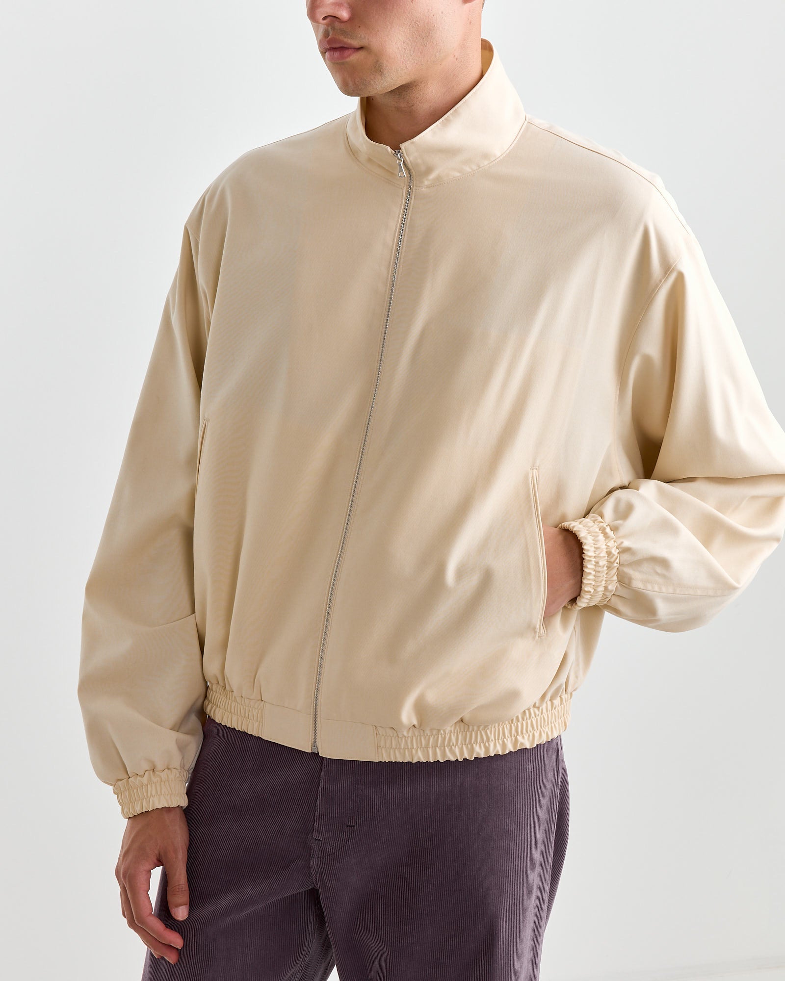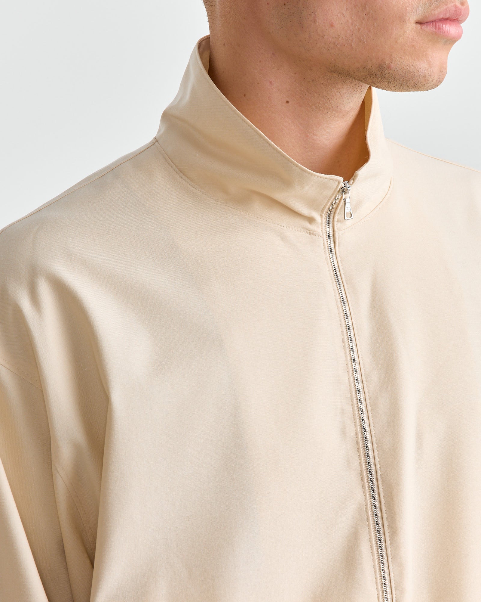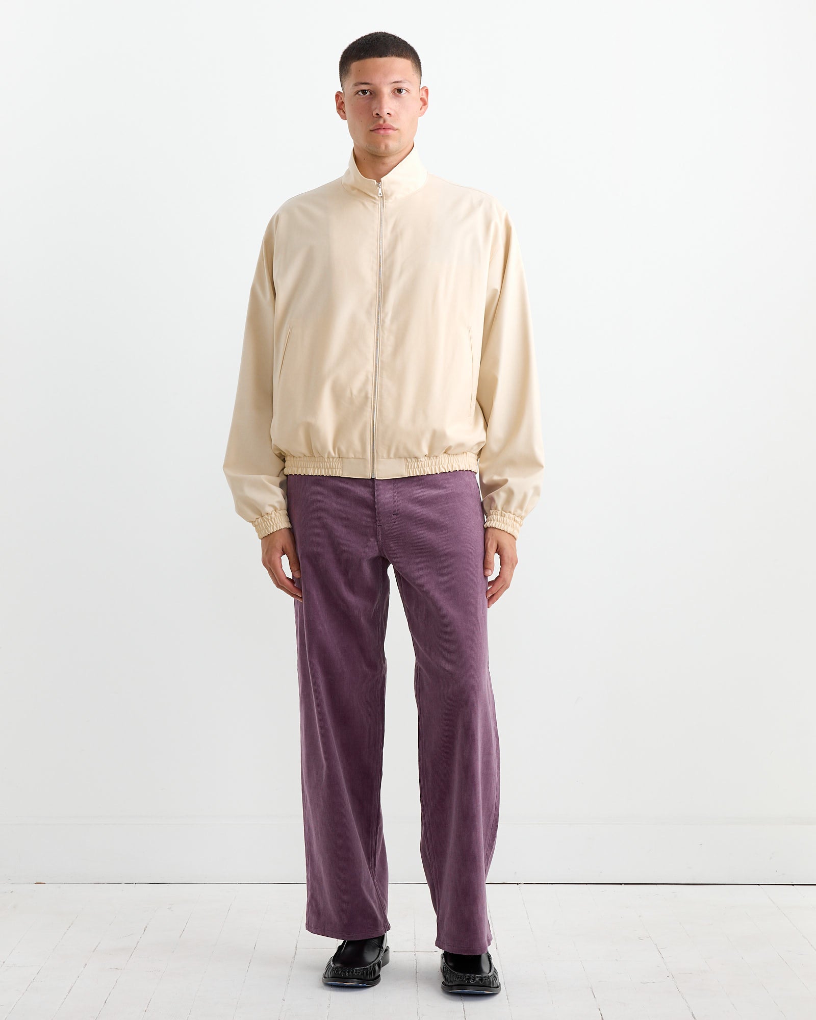 The Auralee Super Fine Tropical Wool Zip Blouson in Ivory Beige is crafted from a tropical wool fabric using ultra-fine Super180's wool yarn woven at a high density. This process results in a fabric that has a smooth texture and a beautiful sheen, providing a luxurious feel against the skin. The blouson features an oversized fit, a full lining, and a zip-up closure, making it both comfortable and stylish.