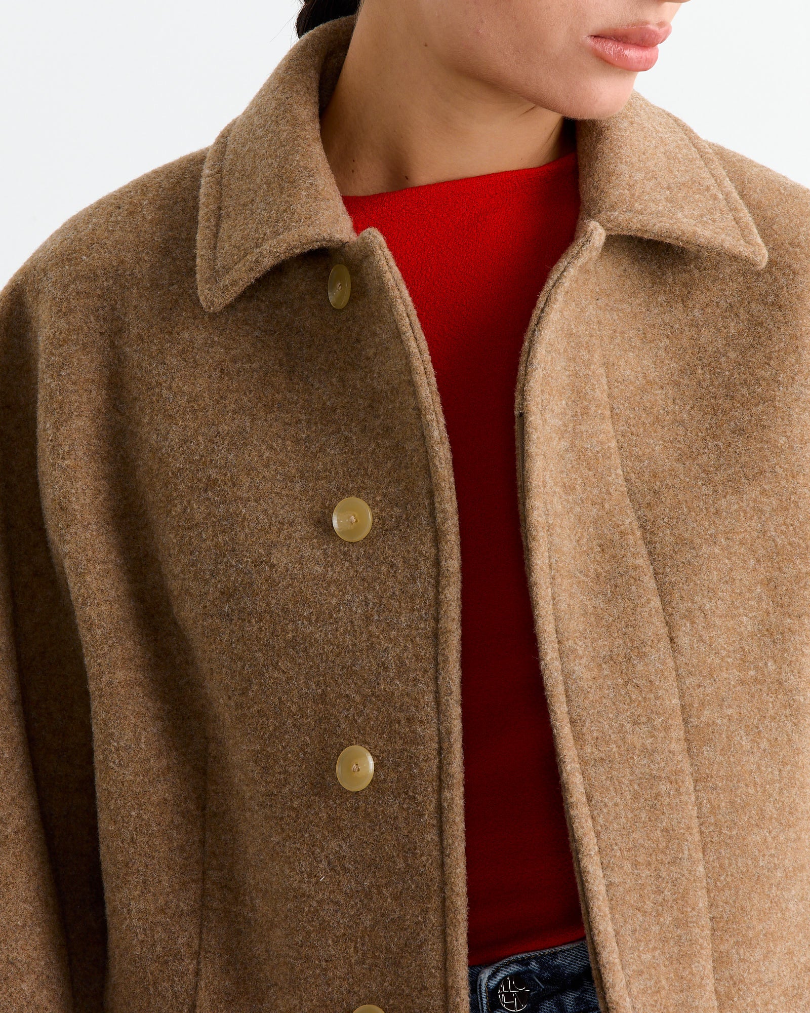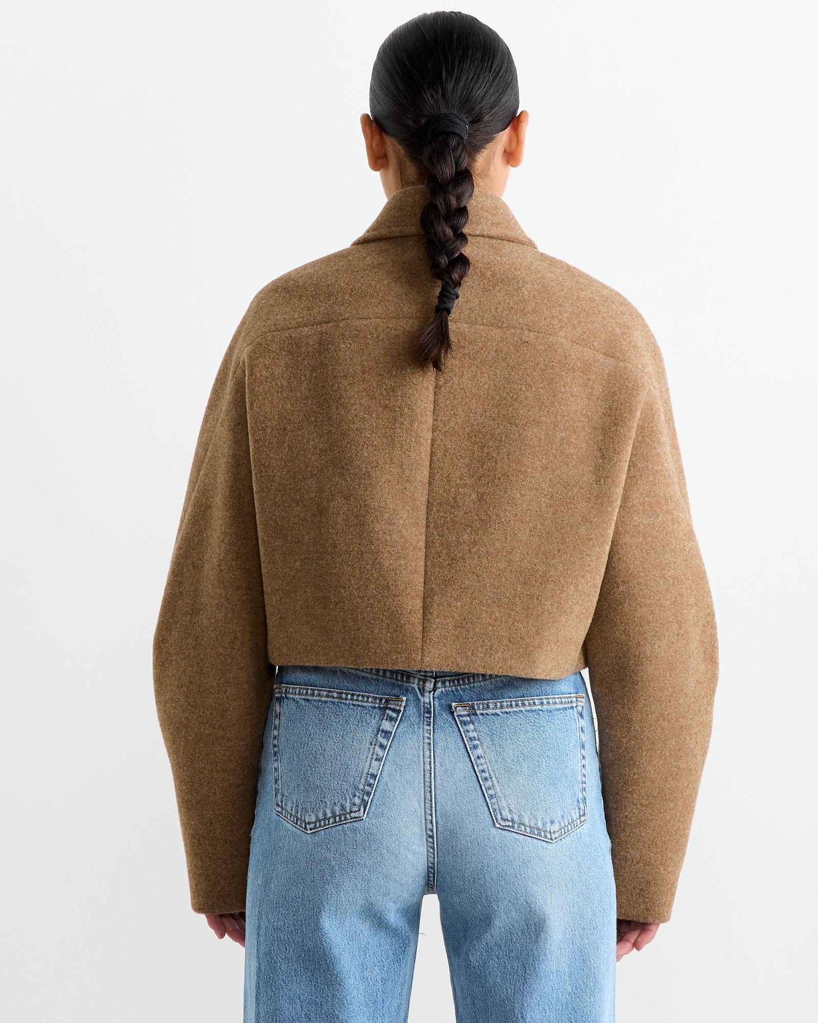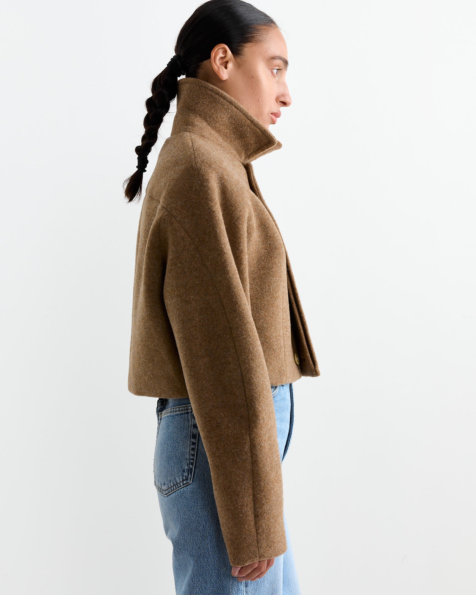 The Auralee Wool Melton Short Blouson in Top Brown is a cropped jacket crafted from Super 120's wool melton, known for its sponge-like texture and elasticity. The jacket features a concealed front closure, dolman sleeves, and a boxy silhouette, offering both warmth and a relaxed fit. Fully lined, it pairs well with high-waisted styles for a modern look.