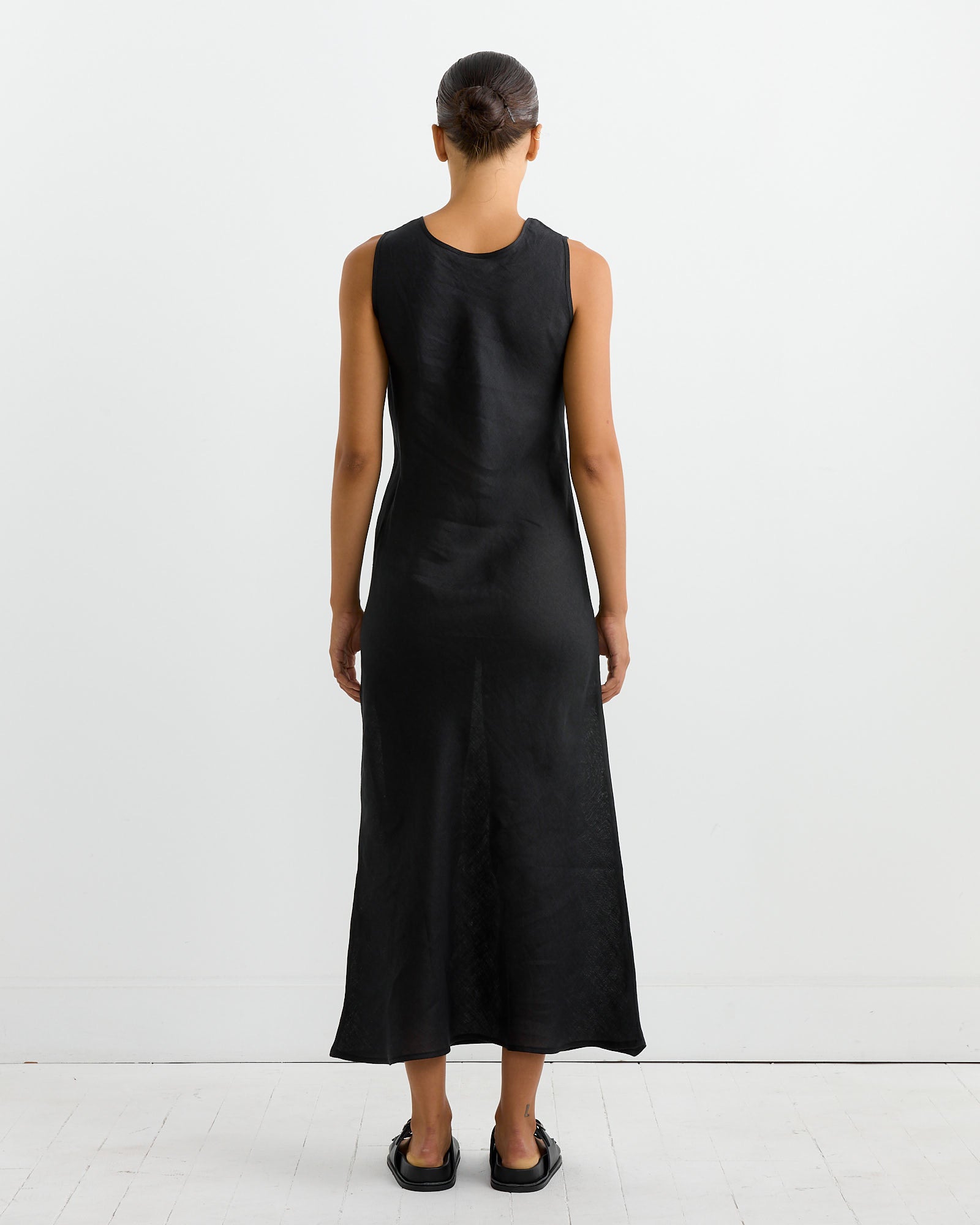 The Baserange Dydine Heart Tank Dress in Black is a finely tailored piece made from 100% linen. This bias-cut slip dress features a heart-shaped embroidery with a cut-out detail at the front, adding a playful yet elegant touch to its minimalistic design. It is designed for a relaxed fit, perfect for casual or special occasions. The dress has adjustable straps, making it versatile and comfortable to wear.