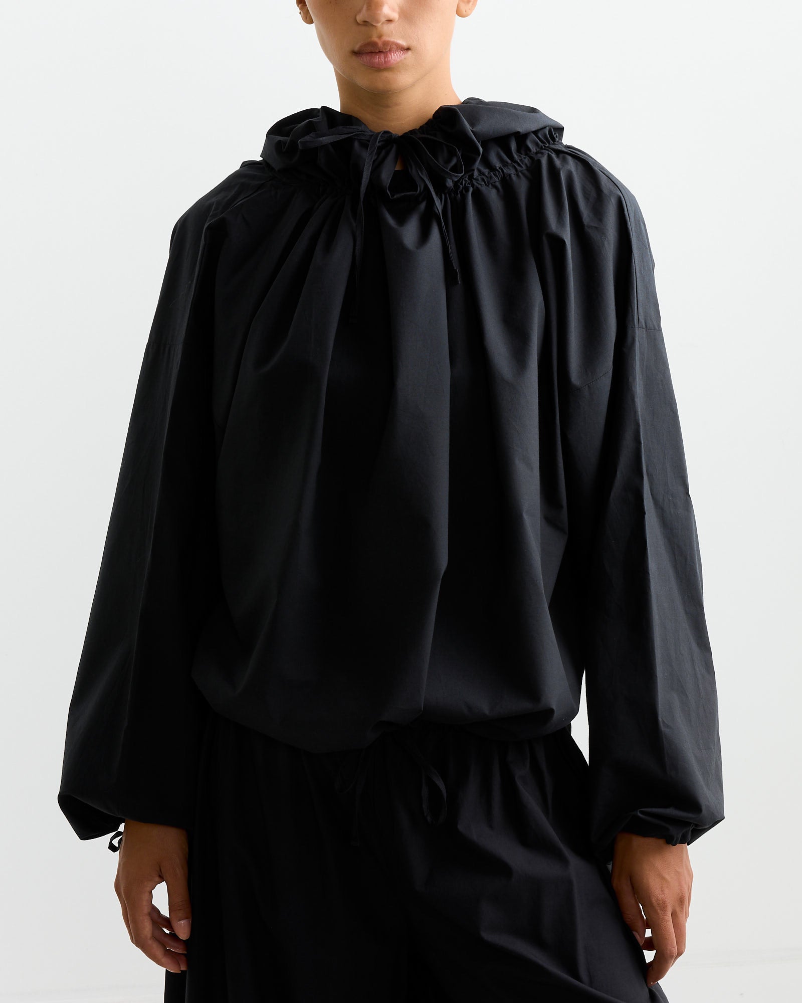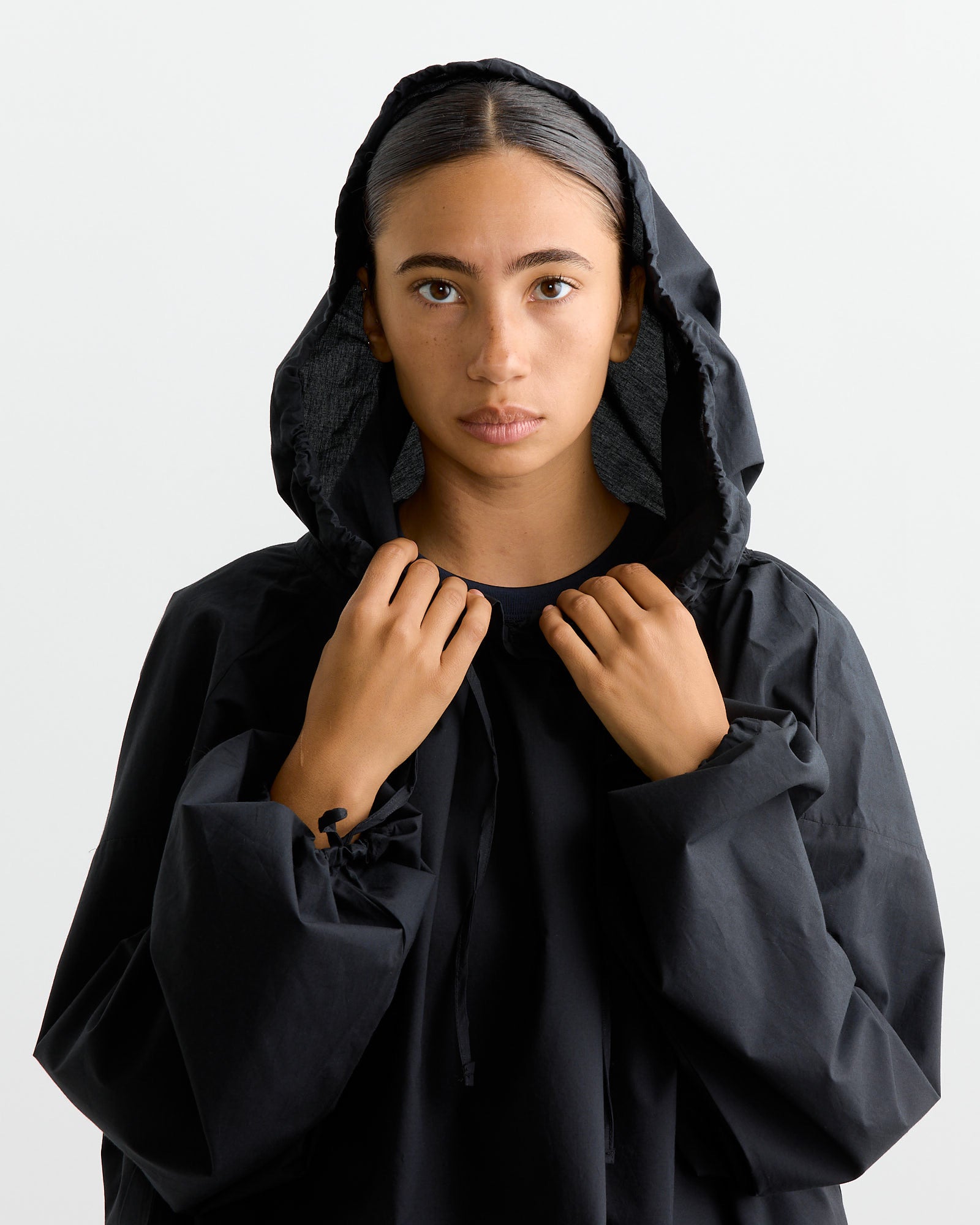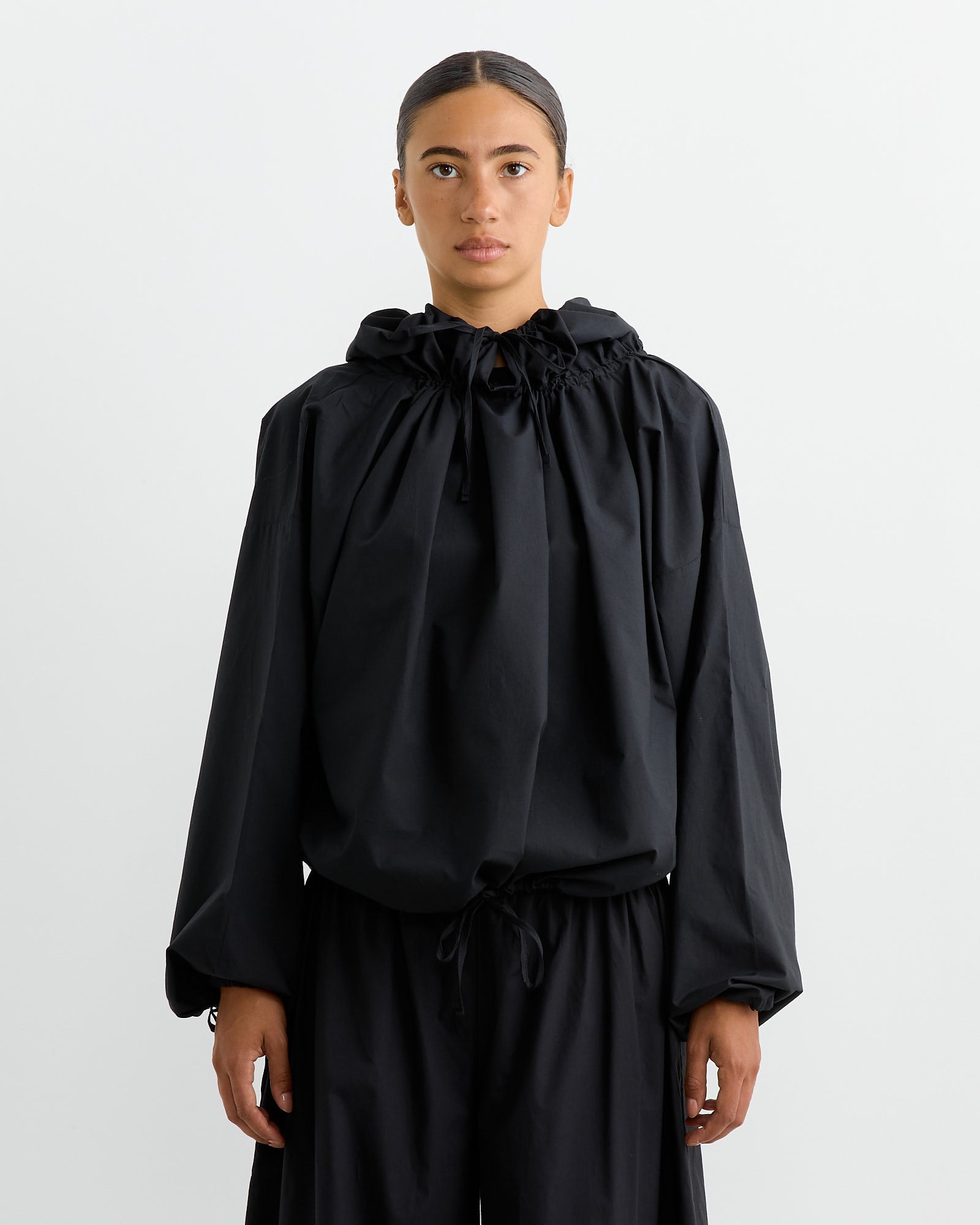 The Baserange Point Top in Black is crafted from 100% organic cotton poplin, offering a lightweight and breathable fit. It features a versatile design with drawstrings at the hood, neck, cuffs, and hem, allowing for an adjustable, customizable look. This top is produced sustainably, adhering to GOTS, Oeko-Tex, and OCS 100 certifications, ensuring ethical production practices.