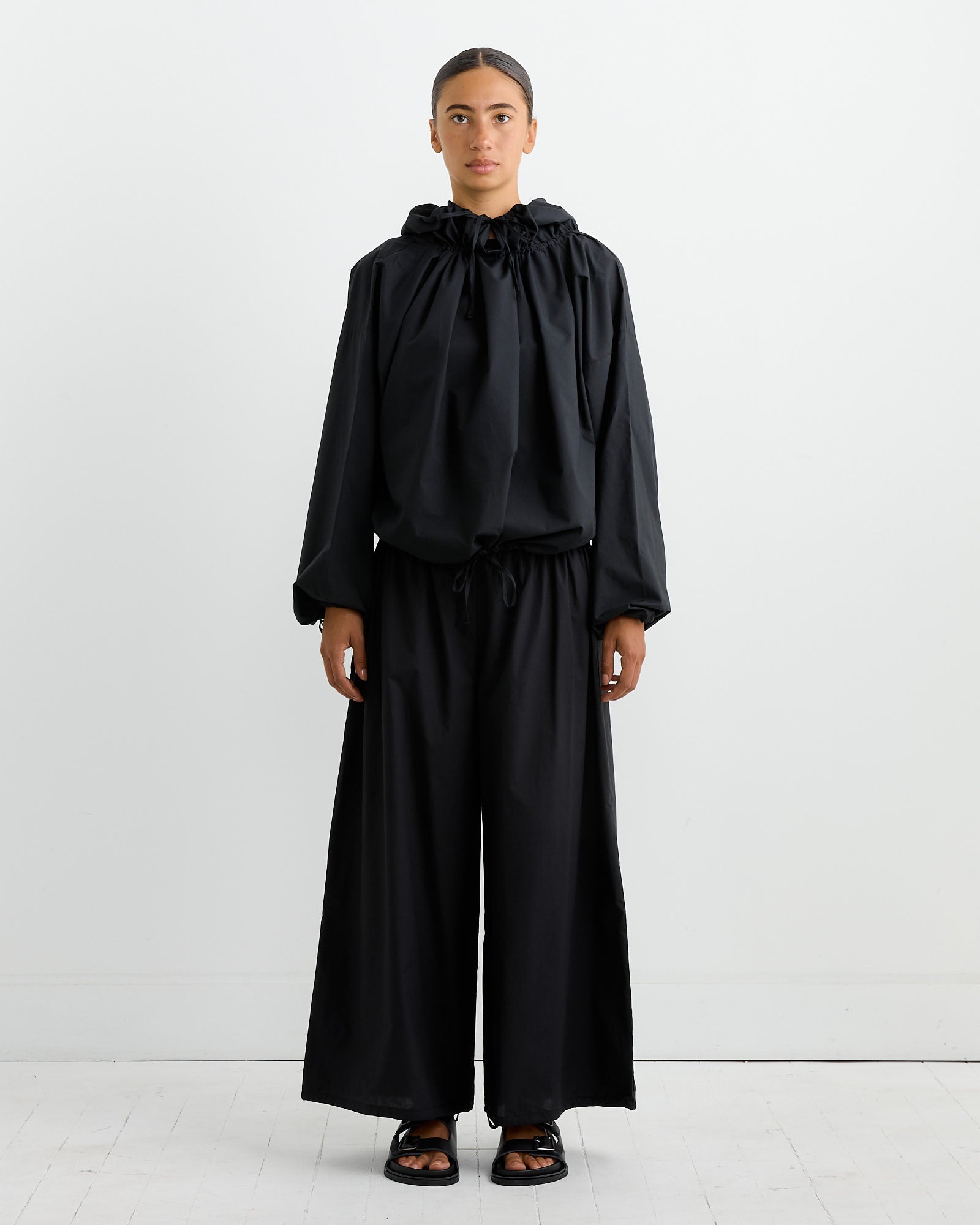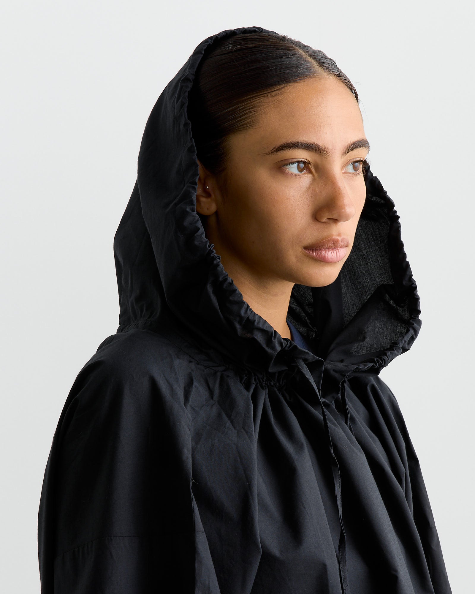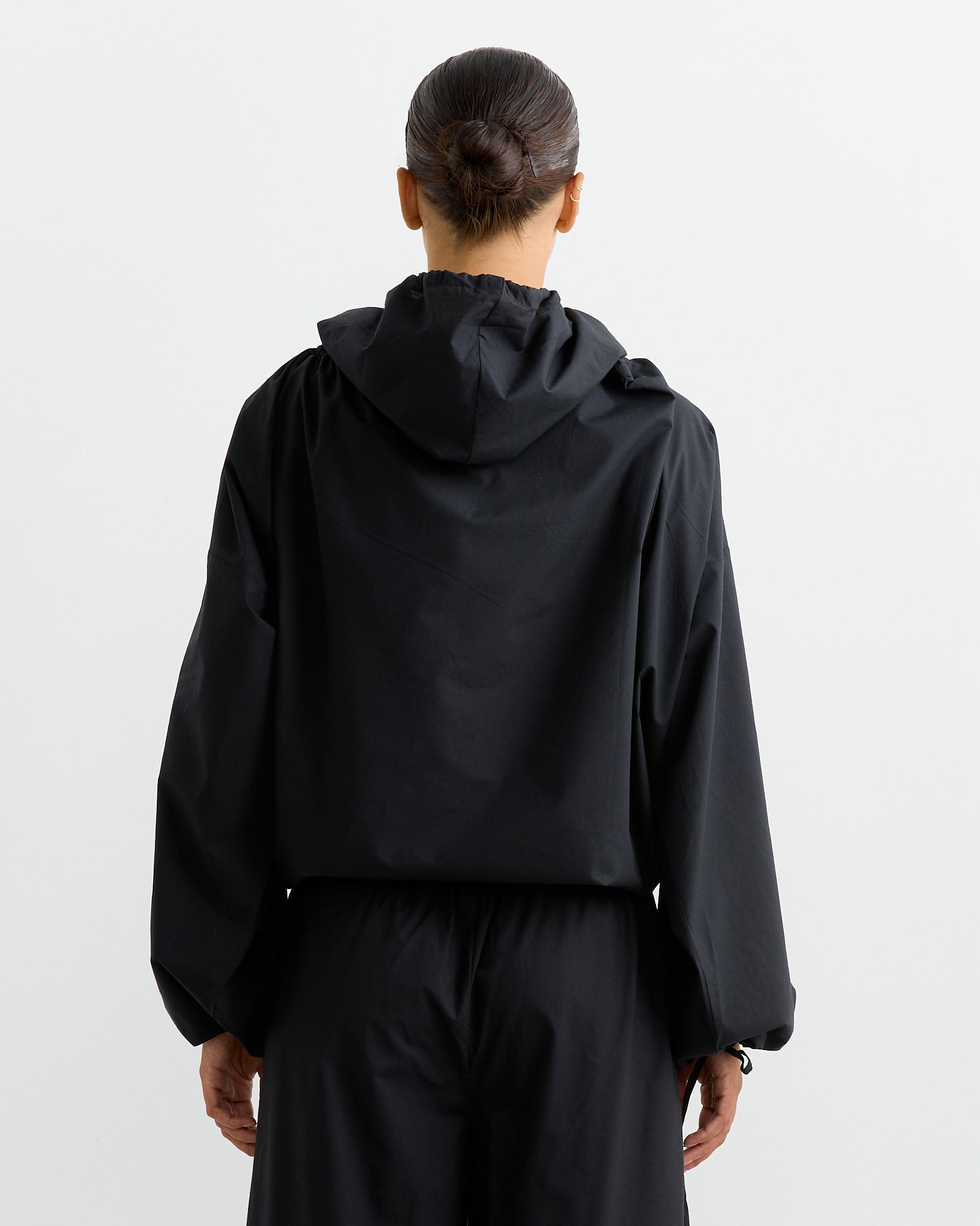 The Baserange Point Top in Black is crafted from 100% organic cotton poplin, offering a lightweight and breathable fit. It features a versatile design with drawstrings at the hood, neck, cuffs, and hem, allowing for an adjustable, customizable look. This top is produced sustainably, adhering to GOTS, Oeko-Tex, and OCS 100 certifications, ensuring ethical production practices.