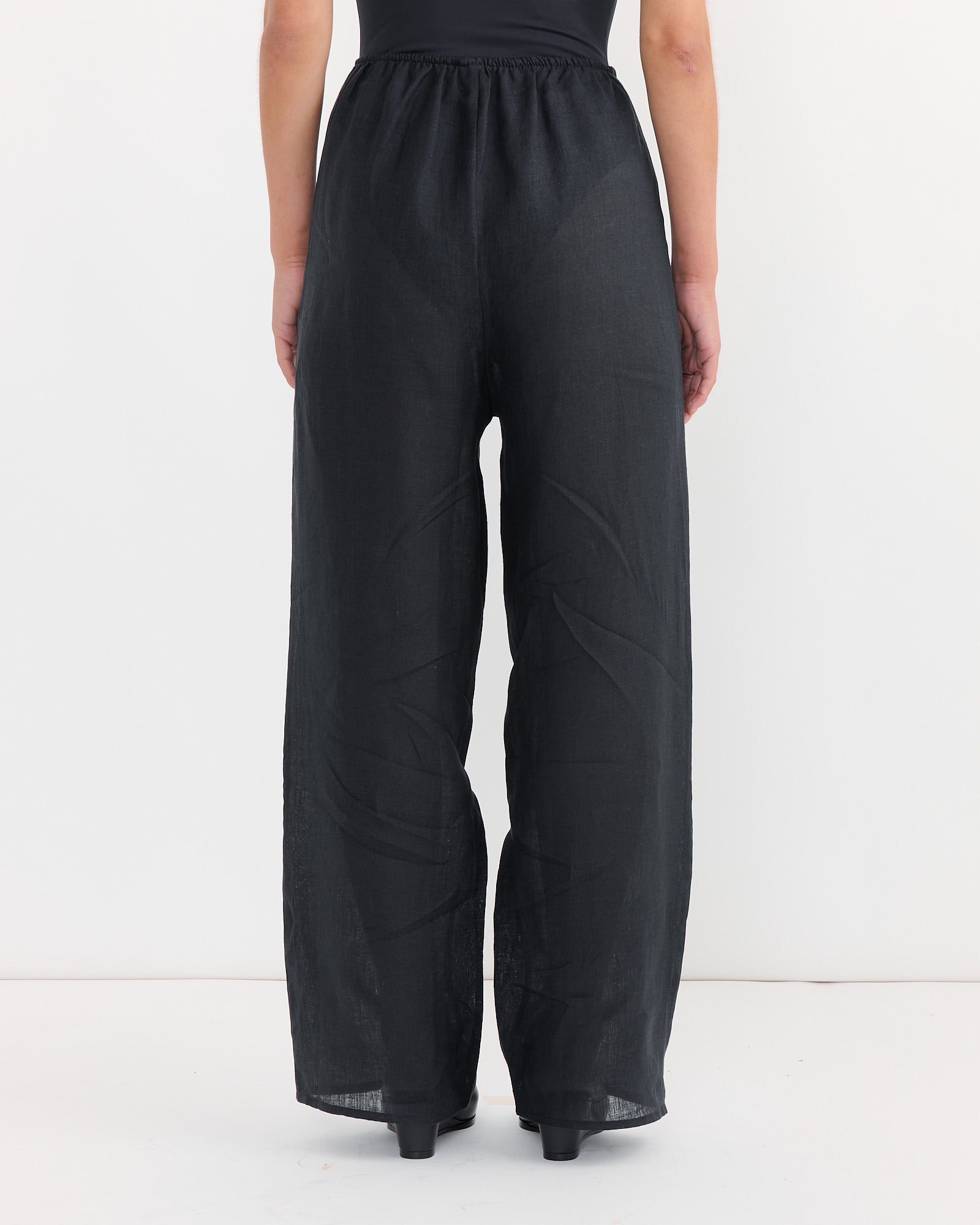 The Baserange Stoa Pant in Black is a lightweight linen style with an easy, relaxed fit. Designed with an elastic waistband, it offers breathable comfort and a minimal silhouette. This style runs large—consider sizing down for a closer fit.