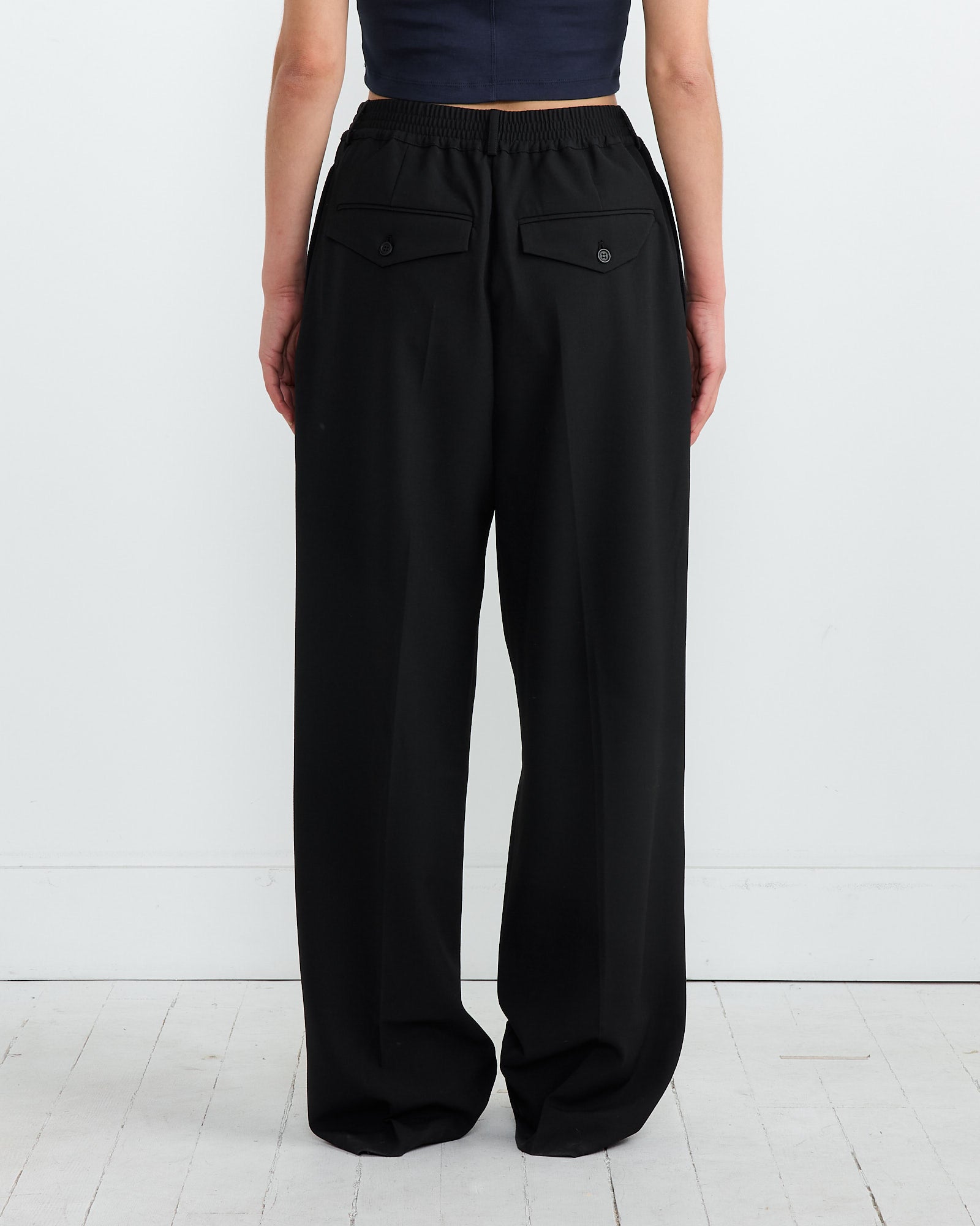 The Beaufille Erwin Trousers in Black are tailored pants featuring a high-rise waist and a wide-leg silhouette, offering a modern and sophisticated look. Crafted from a blend of polyester and viscose, they provide both comfort and structure.