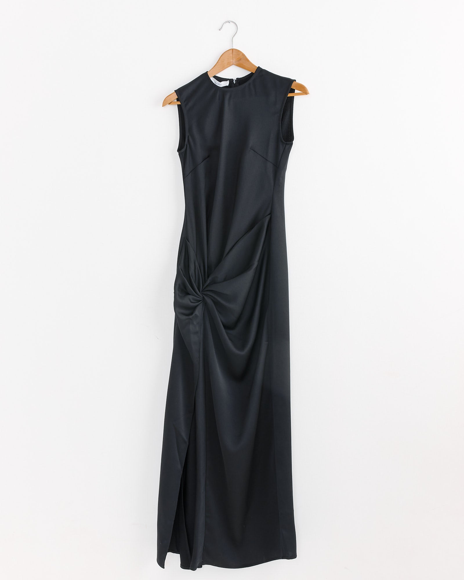 The Beaufille Imogen Maxi Dress in Black is a recycled polyester satin dress featuring elegant draping throughout. It has a round neckline, darts at the chest for a tailored fit, and a side seam twist detail that adds a unique touch. The dress includes a slit at the hem for ease of movement and a concealed zip closure at the back for a seamless finish.