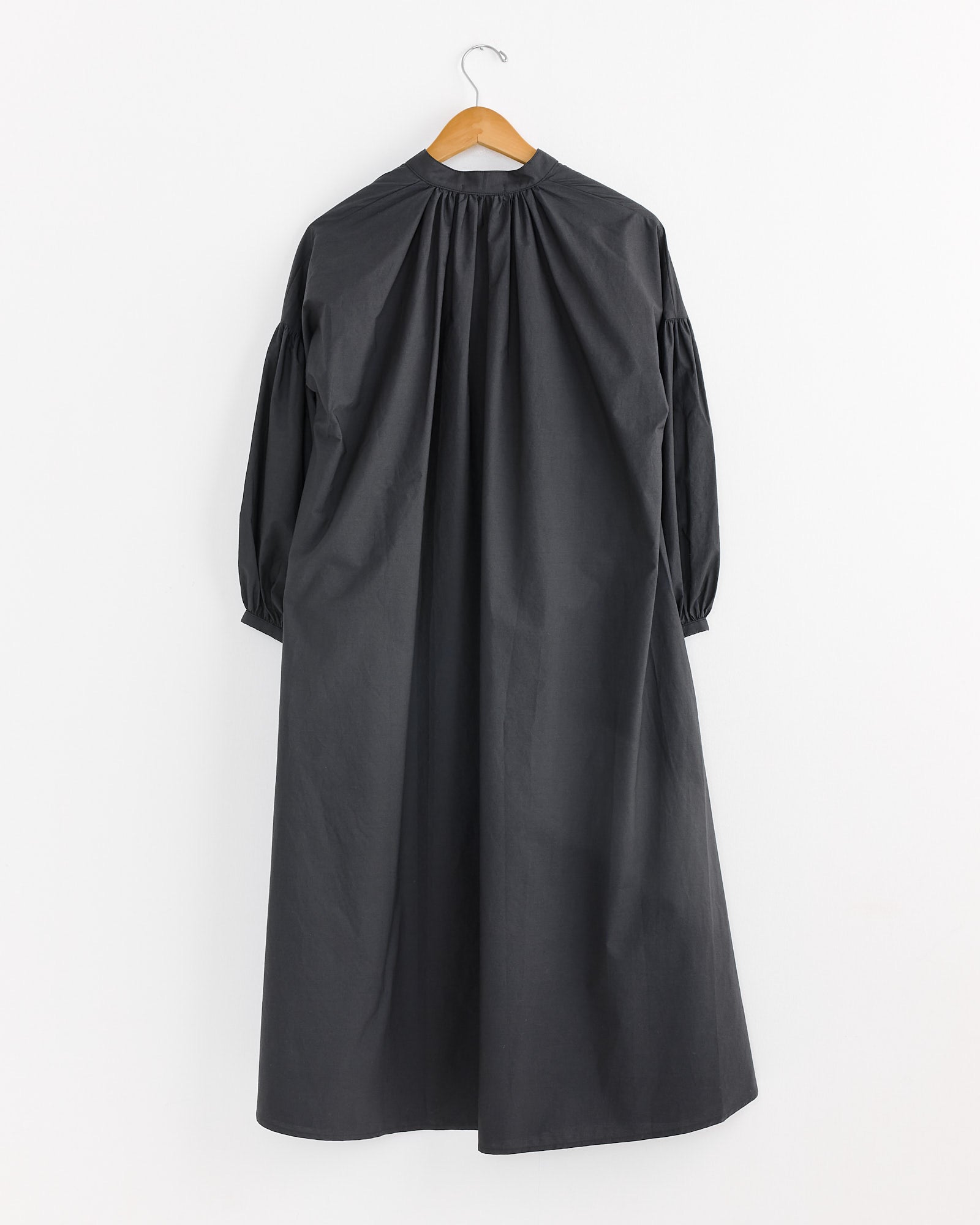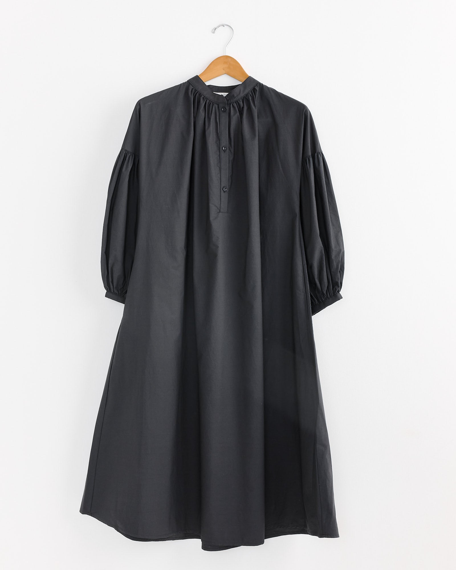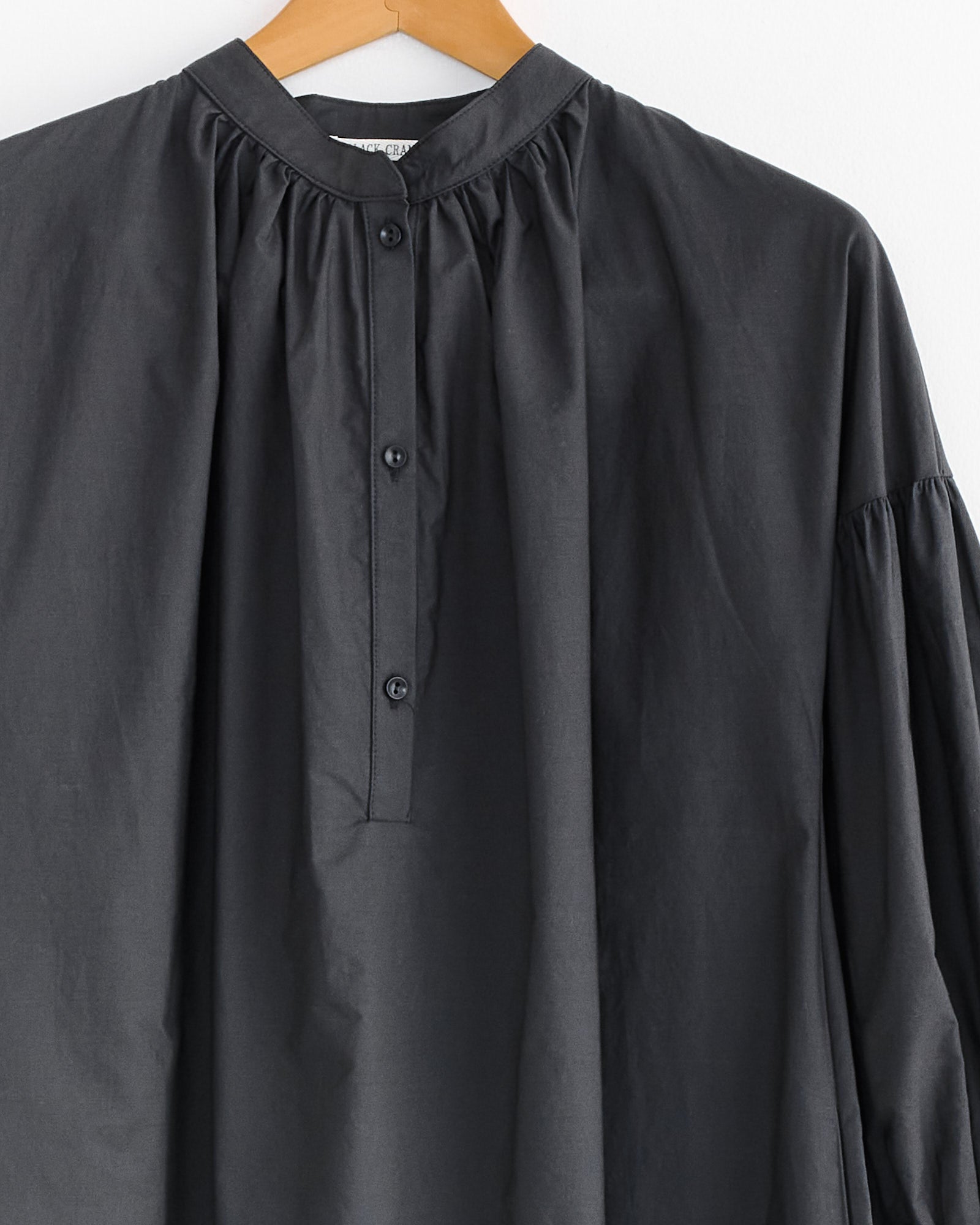 The Black Crane Balloon Sleeve Dress in Black features a stand collar, front button closure, and shirring details throughout for a soft, voluminous silhouette. Designed with wide sleeves and side seam pockets, it’s crafted from 100% cotton for a breathable, relaxed fit.