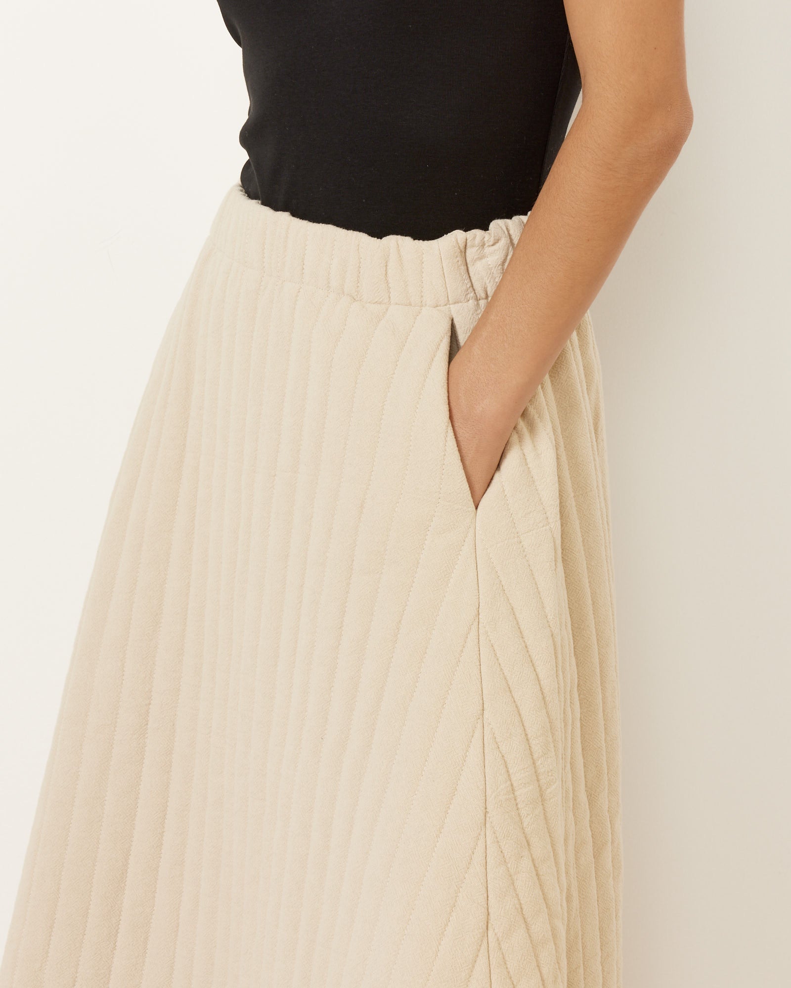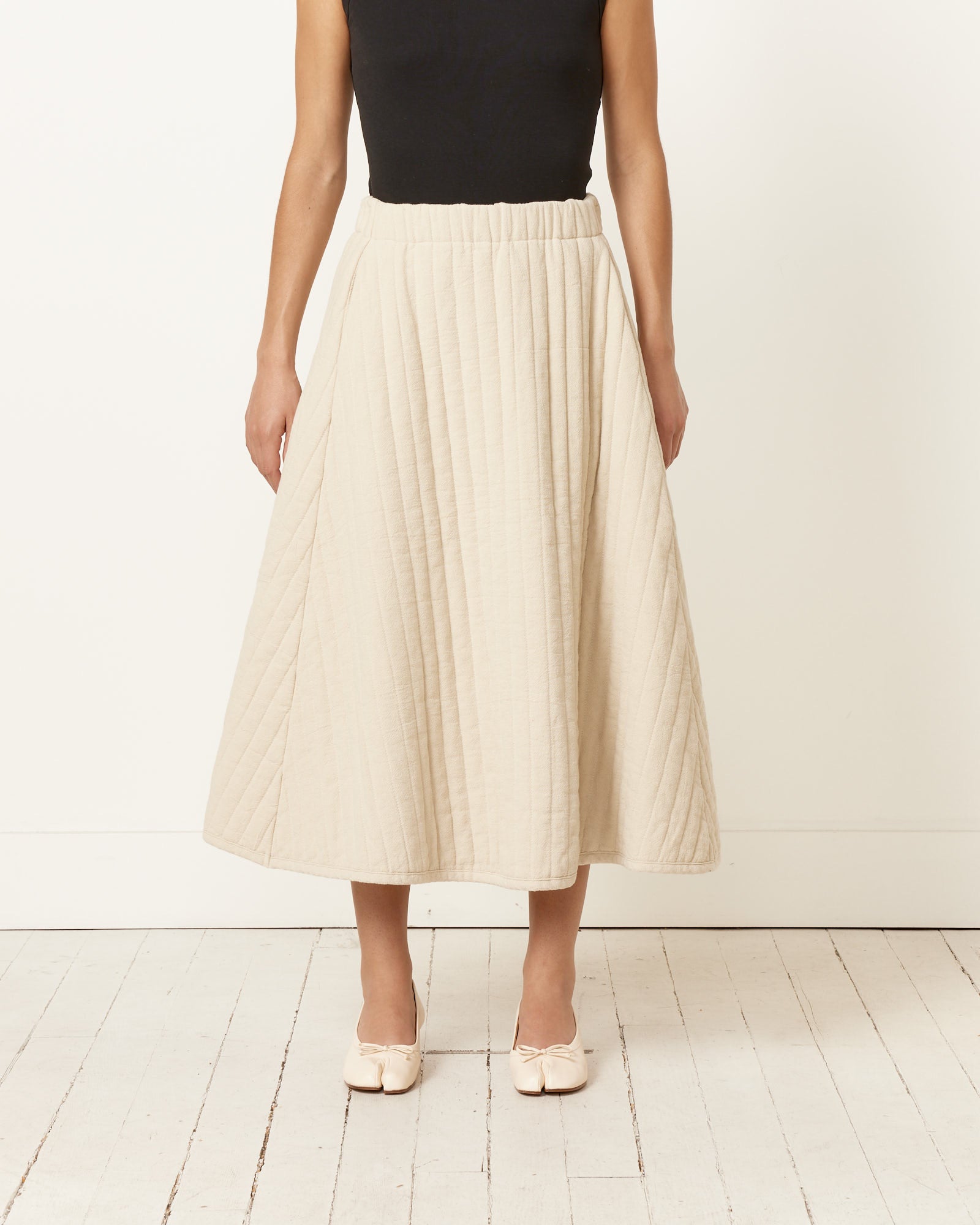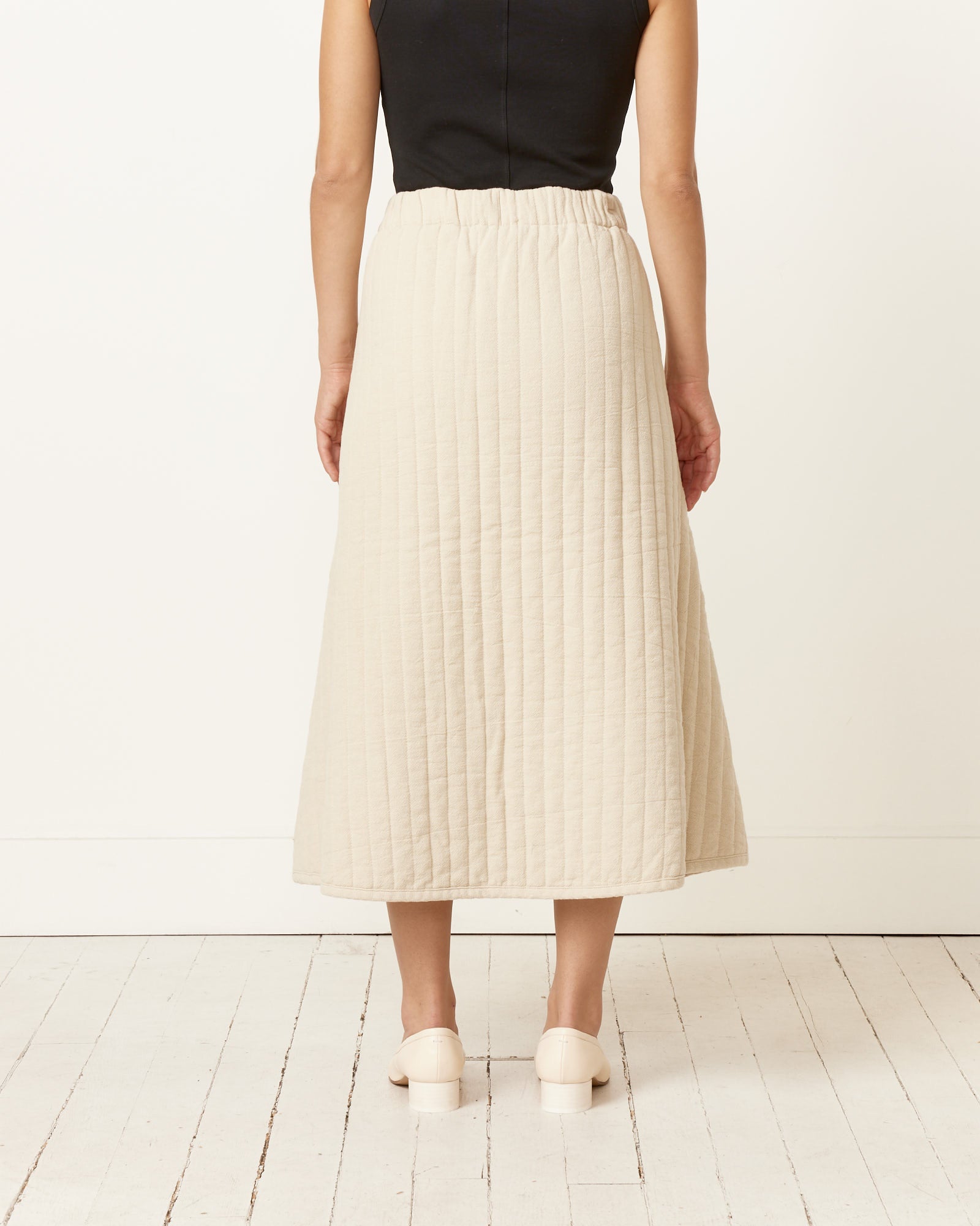 Black Crane's airy Quilted Skirt features a relaxed A-line silhouette with a quilted exterior padded with a poly fill, slanted side pockets, and an elasticized waistband.