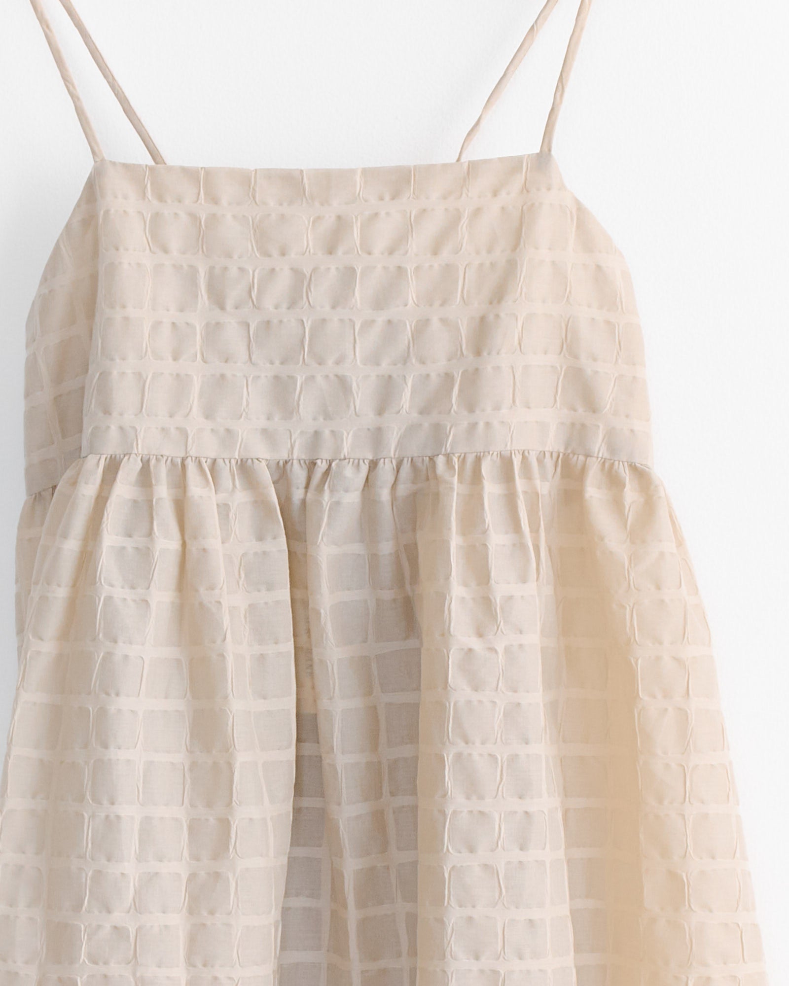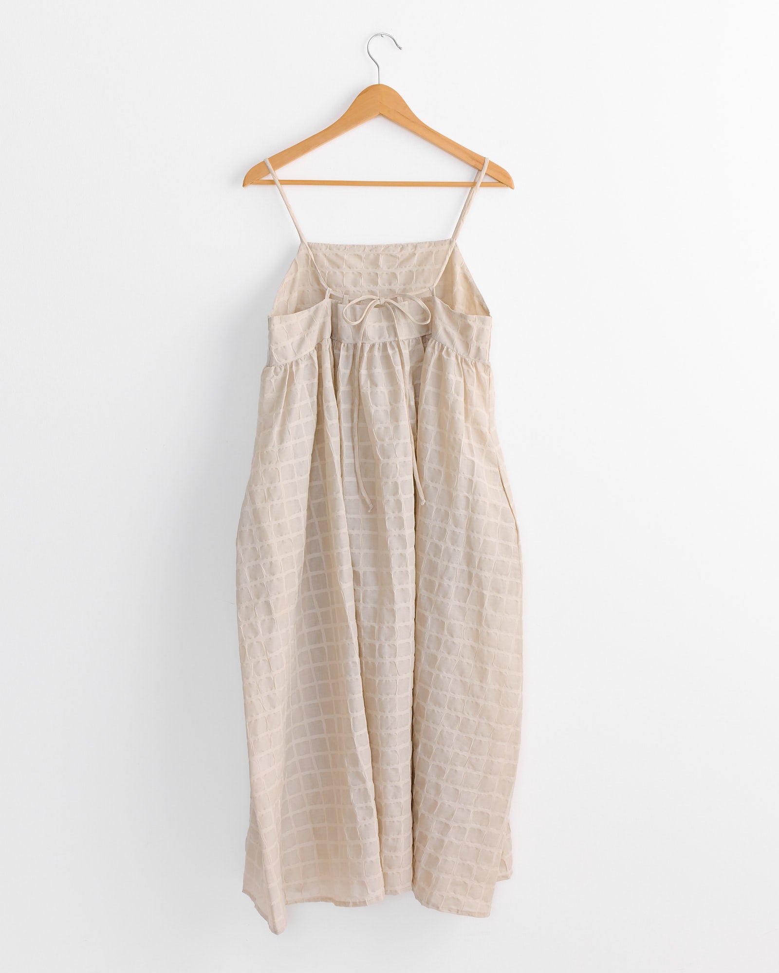 The Ripple Finish Strap Dress in Beige by Black Crane features a double-faced top with adjustable straps and a voluminous, shirred skirt. Crafted from super lightweight Japanese cotton, the structural fabric is slightly sheer and finished with side seam pockets. The relaxed silhouette offers ease and movement throughout.