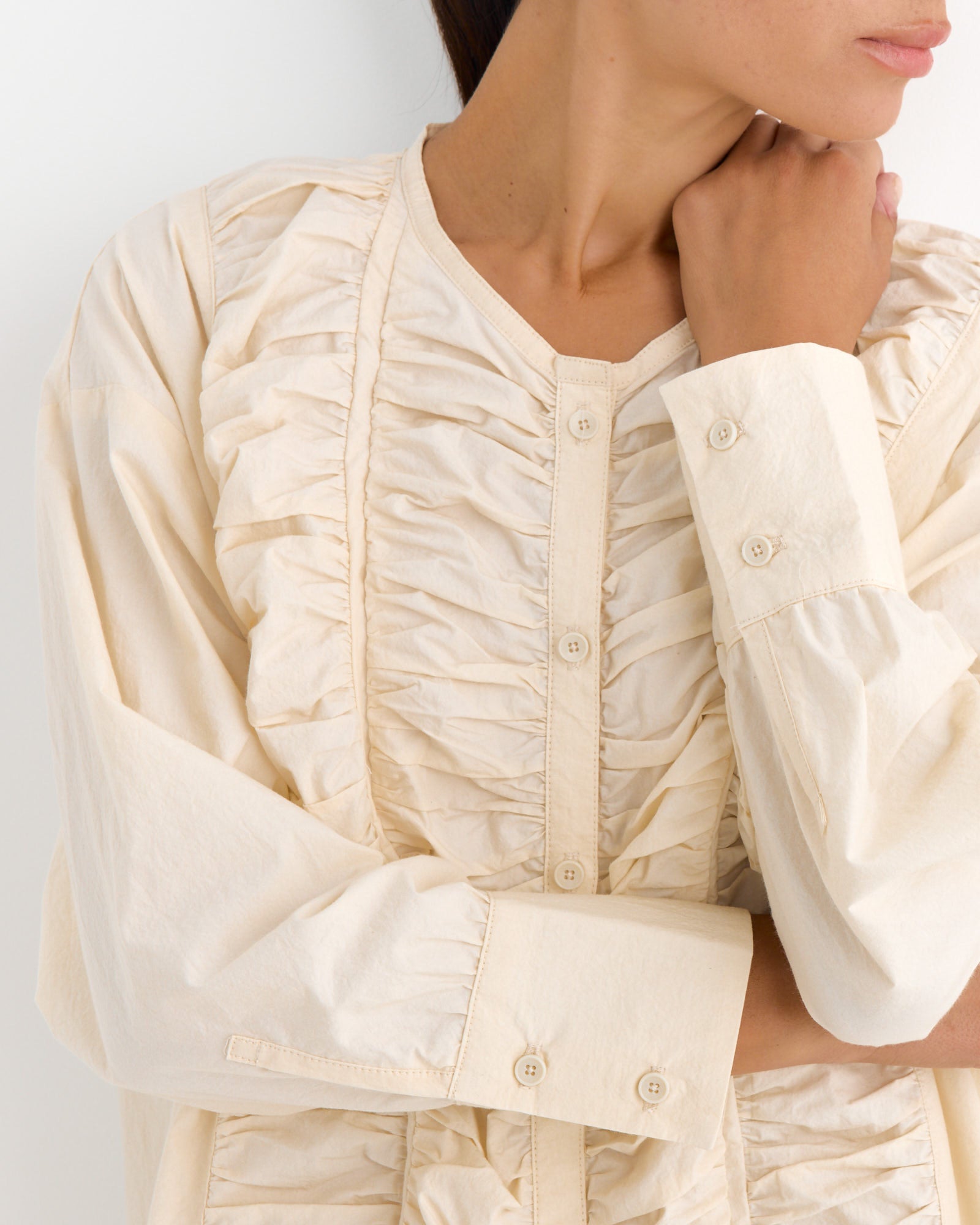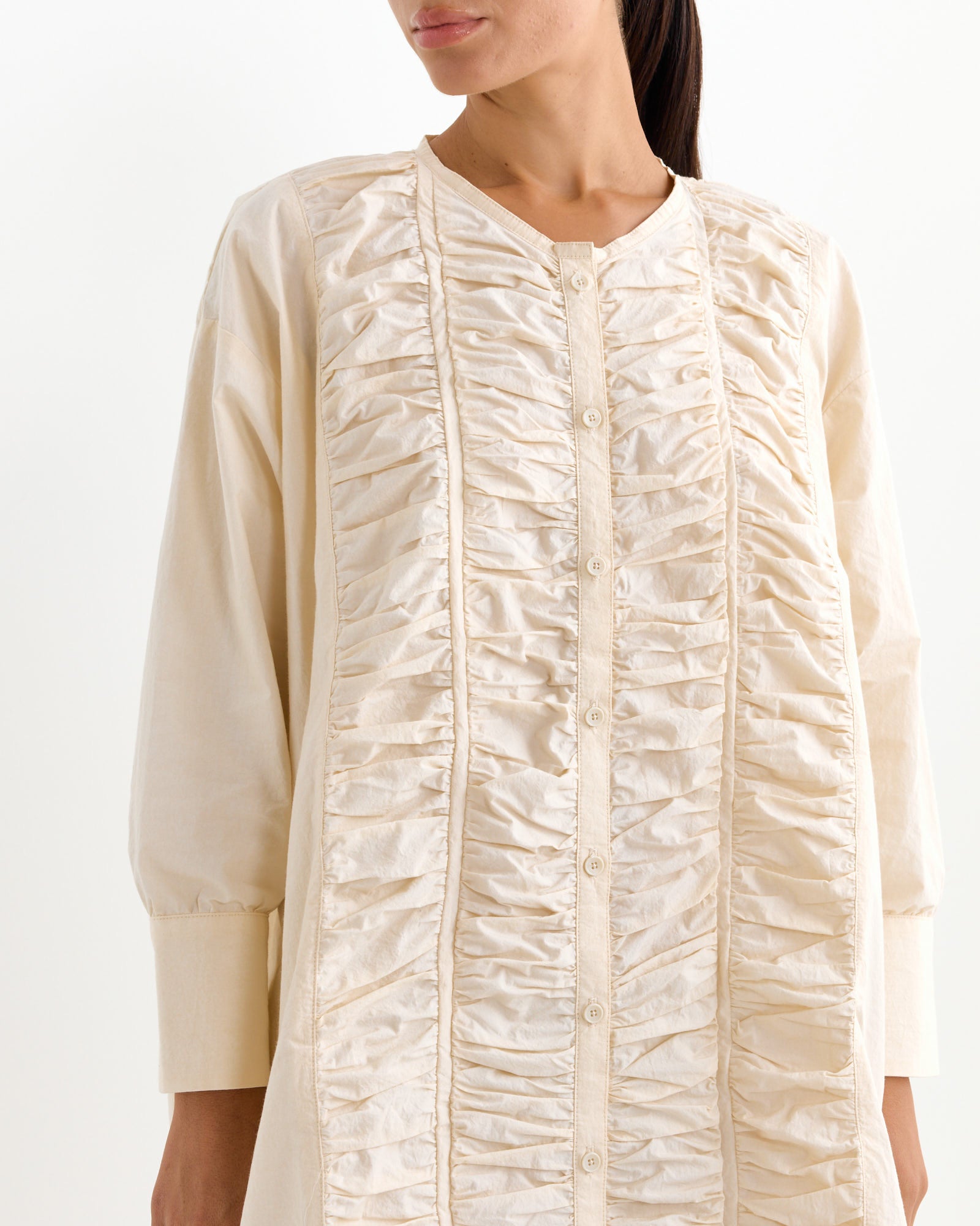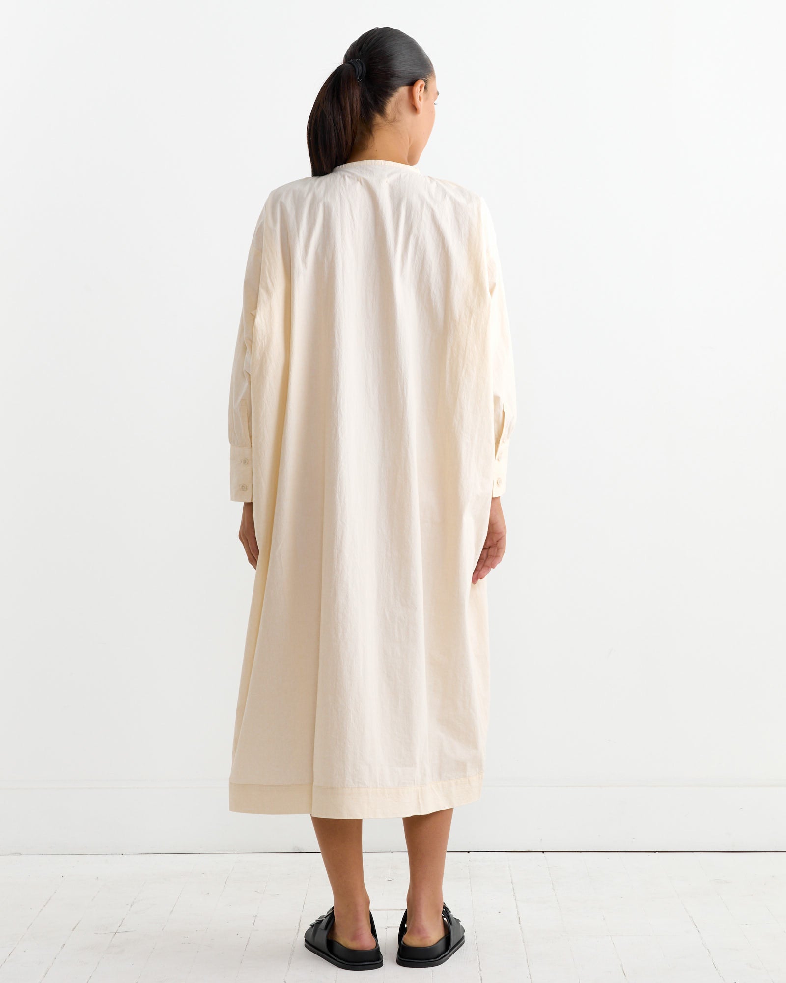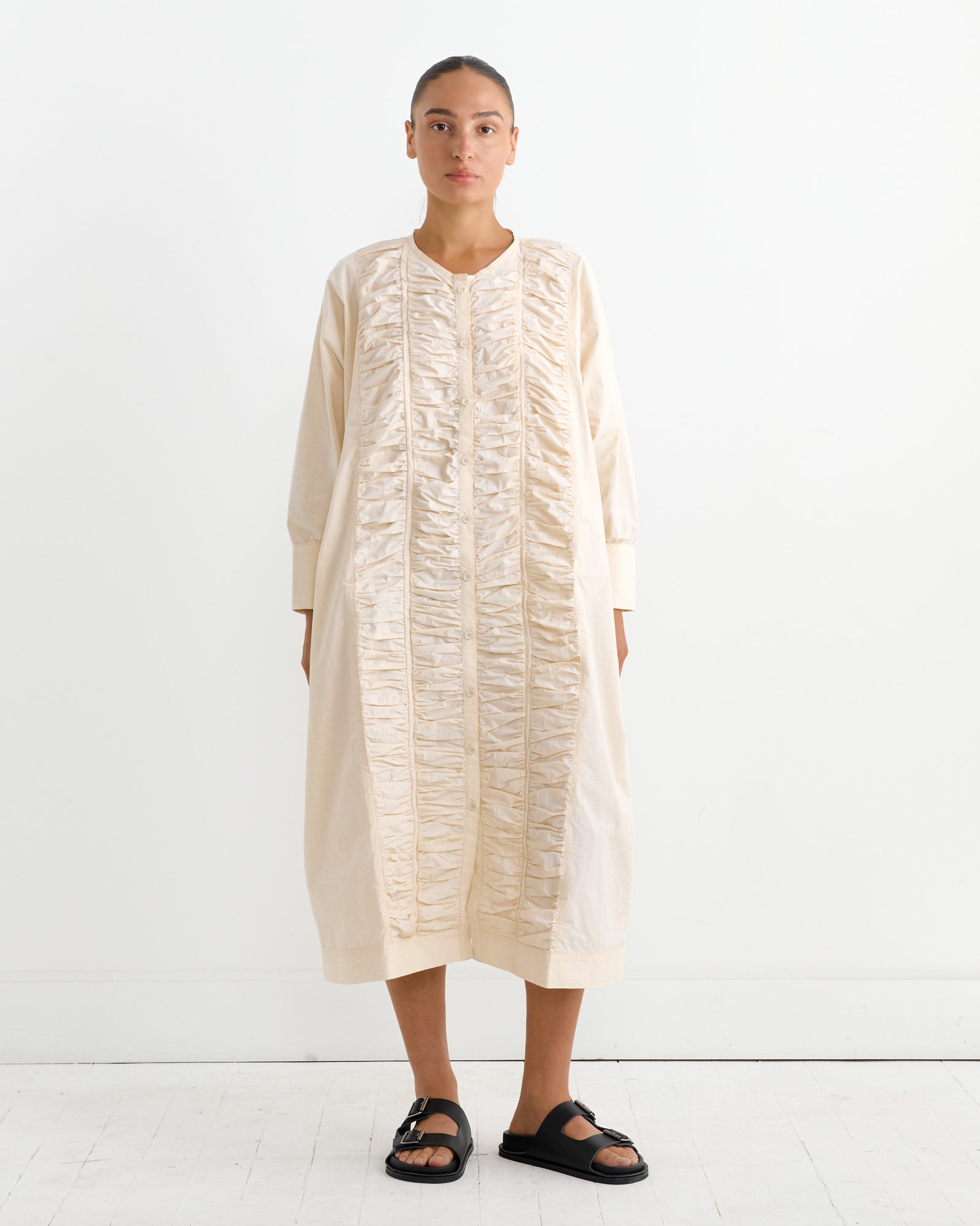 Black Crane's Ruffled Dress is made from Japanese cotton dyed with the 300-year-old Azumadaki dyeing process in small vats, then sun-dried for a unique texture and soft hand. Cut in a relaxed silhouette, it features dramatic verticle ruffles with a button closure at the front, and a Mao collar.