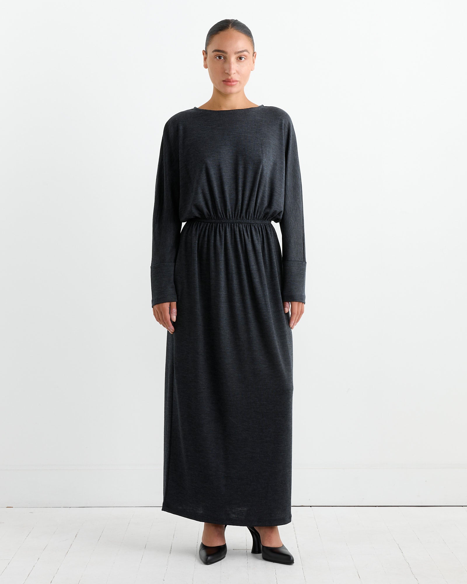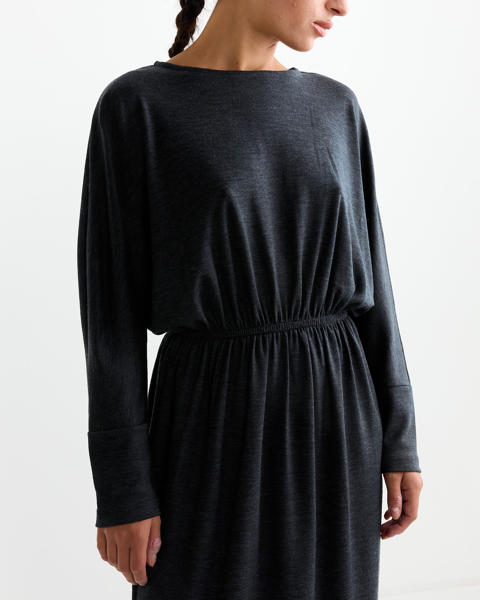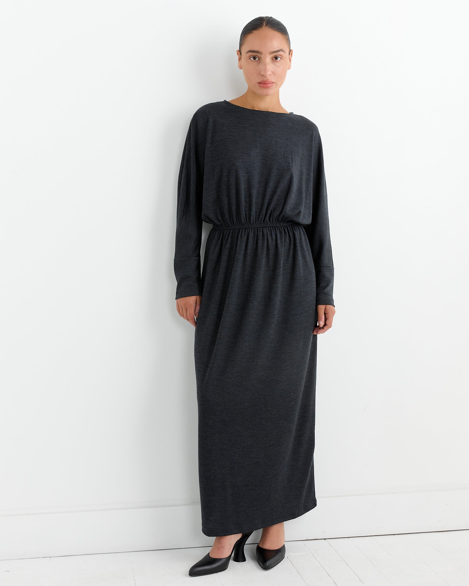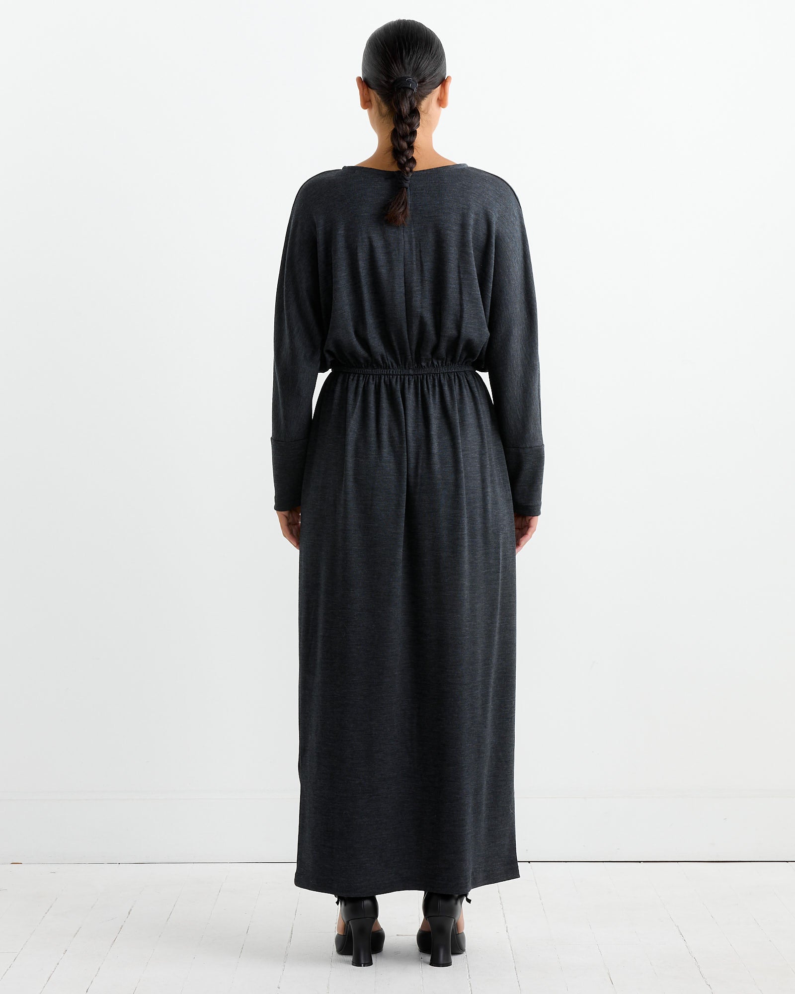 The Black Crane Wool Dress in Dark Grey is a relaxed-fit dress crafted from soft Japanese wool jersey. It features a basic crew neck, dolman sleeves, and an elastic waist for added comfort. The fabric has a silky and drapey quality, making it perfect for a casual yet elegant look. The dress falls to a mid-length and includes a single button closure at the back.