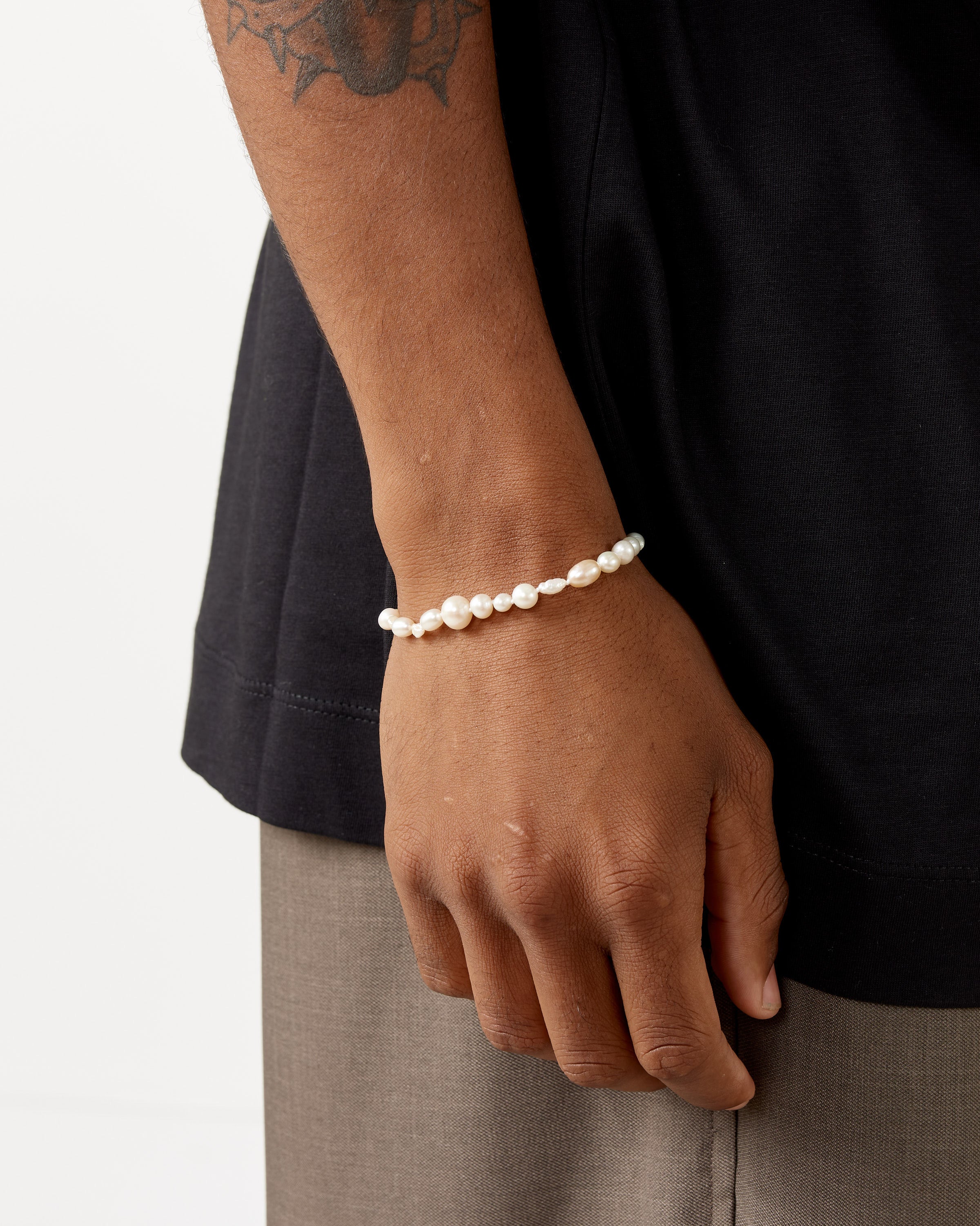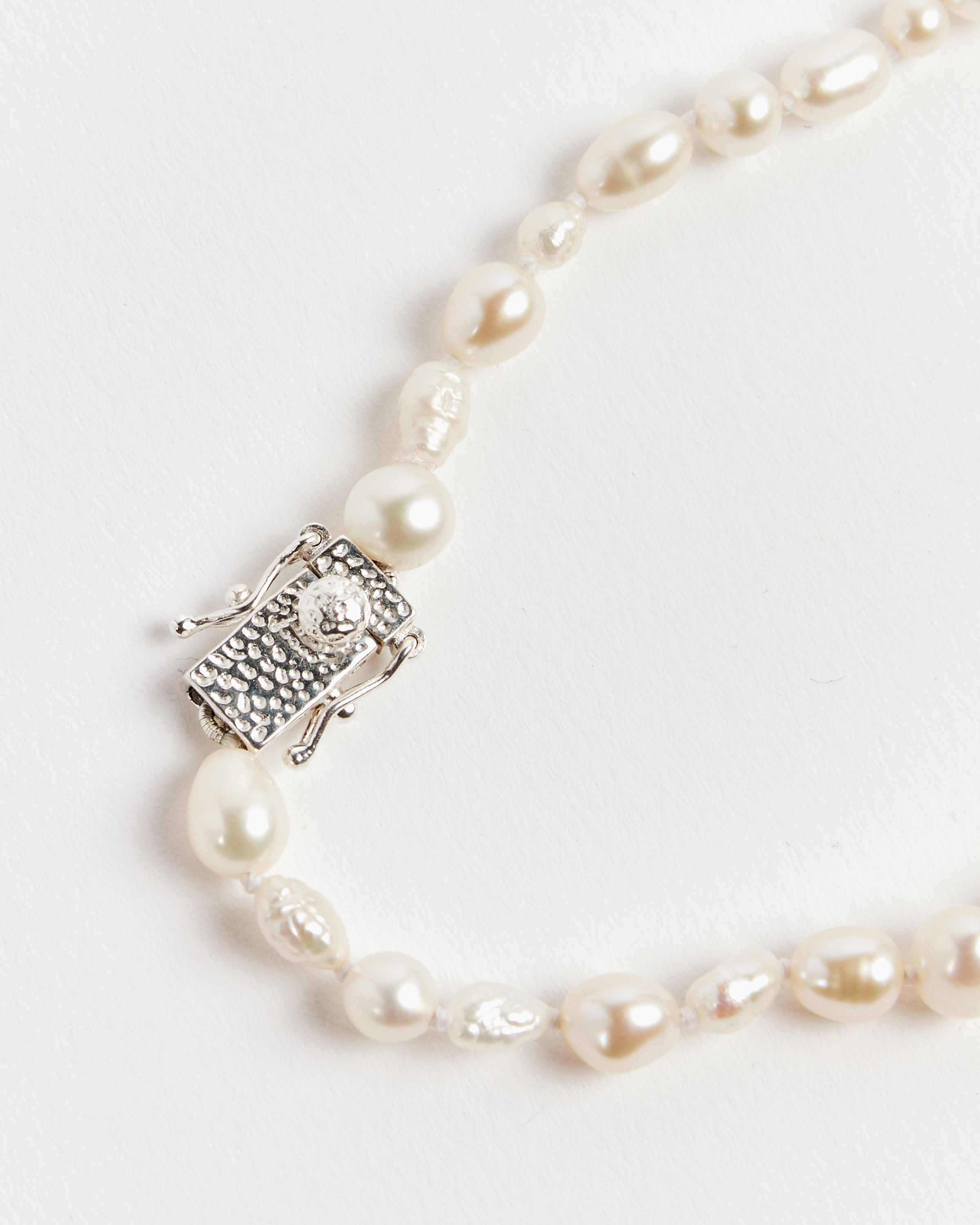 Bleue Burnham's Antique Pearl Bracelet is made with recycled pearls sourced from antique specialists across the United Kingdom. Embracing the beauty of recycling, this bracelet is constructed with pearls from different decades, different pieces of jewelry, and different backgrounds, resulting in one-of-a-kind pieces with slight variations in shade, shape, and texture. The bracelet is finished with a British-hallmarked silver safety clasp.