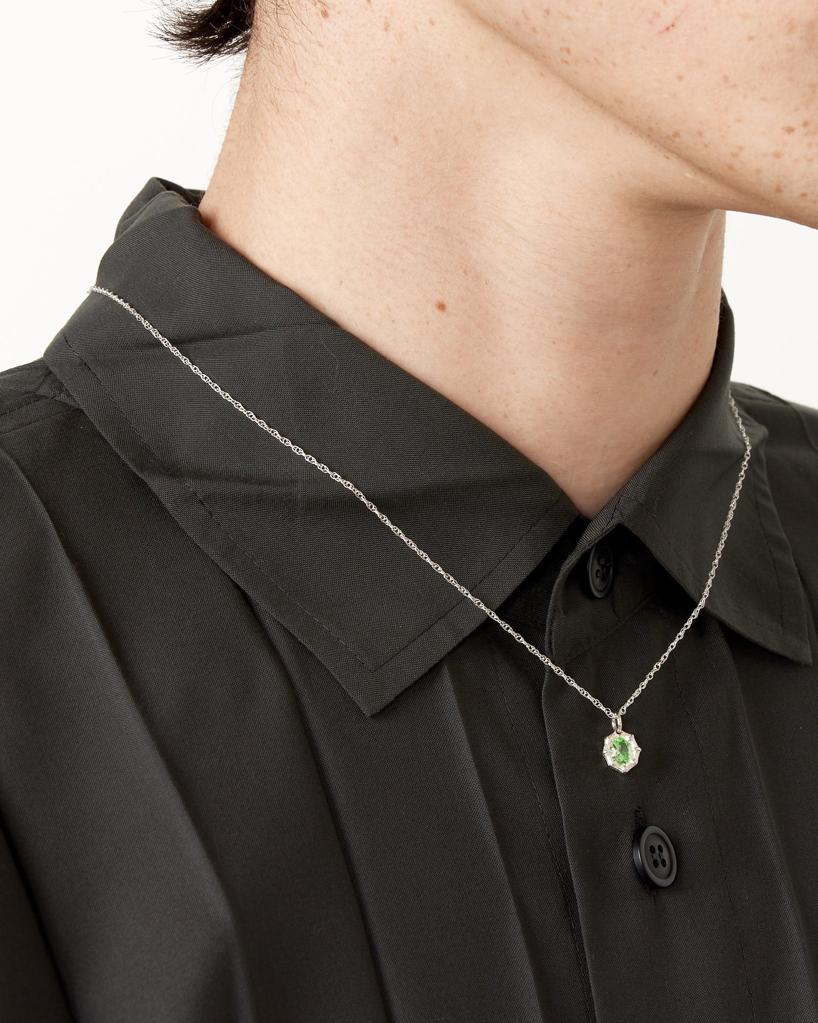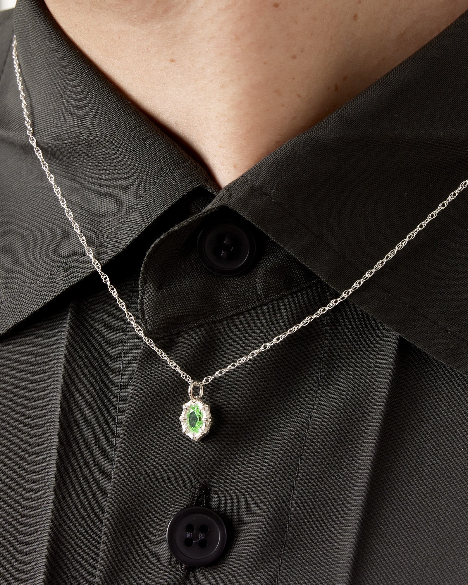 Emerging from London's jewellery design scene, Bleue Burnham is carving a reputation for intricate, sustainable creations inspired by nature. This necklace featuring an oval-cut lab-grown sapphire set in a recycled solid sterling silver pendant, showcases Burnham's affinity for sapphires. The pendant's border design draws its inspiration from bamboo.