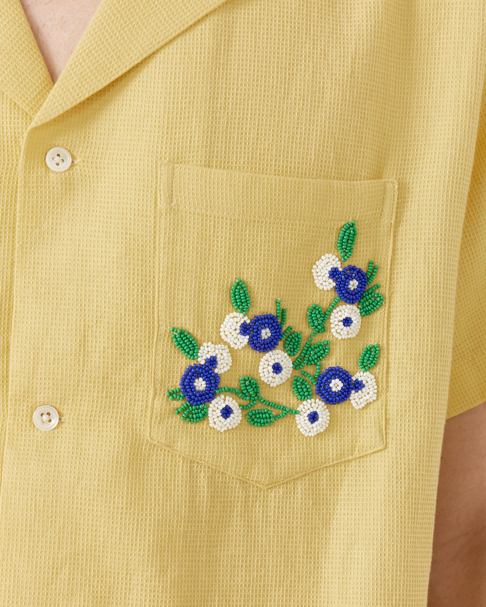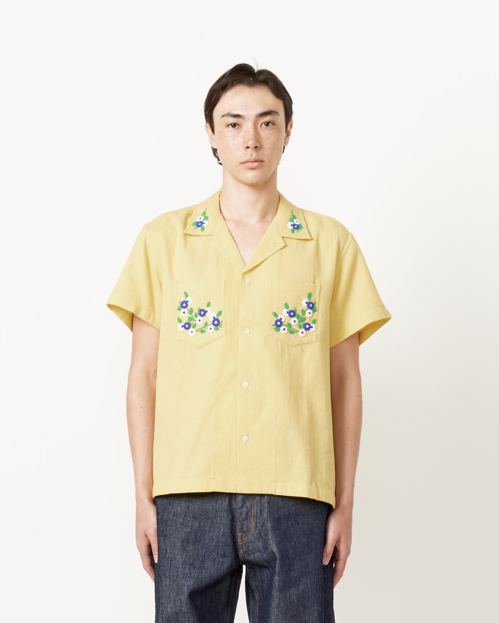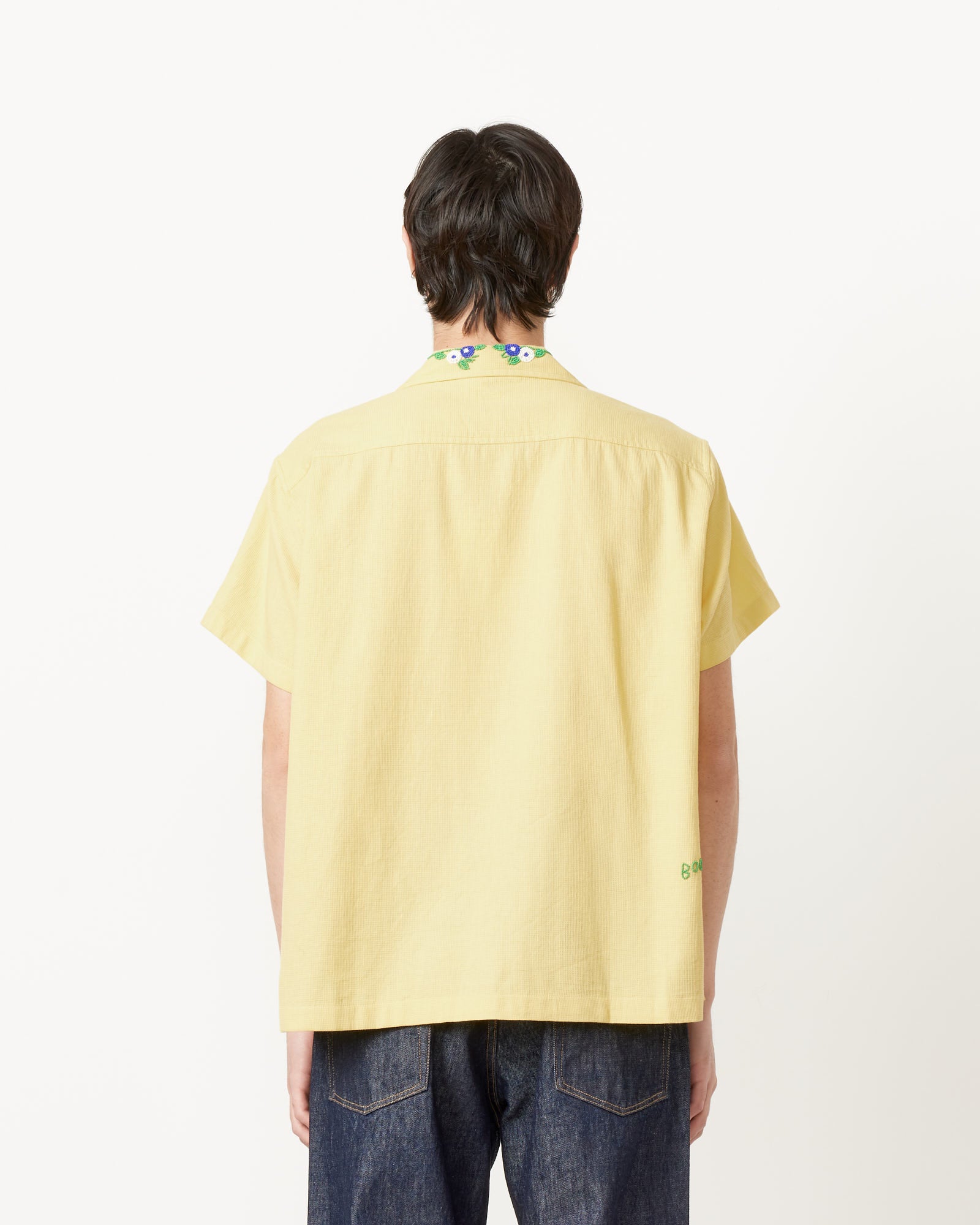 Inspired by a knit blouse from the late 20th century that featured a sprig of flowers beaded on the collar, Bode's Beaded Chicory Short Sleeve Shirt in Yellow reproduces the floral beading and shade of yellow found on the original garment, and features a spread collar, front pockets, and a boxy silhouette. All beadwork is done by hand.