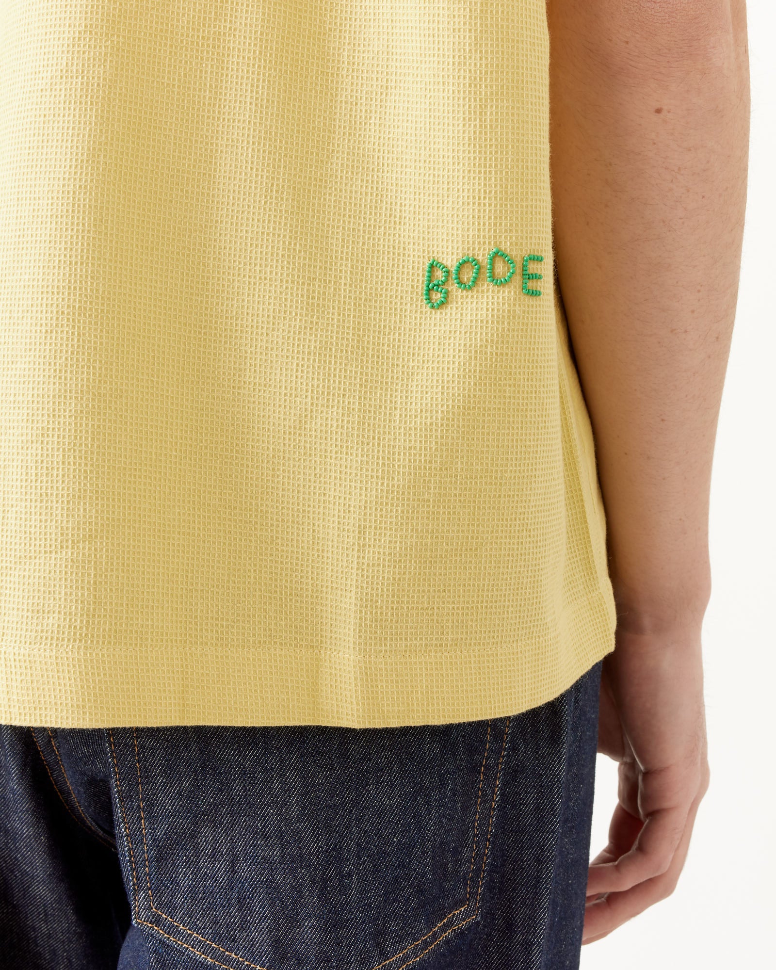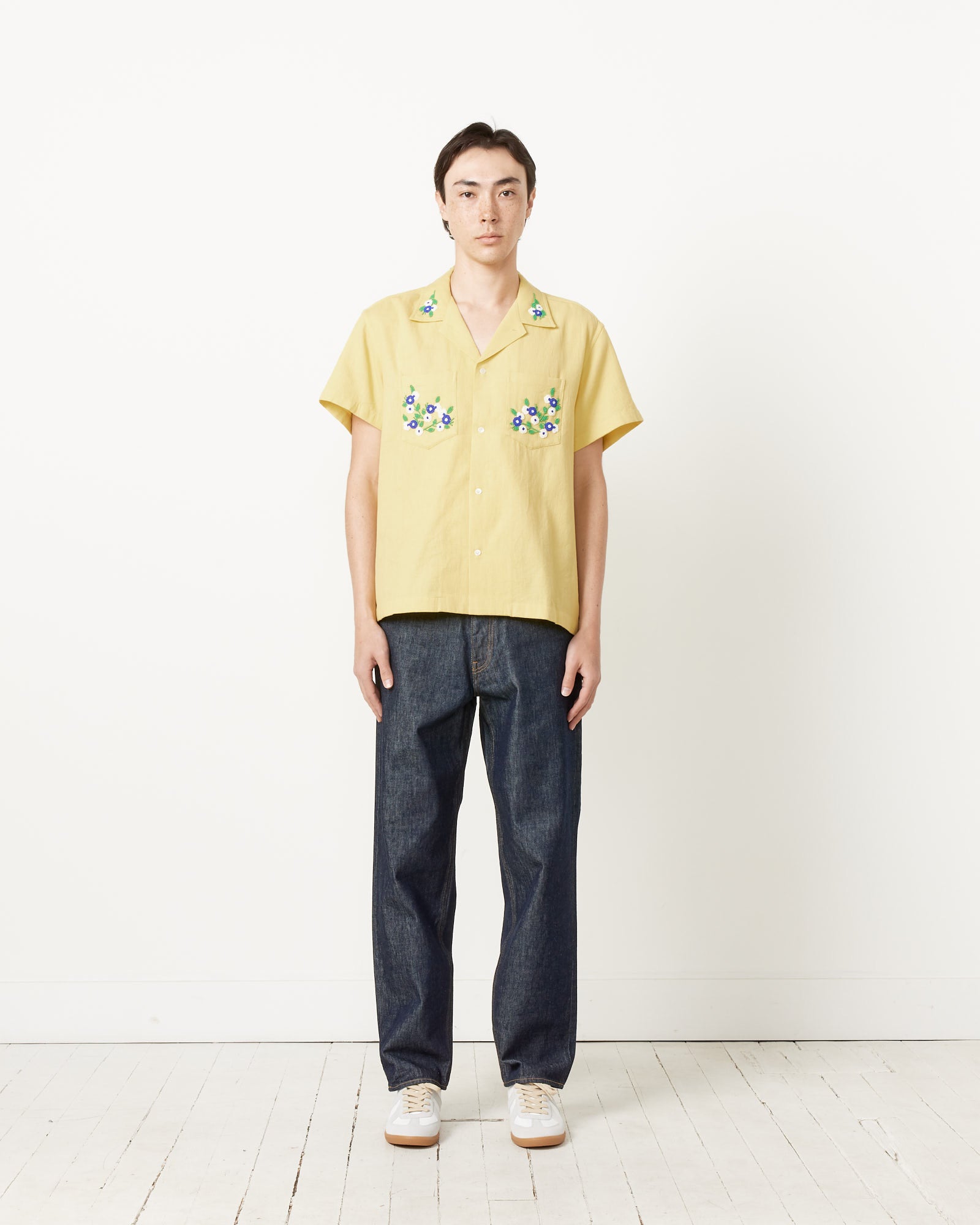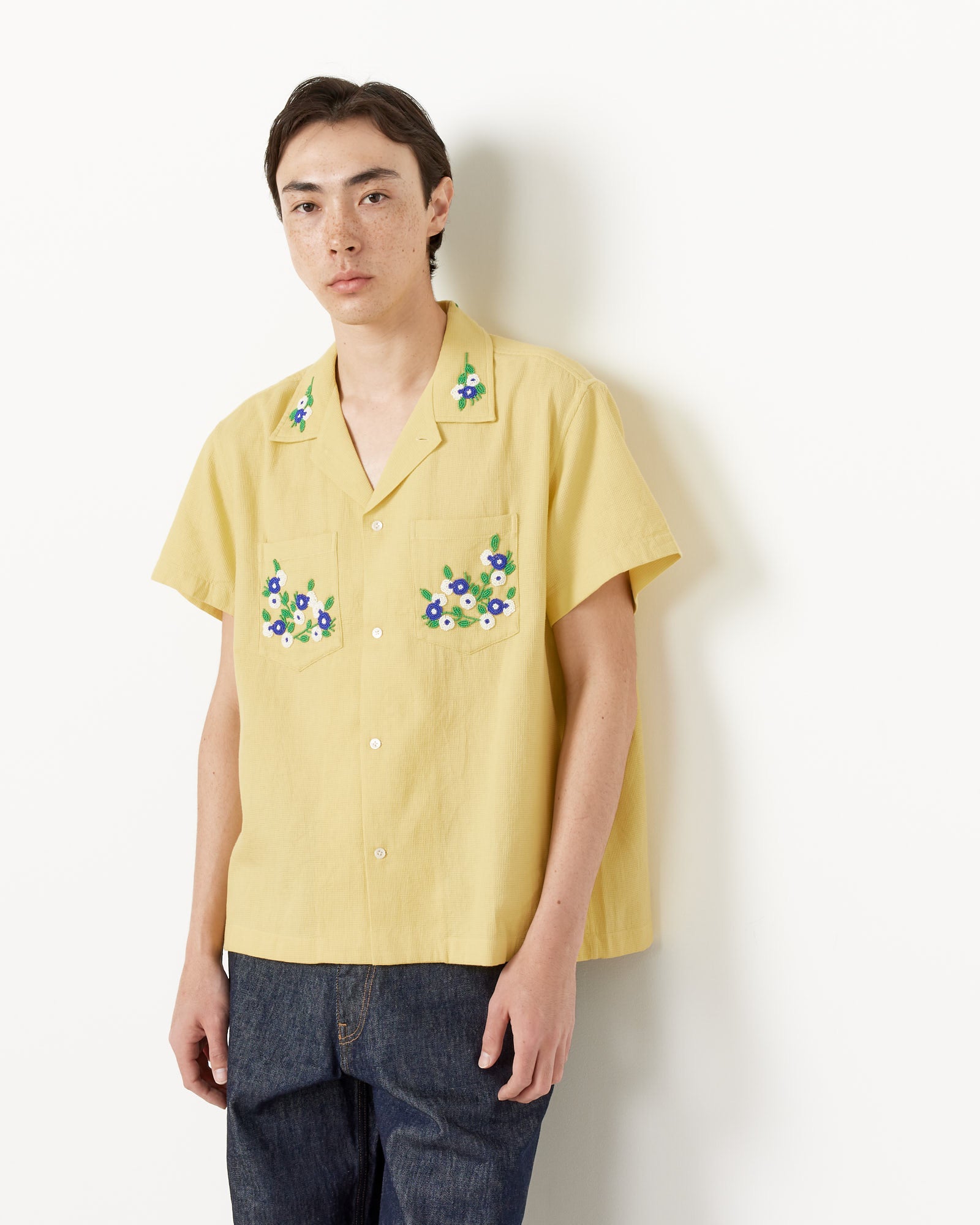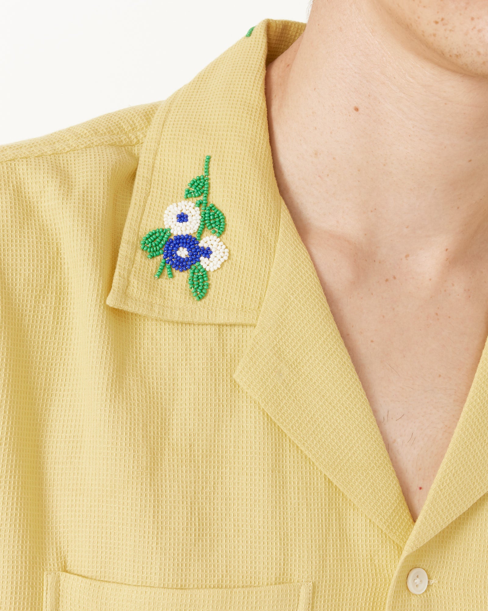Inspired by a knit blouse from the late 20th century that featured a sprig of flowers beaded on the collar, Bode's Beaded Chicory Short Sleeve Shirt in Yellow reproduces the floral beading and shade of yellow found on the original garment, and features a spread collar, front pockets, and a boxy silhouette. All beadwork is done by hand.
