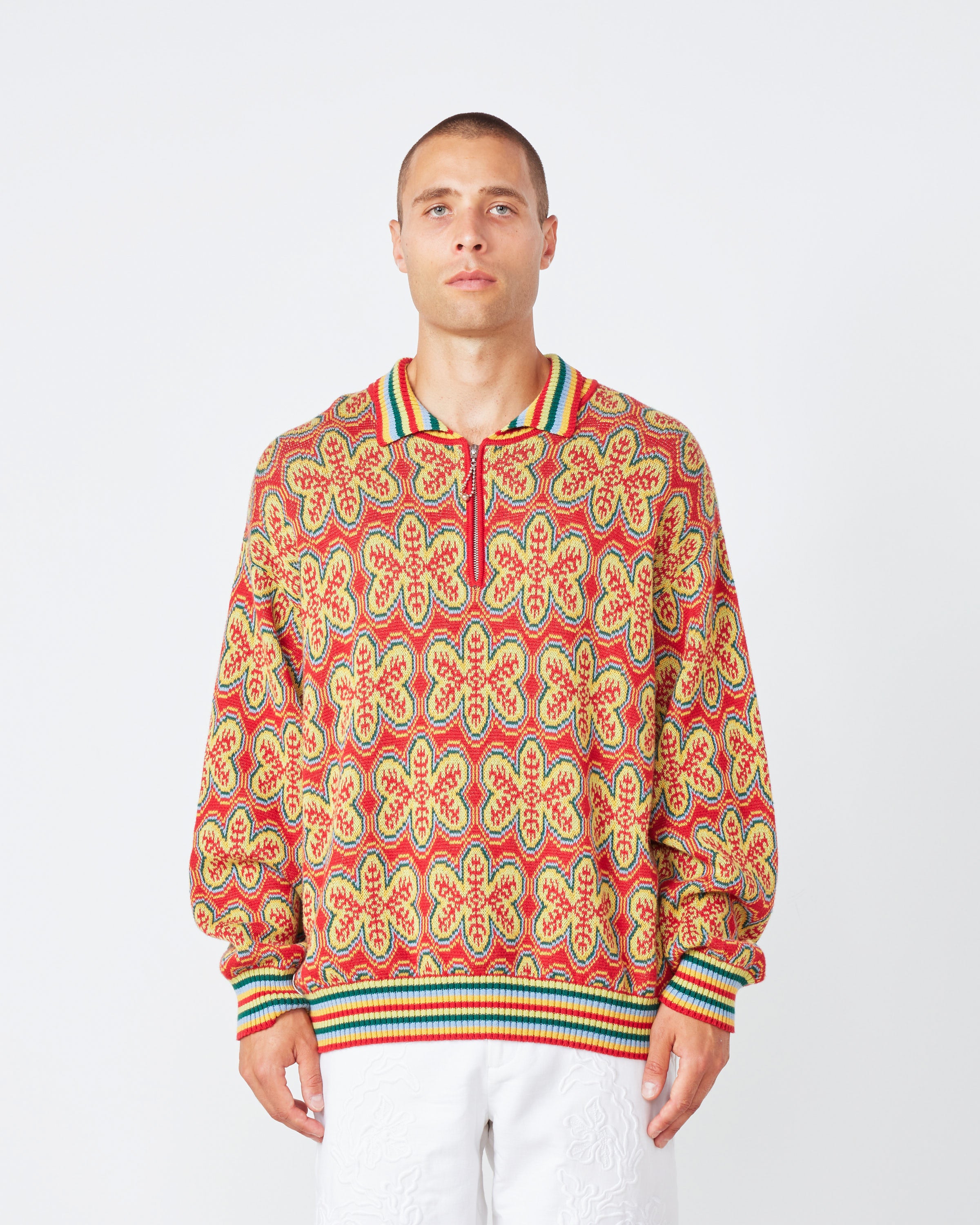 Inspired by a crocheted table runner, circa the 1940s, Bode has imitated the pattern of the reference piece in their Dream State Quarter Zip, a five-color jacquard woven pullover that features contrast-ribbing at the collar, cuffs, and hem, and a ball-chain zipper pull.