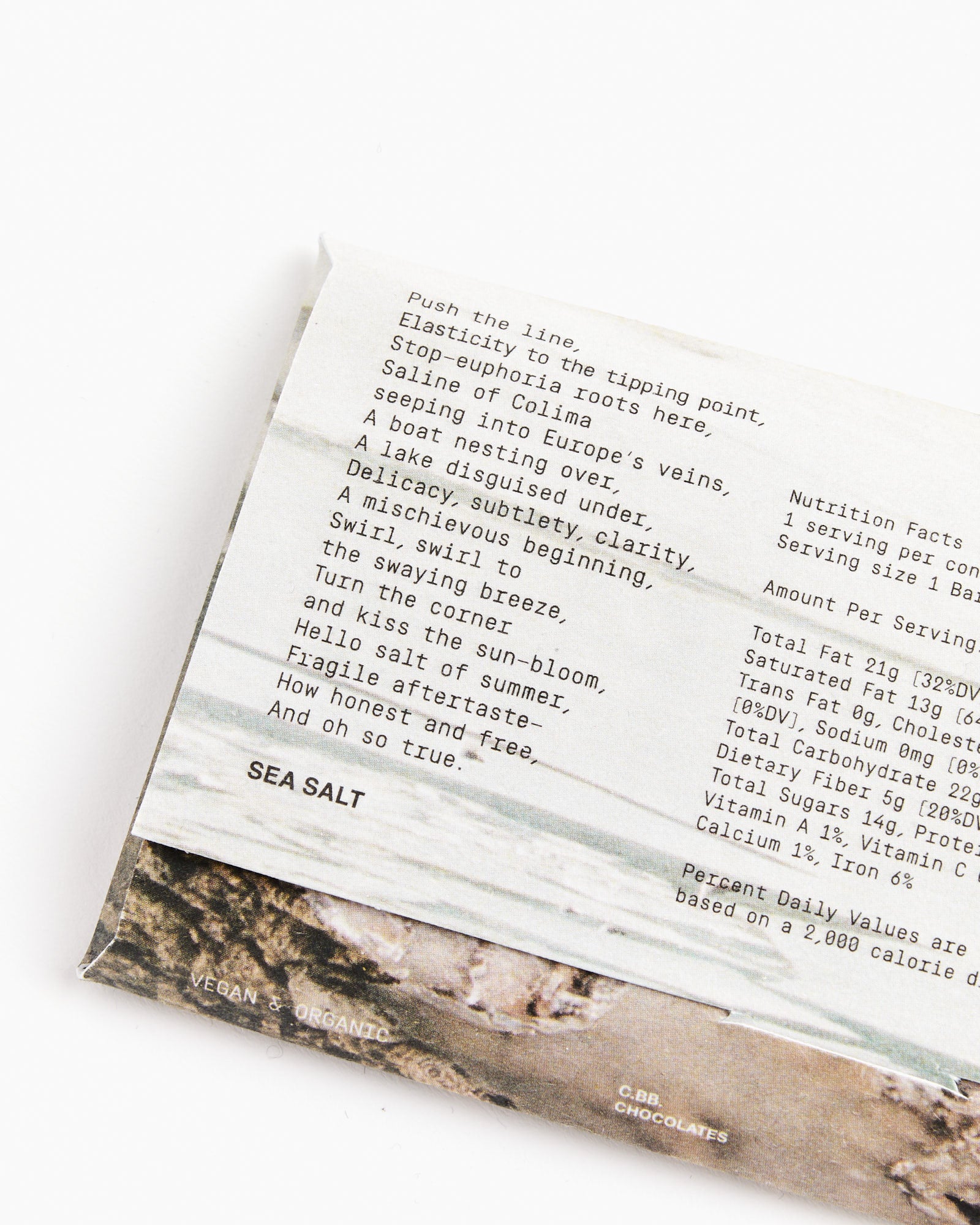 Paired with sea salt, the astonishment of the bold Criollo chocolate on the tongue sends a savory kick like the piquancy of an ocean wave. Sweetness is a desire that starts on the tongue with the sense of taste but doesn’t end there. Perhaps that is the prototype for all desire.