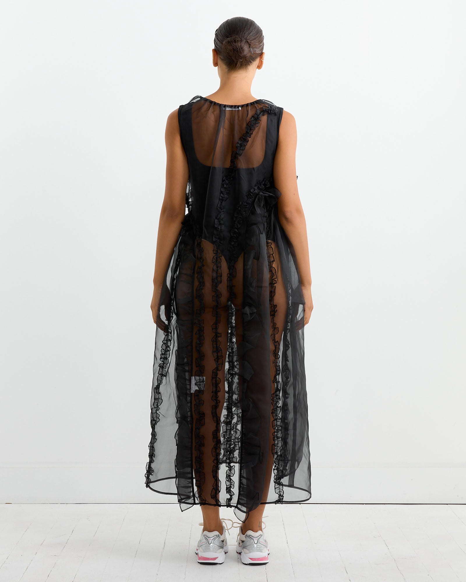 The Cecilie Bahnsen Opal Dress in Black is an ethereal and elegant creation from the FW24 collection. Made from luxurious silk satin, this sleeveless dress features a graceful scoop neck and asymmetric ruffles that cascade along the front and back, evoking a sense of whimsy and romance. The glossy finish of the silk adds a touch of opulence, ensuring that the dress shines with every movement.