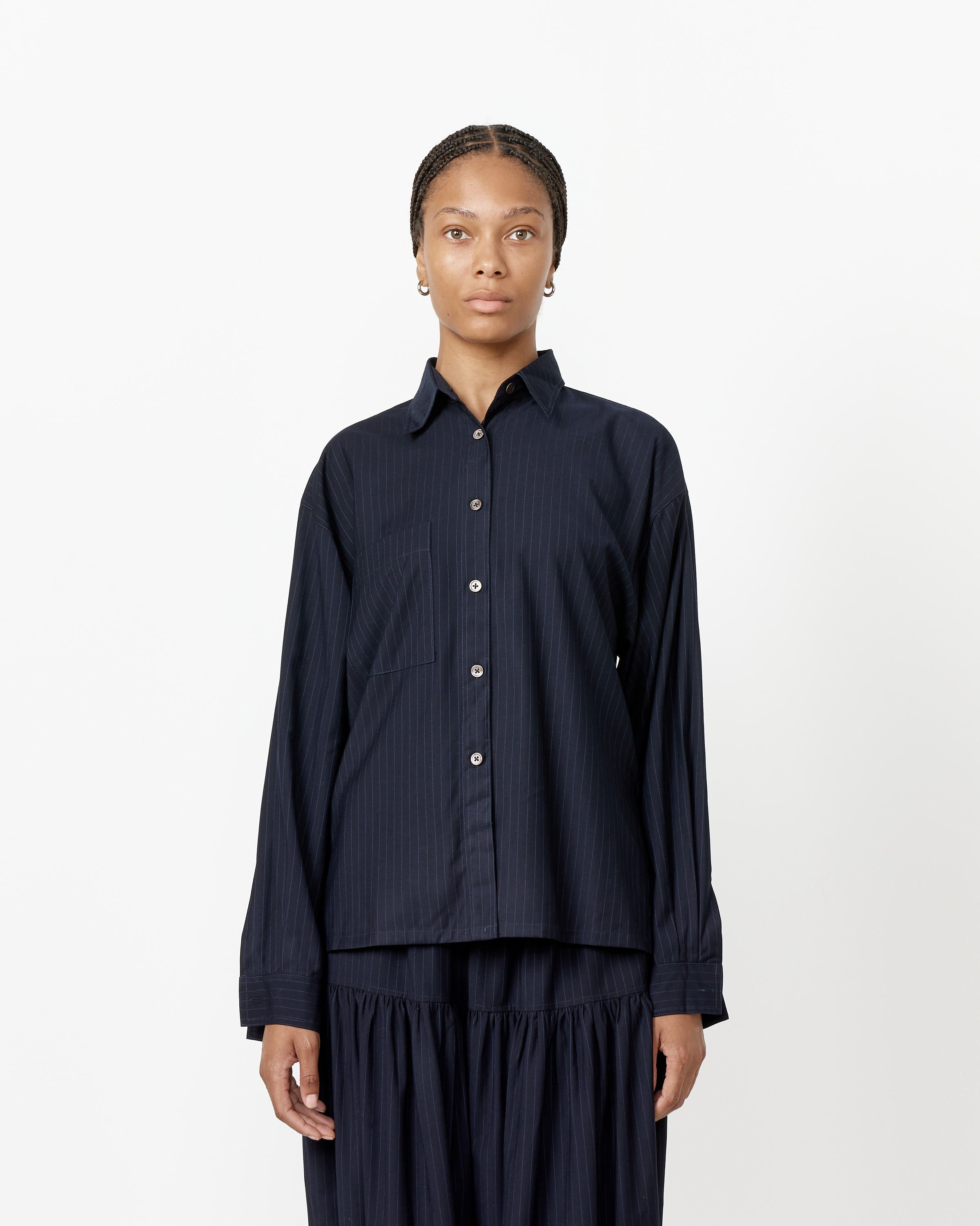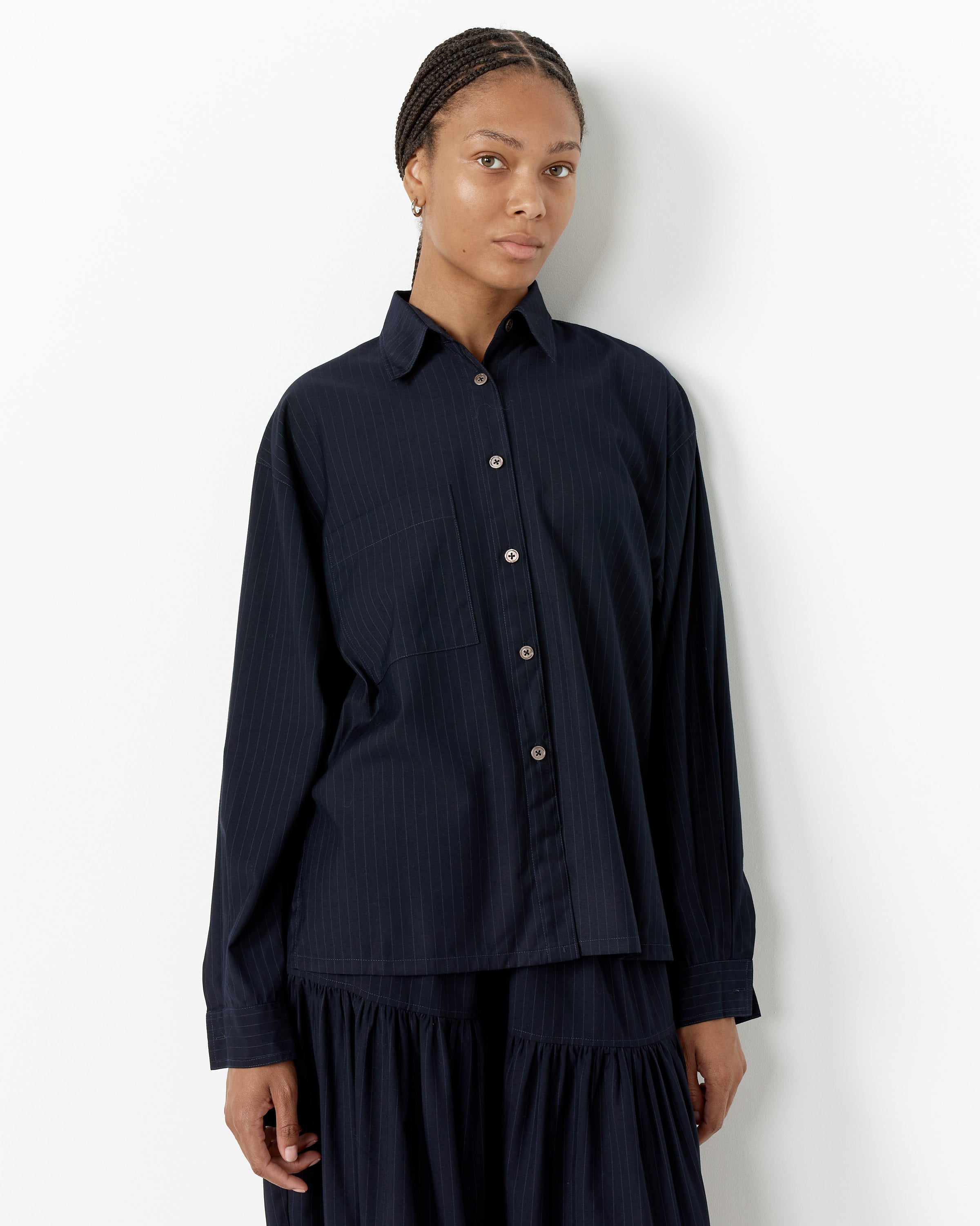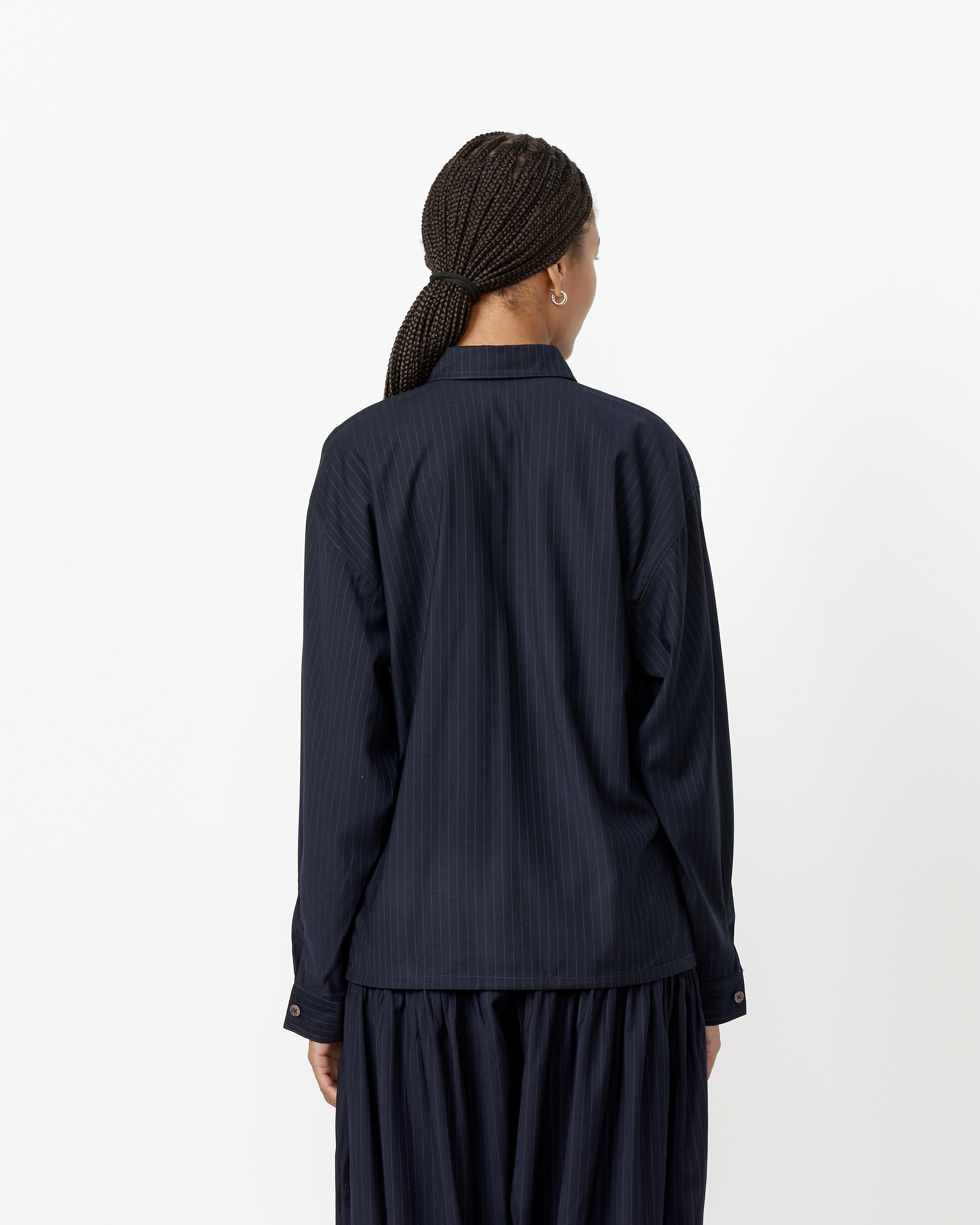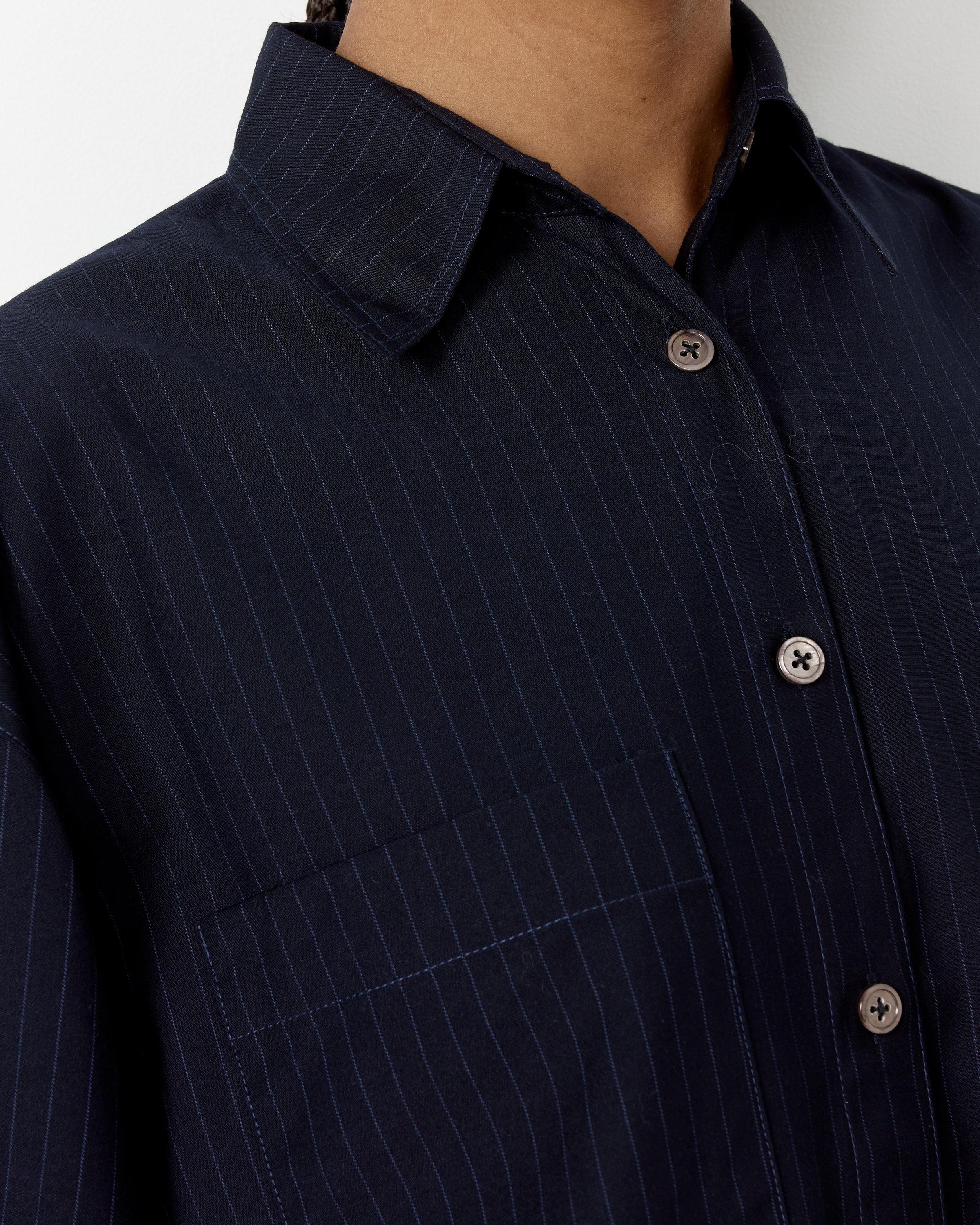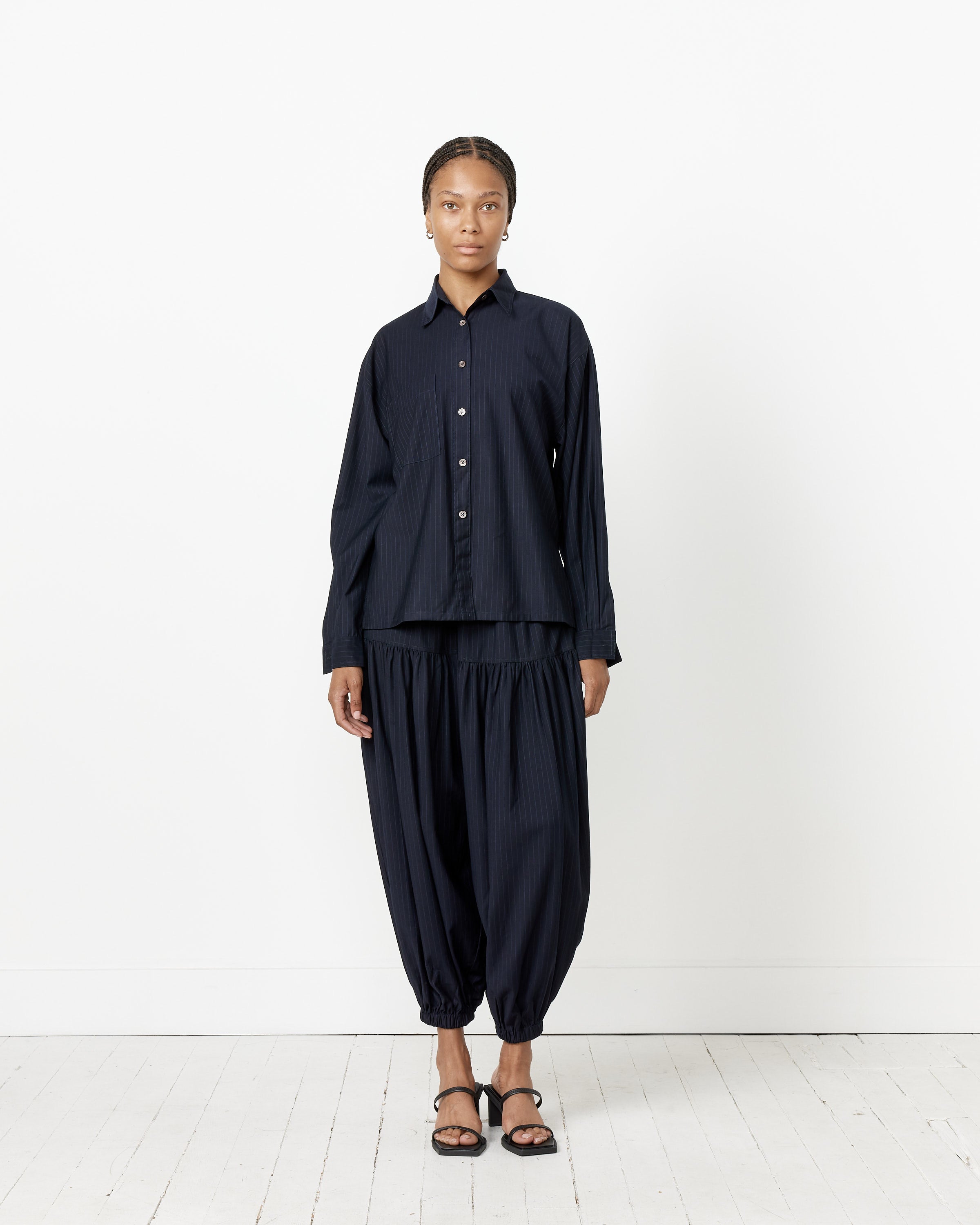 Chelsea Mak's Tomo Top pairs a silk taffeta fabric with a boxy silhouette in a tailor-made shirt that exhibits the refined old-world elegance that is the hallmark of the brand.